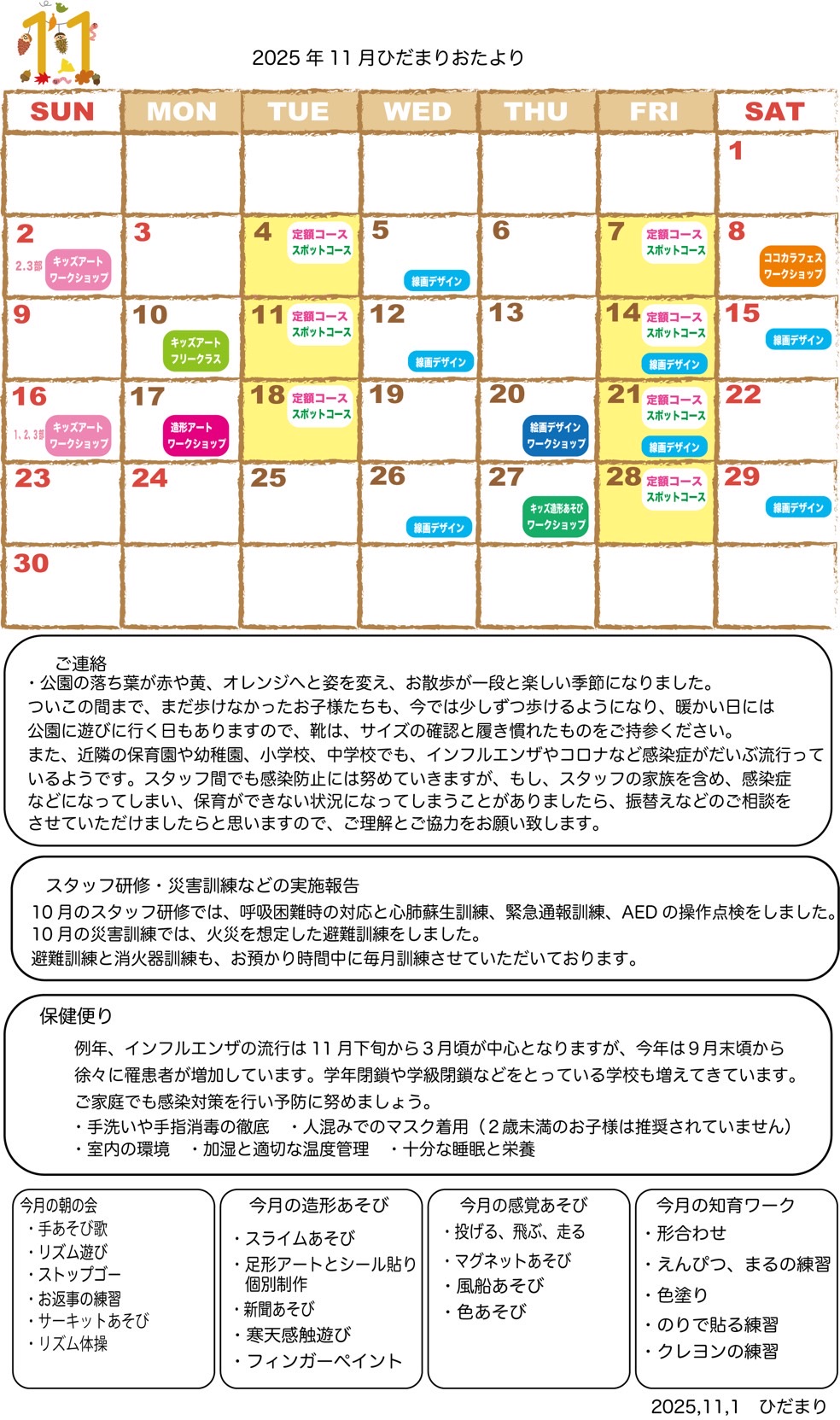 2025年11月のひだまり託児型幼児教室お便り更新しました。