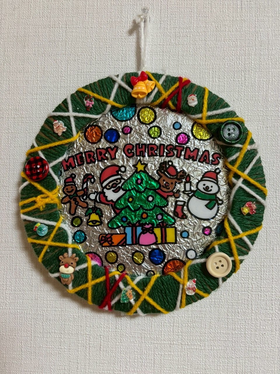 ・クリアシートにイラストをなぞって色を塗って♪リースに毛糸を巻きつけて、いろいろな作業をすることで1つのリースが仕上がります♪