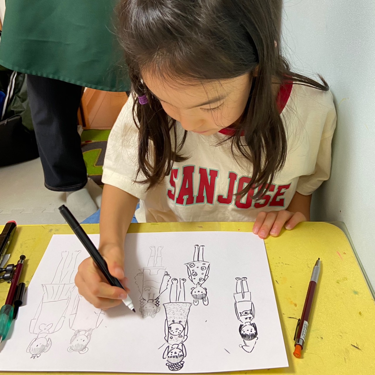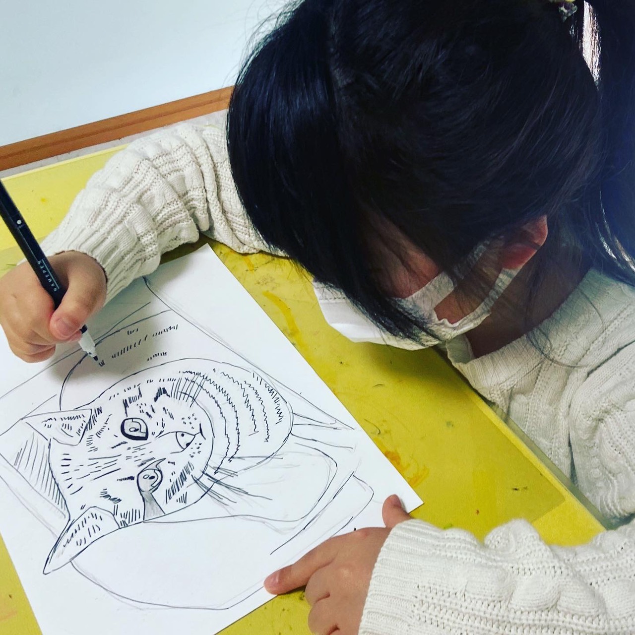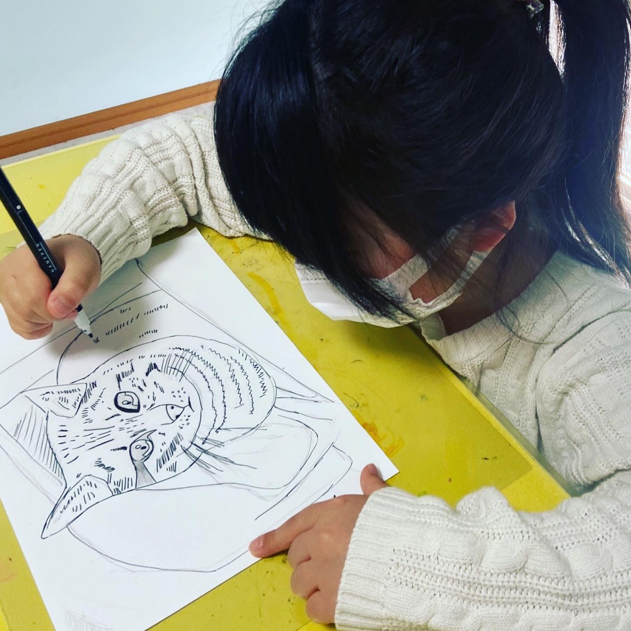 未就学児のお友達たちは、好きなことが何なのか、模索しながら、線画もその中の一つの引き出しとして活動している子も多い中、小学生メンバーは、絵を描きたい!という目的がしっかりある子が多いので、プログラムが変わるたびに、しっかり話を聞いて自分のものにしていく姿が見られます✨