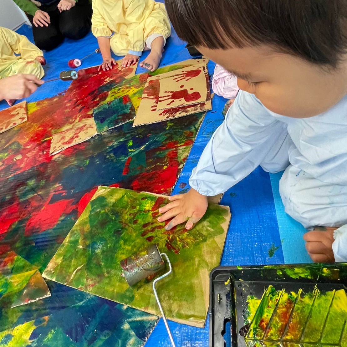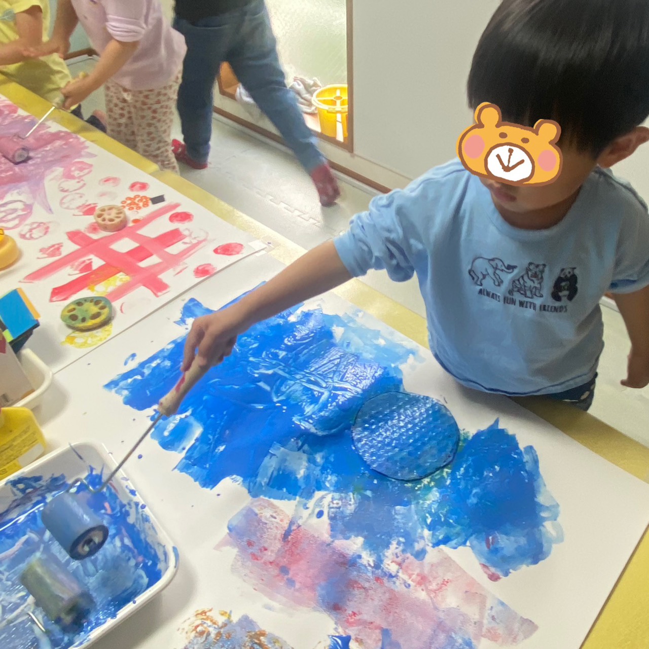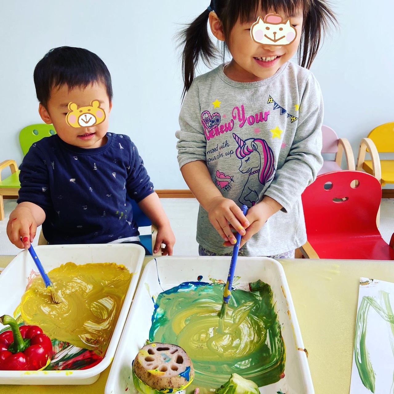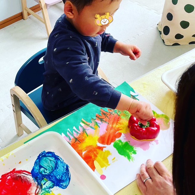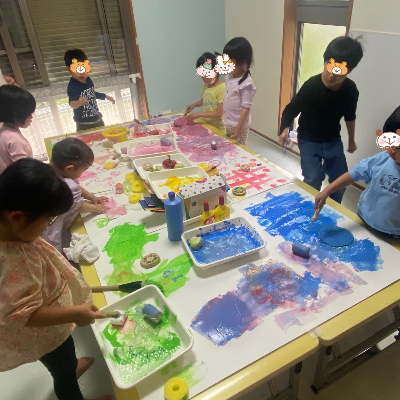 5月の教室では、絵の具や筆、ローラーや野菜の切ったもの、凹凸のある資材、色画用紙などを机の真ん中に置いてみたので。。