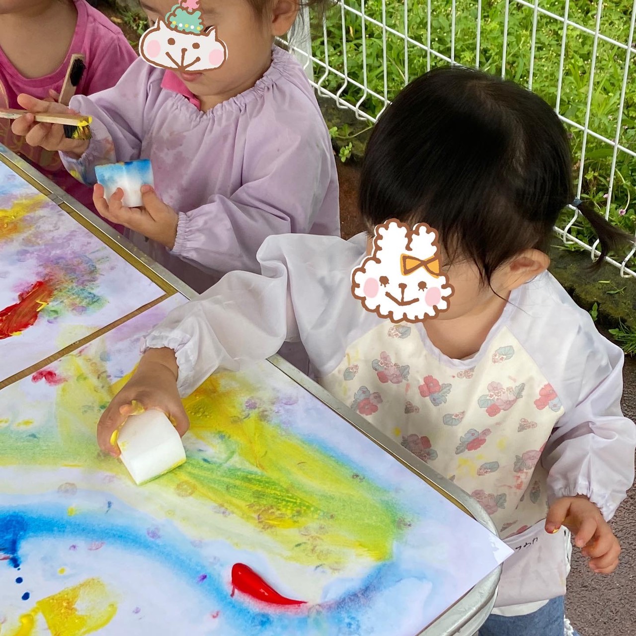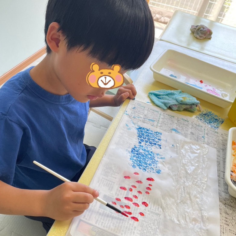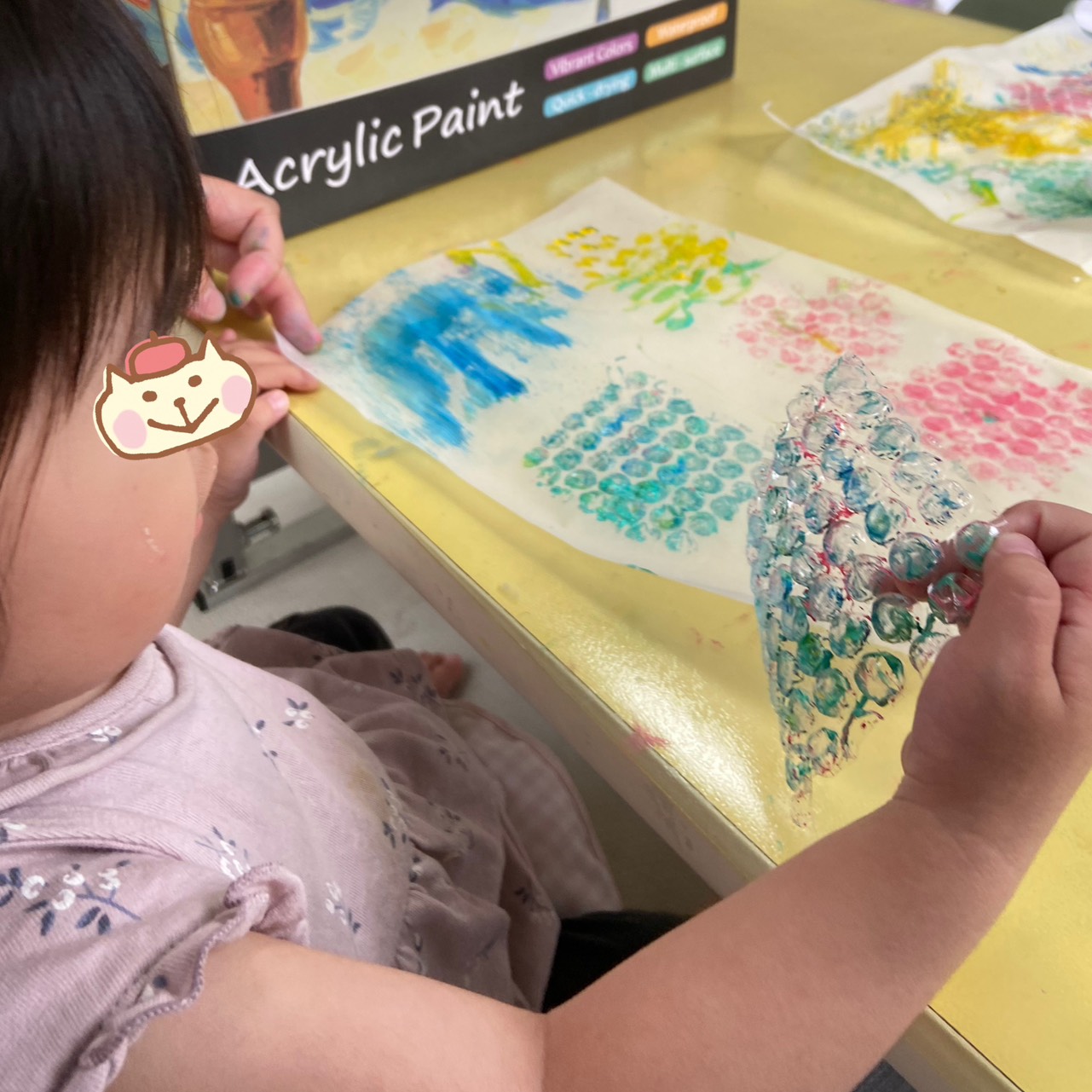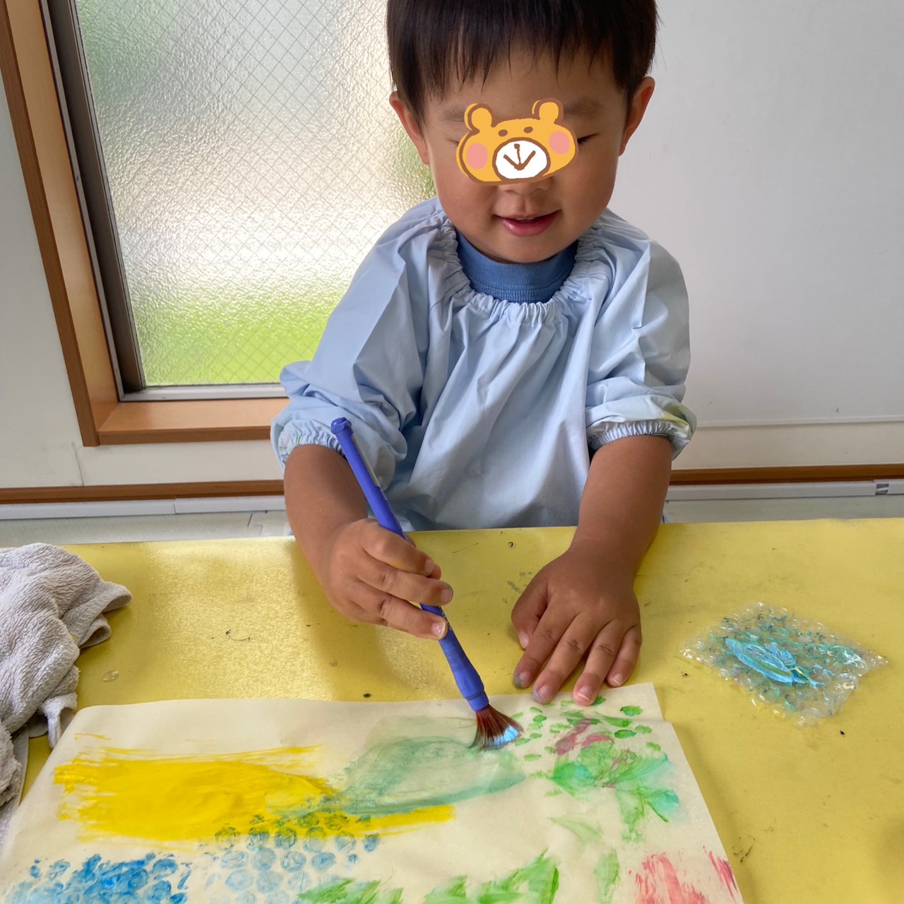 5月の教室では、絵の具や筆、ローラーや野菜の切ったもの、凹凸のある資材、色画用紙などを机の真ん中に置いてみたので。。