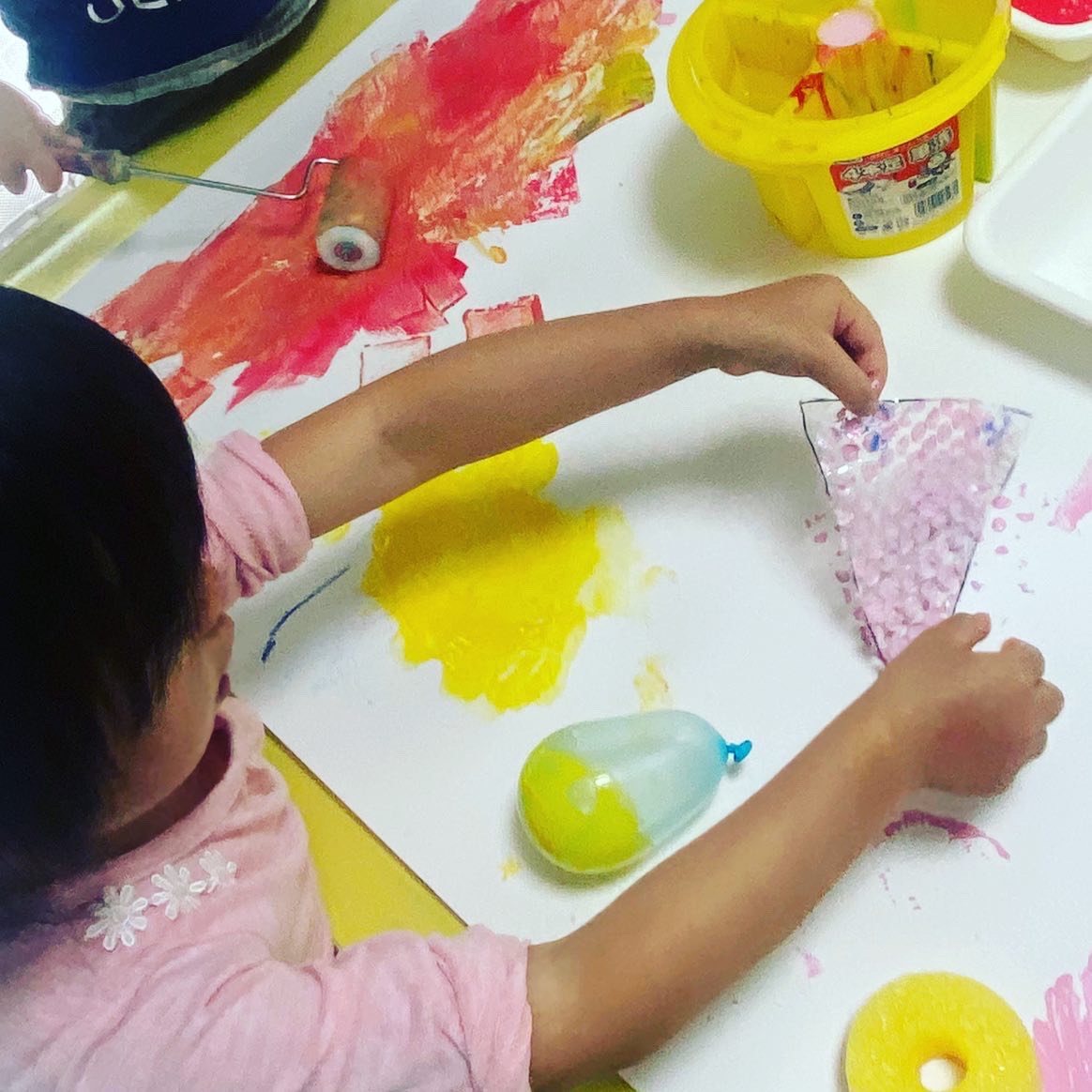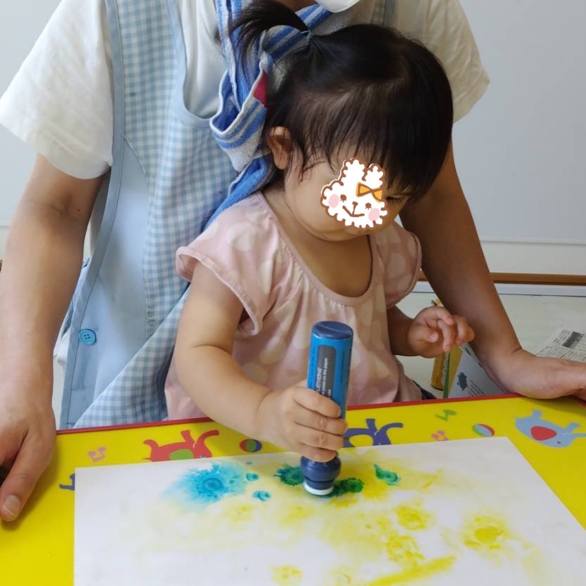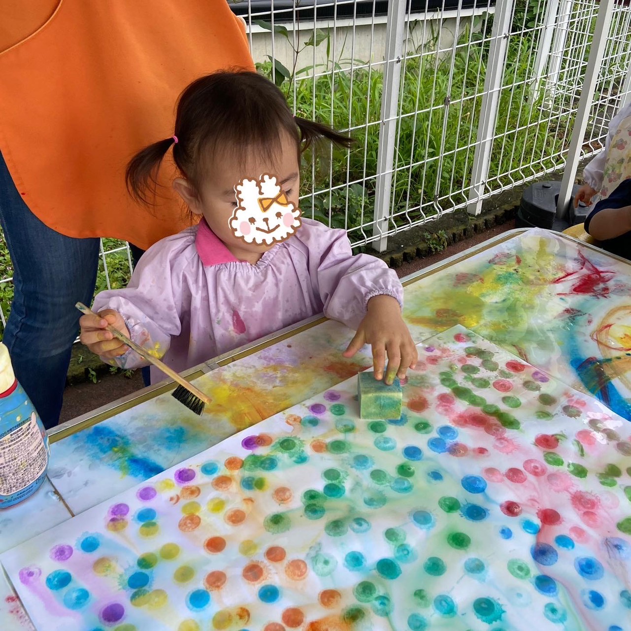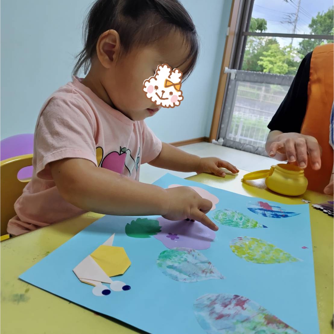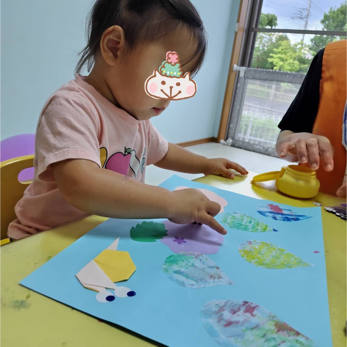5月の教室では、絵の具や筆、ローラーや野菜の切ったもの、凹凸のある資材、色画用紙などを机の真ん中に置いてみたので。。