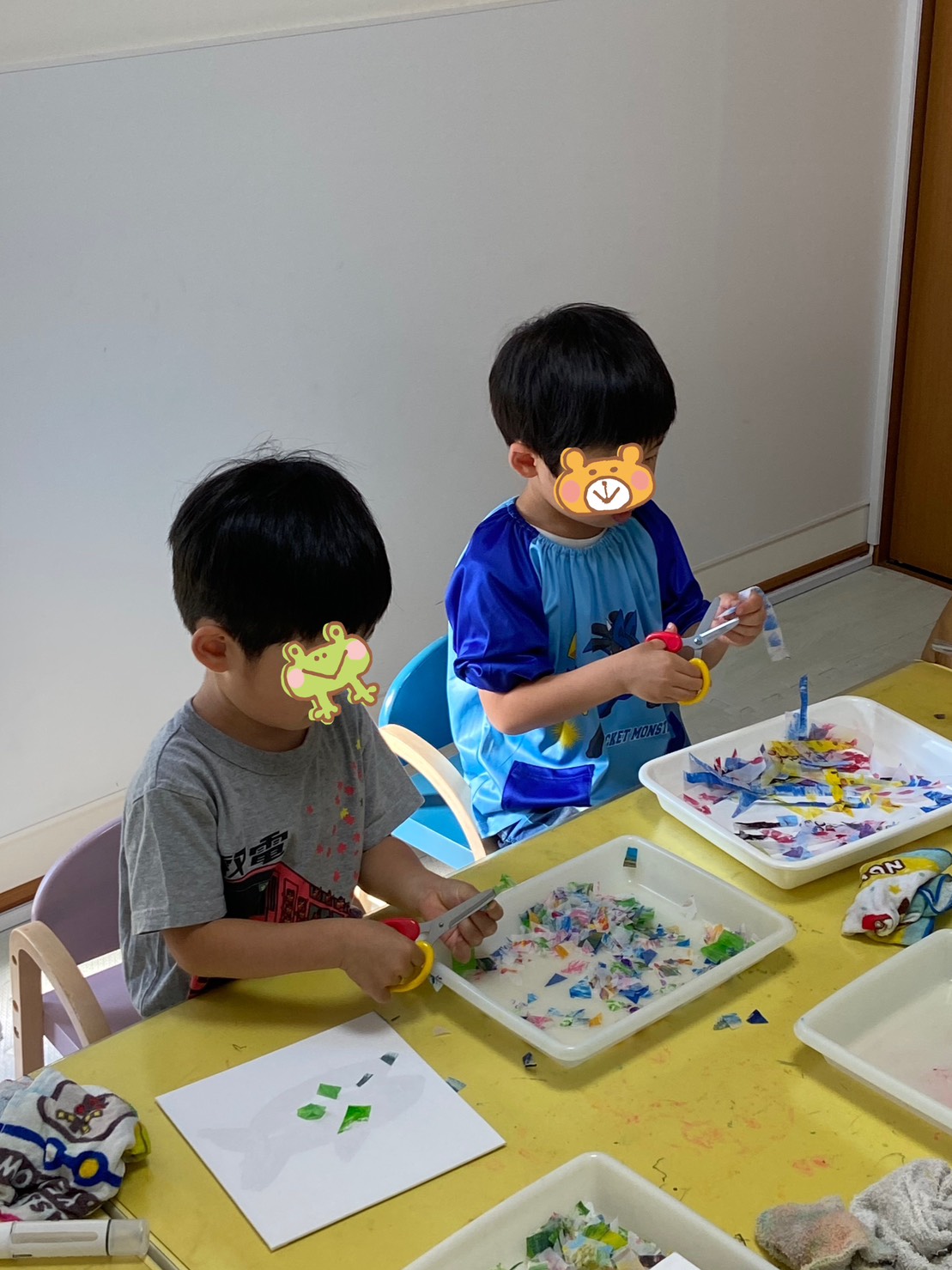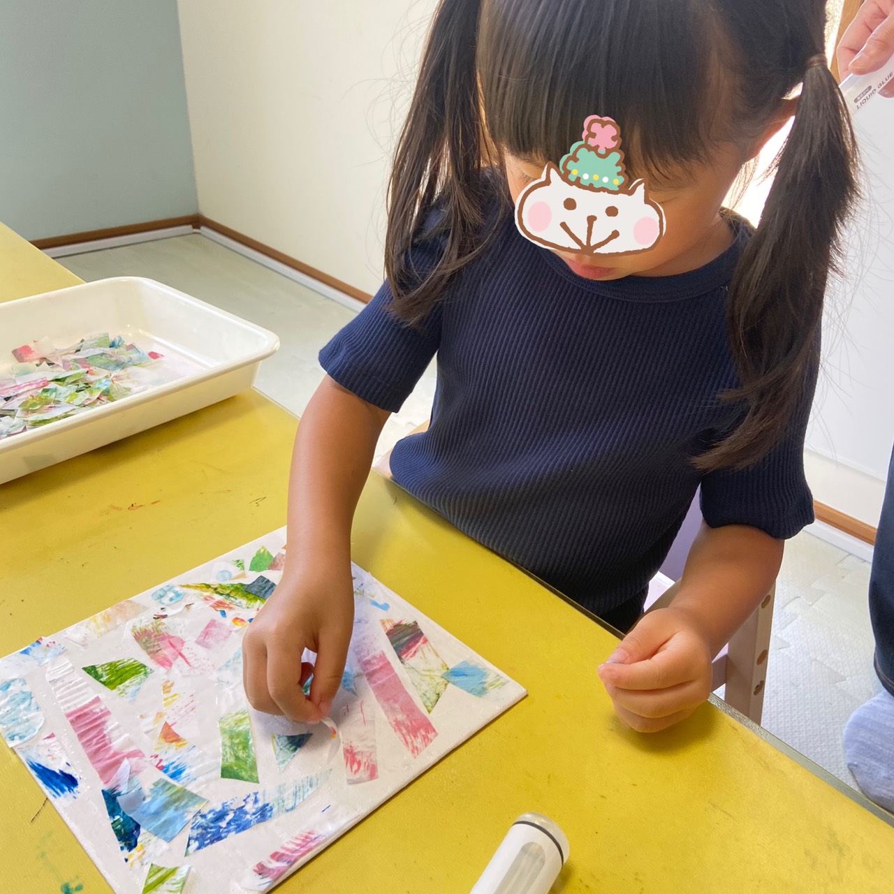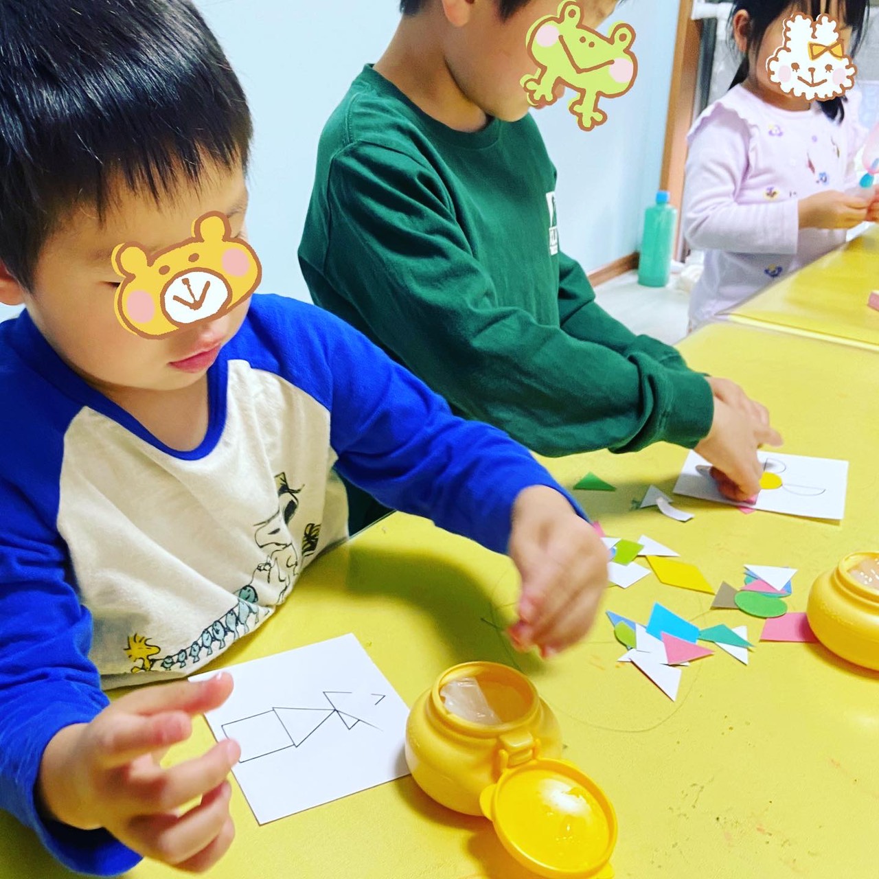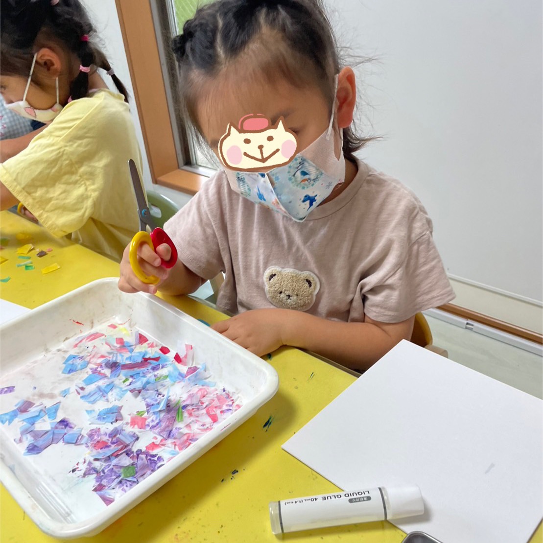 最初に簡単なハサミやのり、線の練習などの基礎的な練習をした後、たくさんの材料を毎月すこし変化をつけて机に並べておいて、その材料の中で、何をしようか?みんなで、考えながら自由に活動できたらと。。子どもたちのアイディアを取り入れながら、幼稚園や学校の後の放課後を楽しんでいただけたらと思っています✨