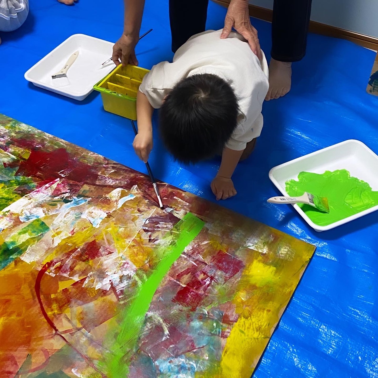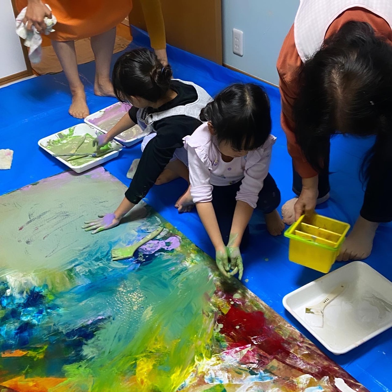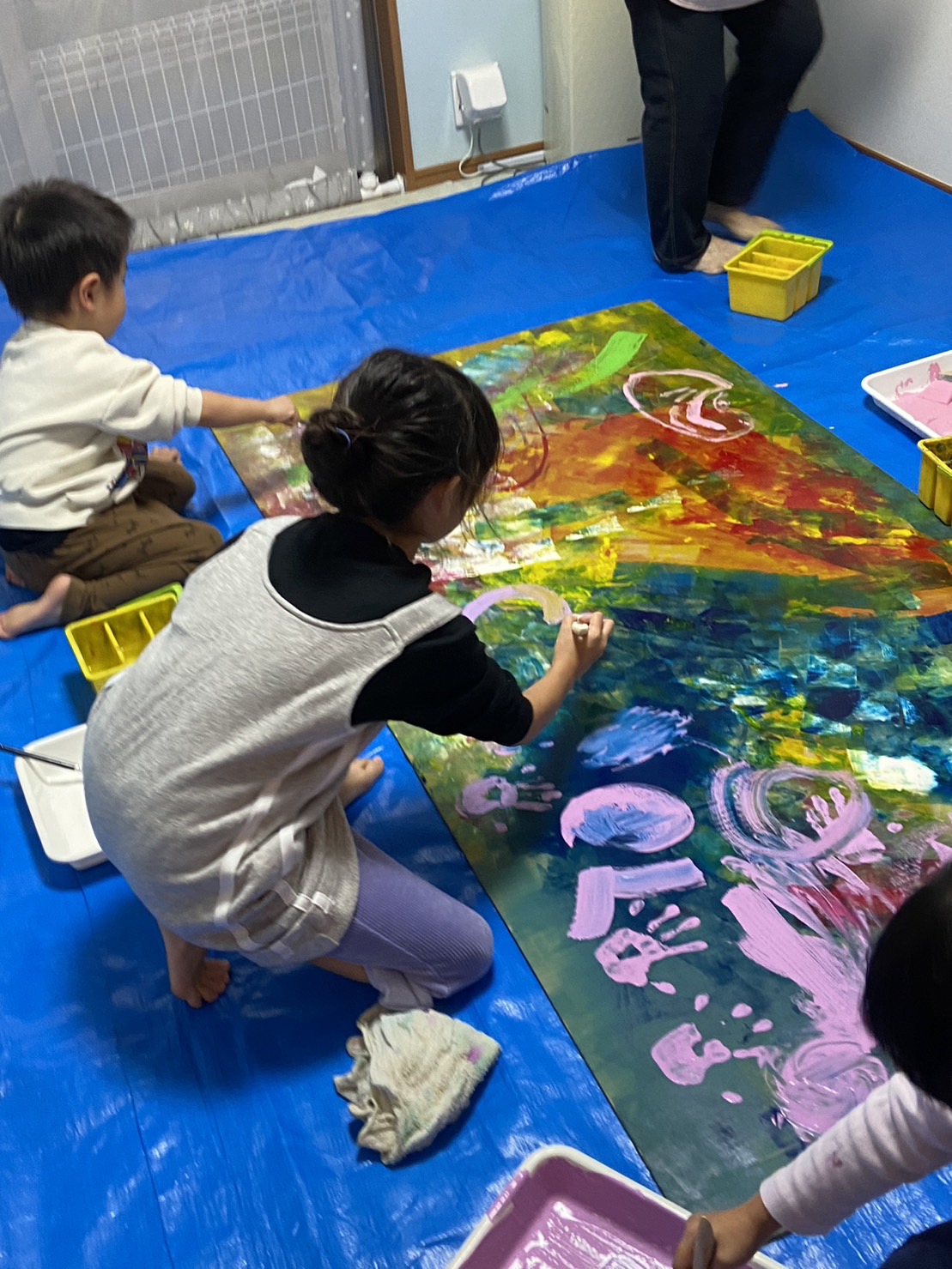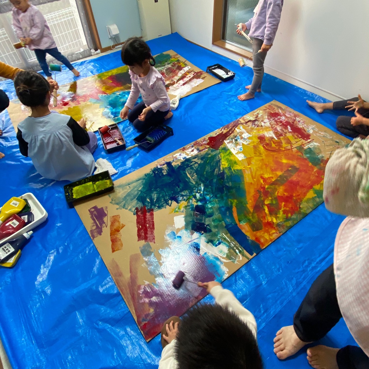 大きな紙の周りにみんなで座って、自分の持ち場を作り、お友達が描いた線をバトンタッチしながら繋げて描いていくという。。小さい子たちにとっては、このリレーがドキドキハラハラするようで、わちゃわちゃと盛り上がりました✨