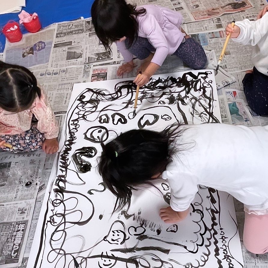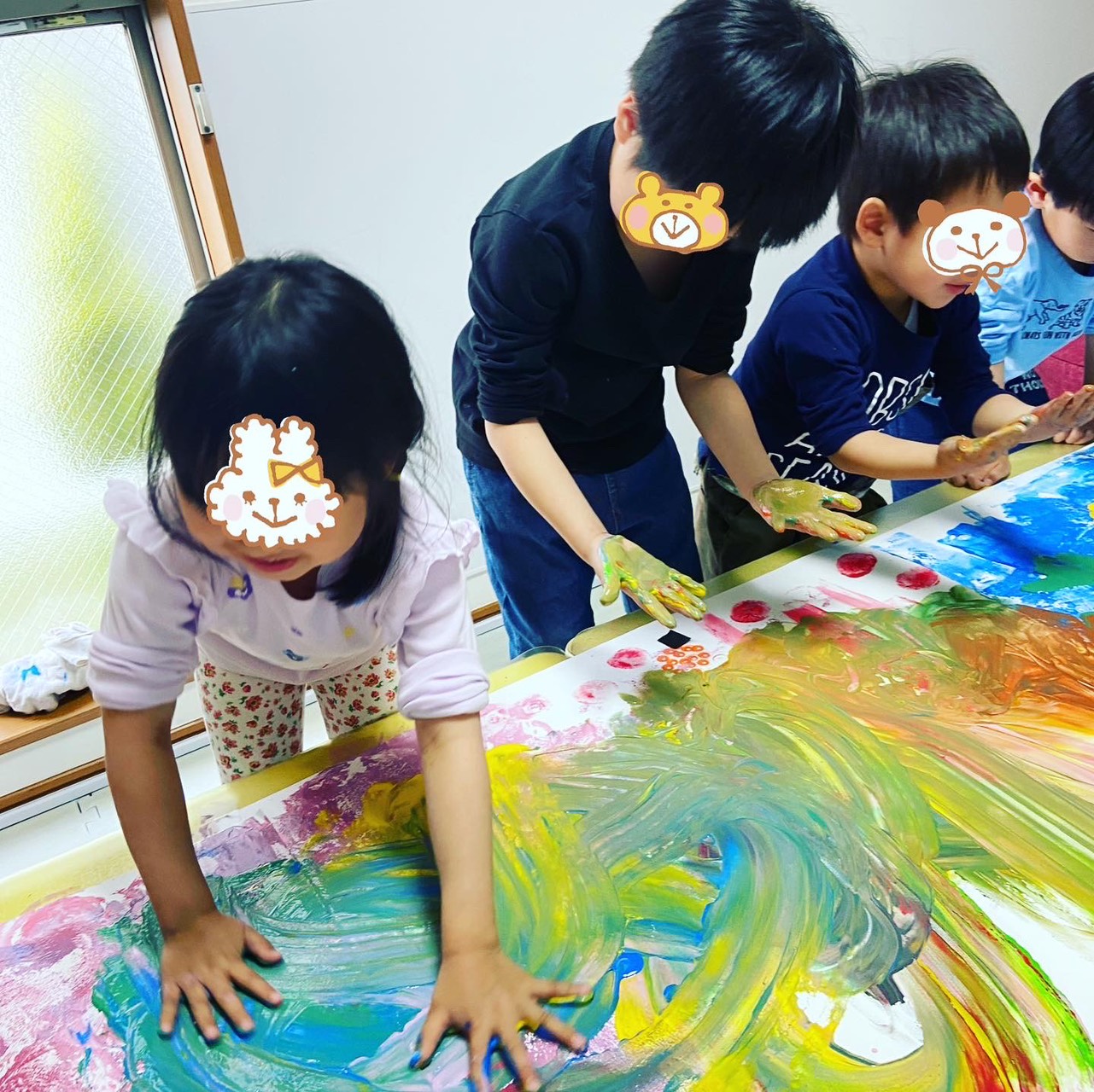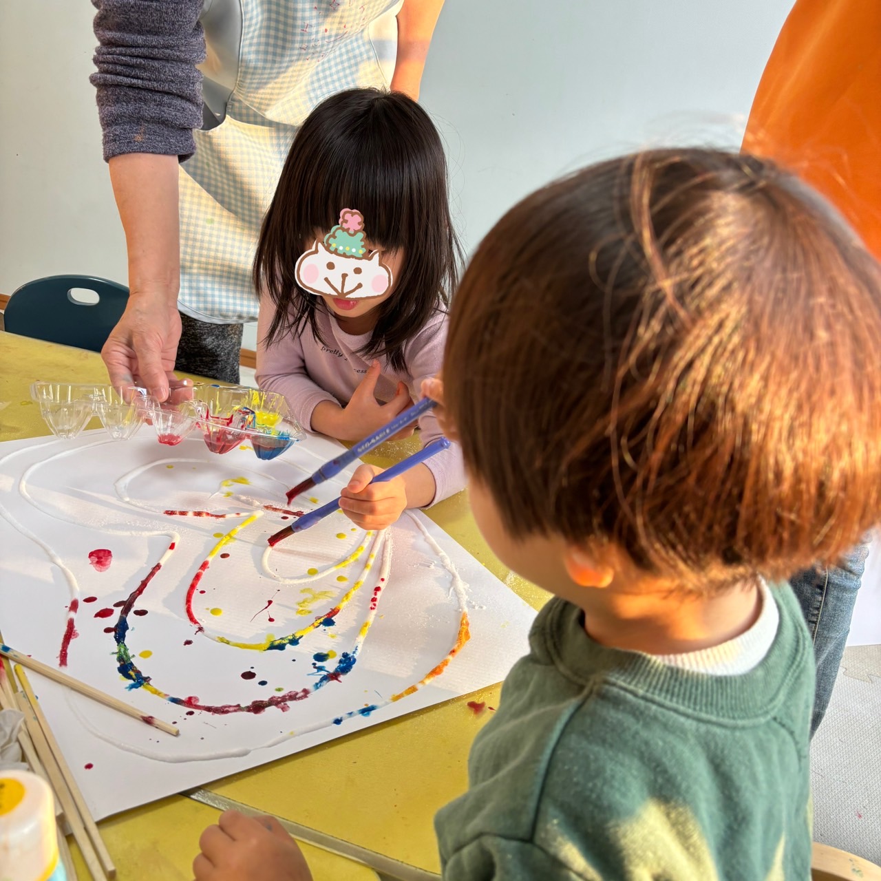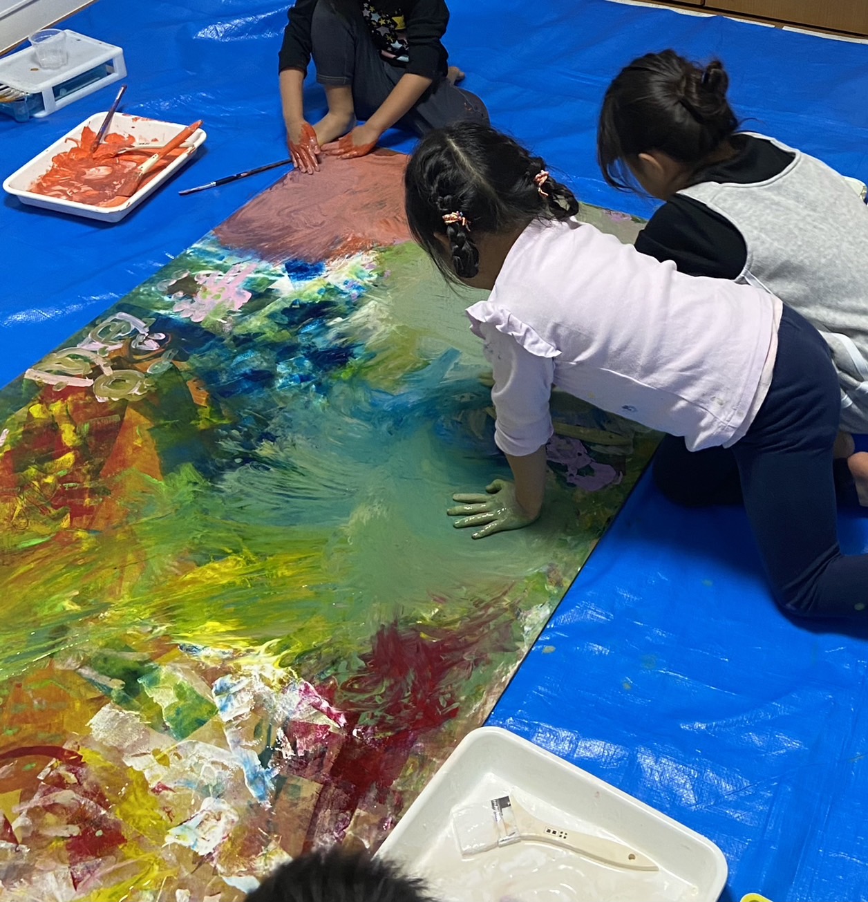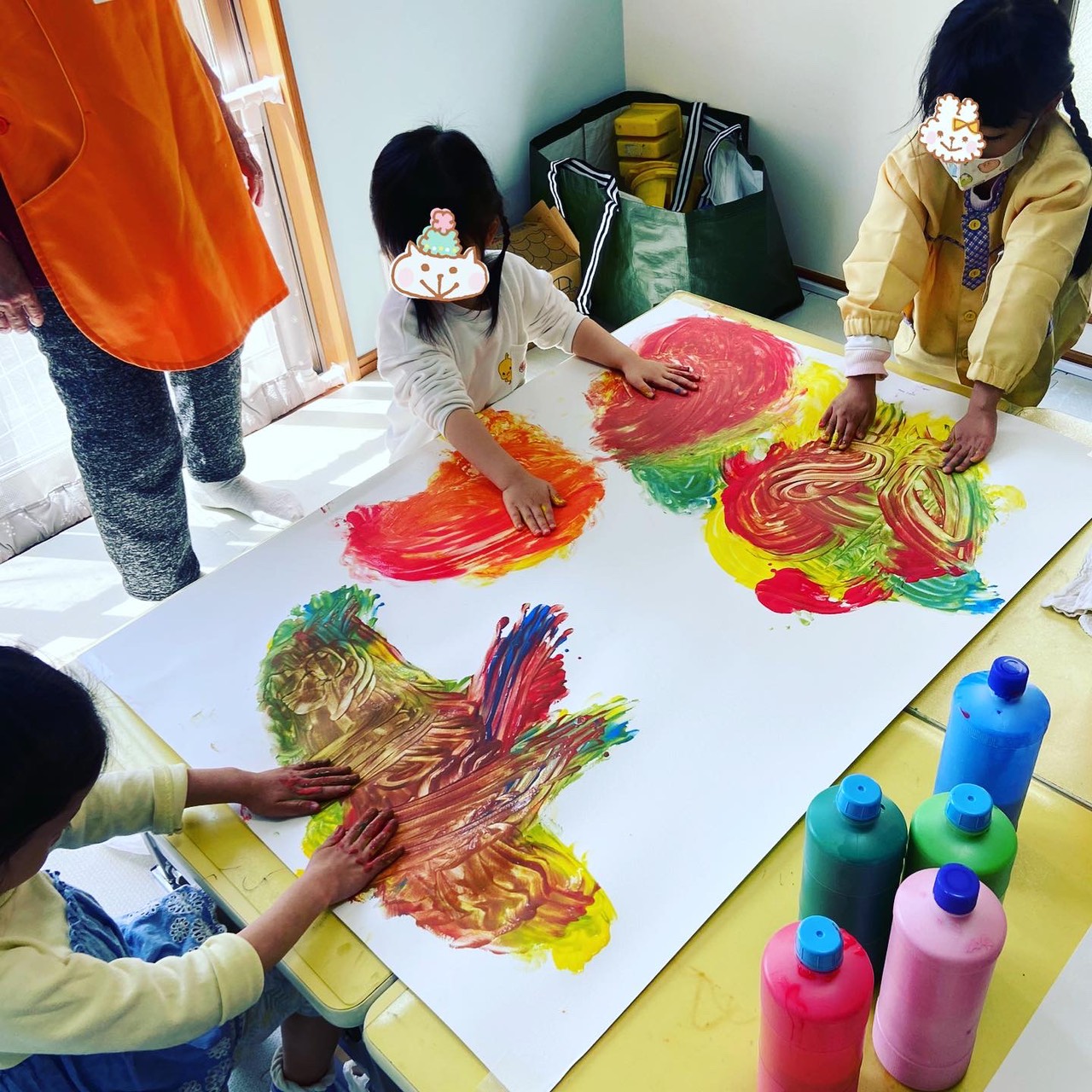 大きな紙の周りにみんなで座って、自分の持ち場を作り、お友達が描いた線をバトンタッチしながら繋げて描いていくという。。小さい子たちにとっては、このリレーがドキドキハラハラするようで、わちゃわちゃと盛り上がりました✨