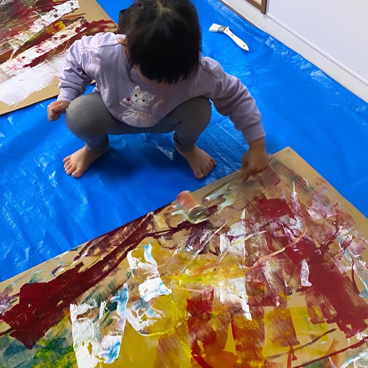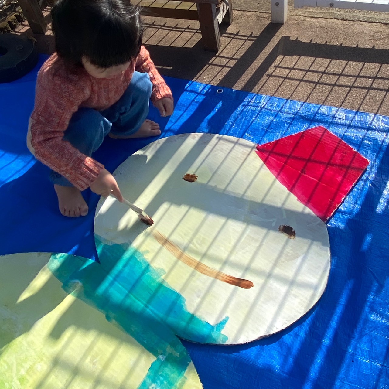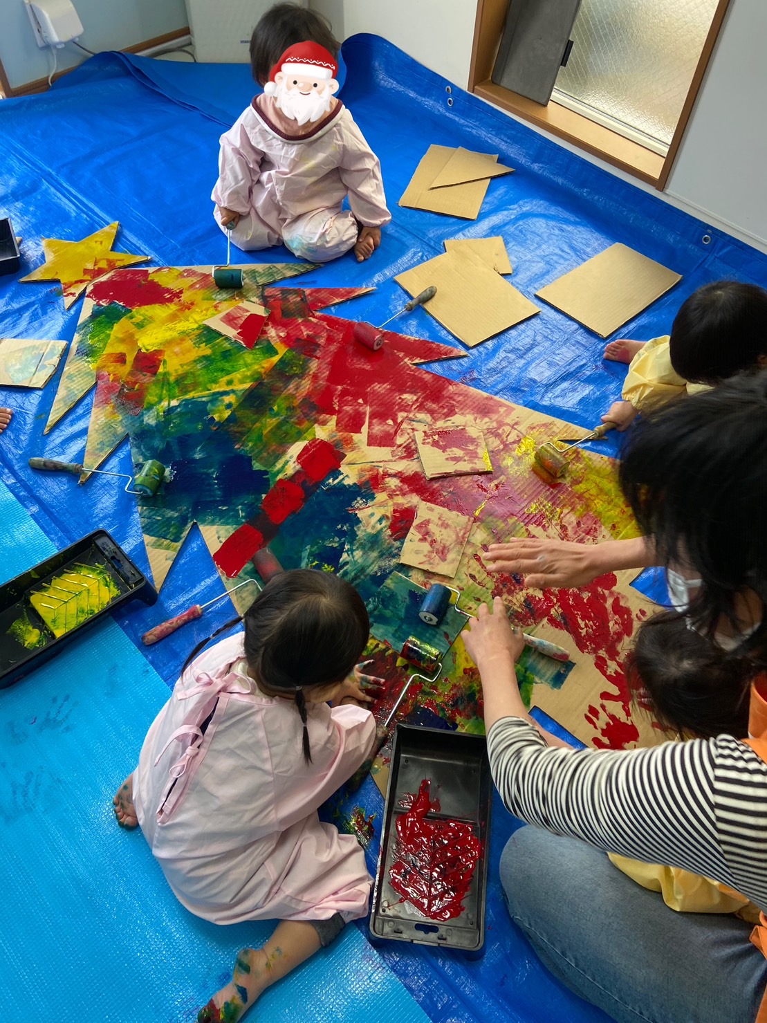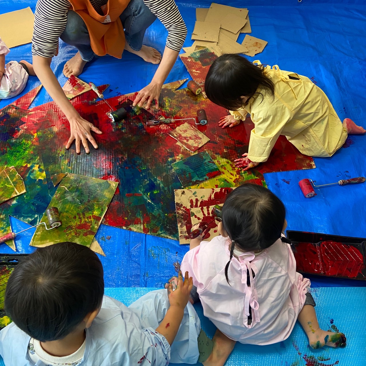 大きな紙の周りにみんなで座って、自分の持ち場を作り、お友達が描いた線をバトンタッチしながら繋げて描いていくという。。小さい子たちにとっては、このリレーがドキドキハラハラするようで、わちゃわちゃと盛り上がりました✨