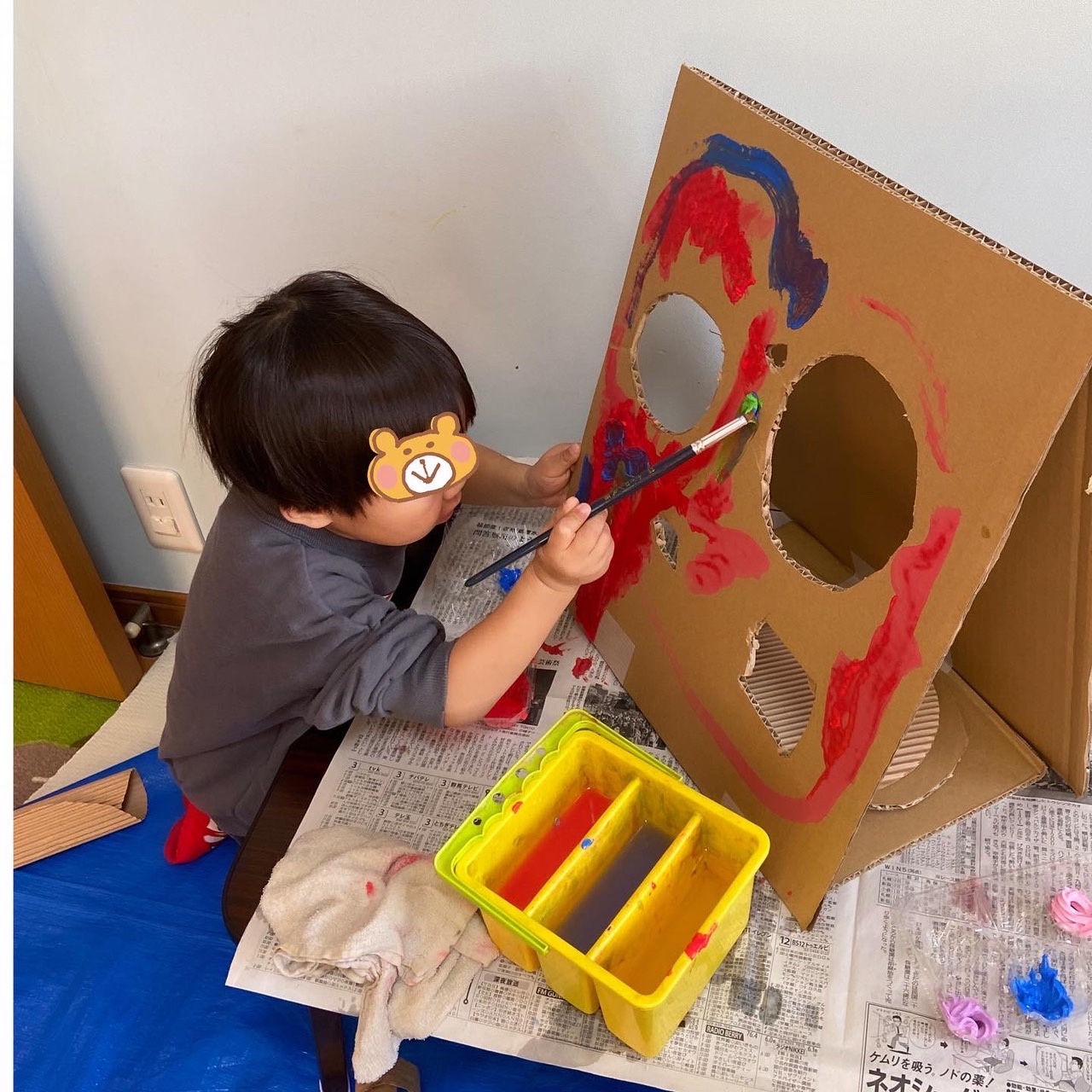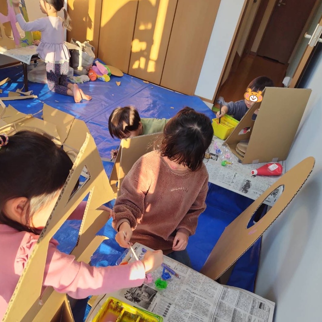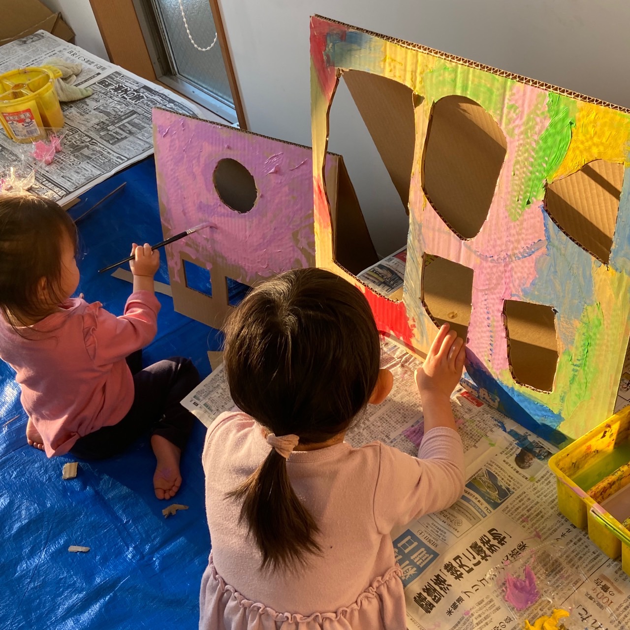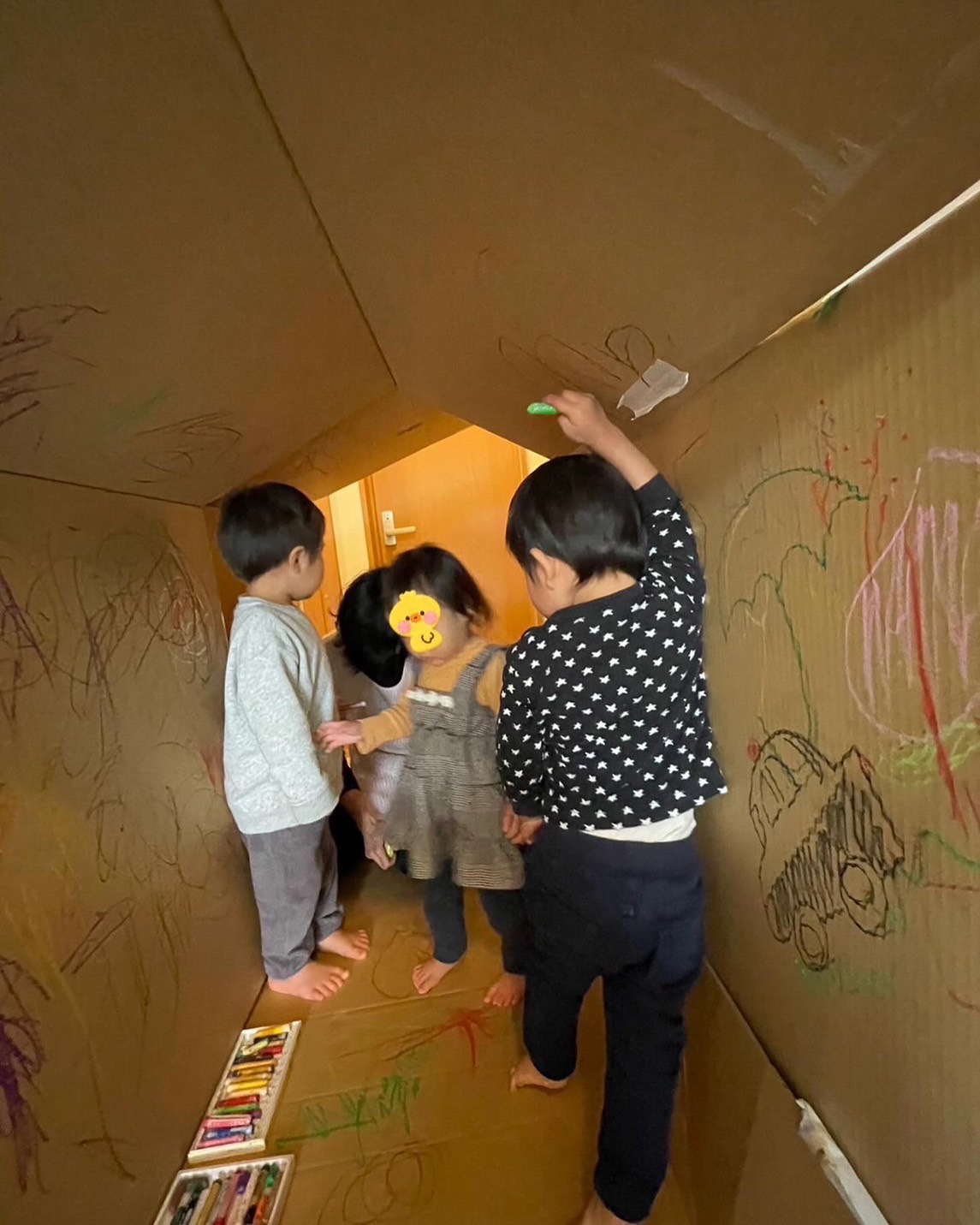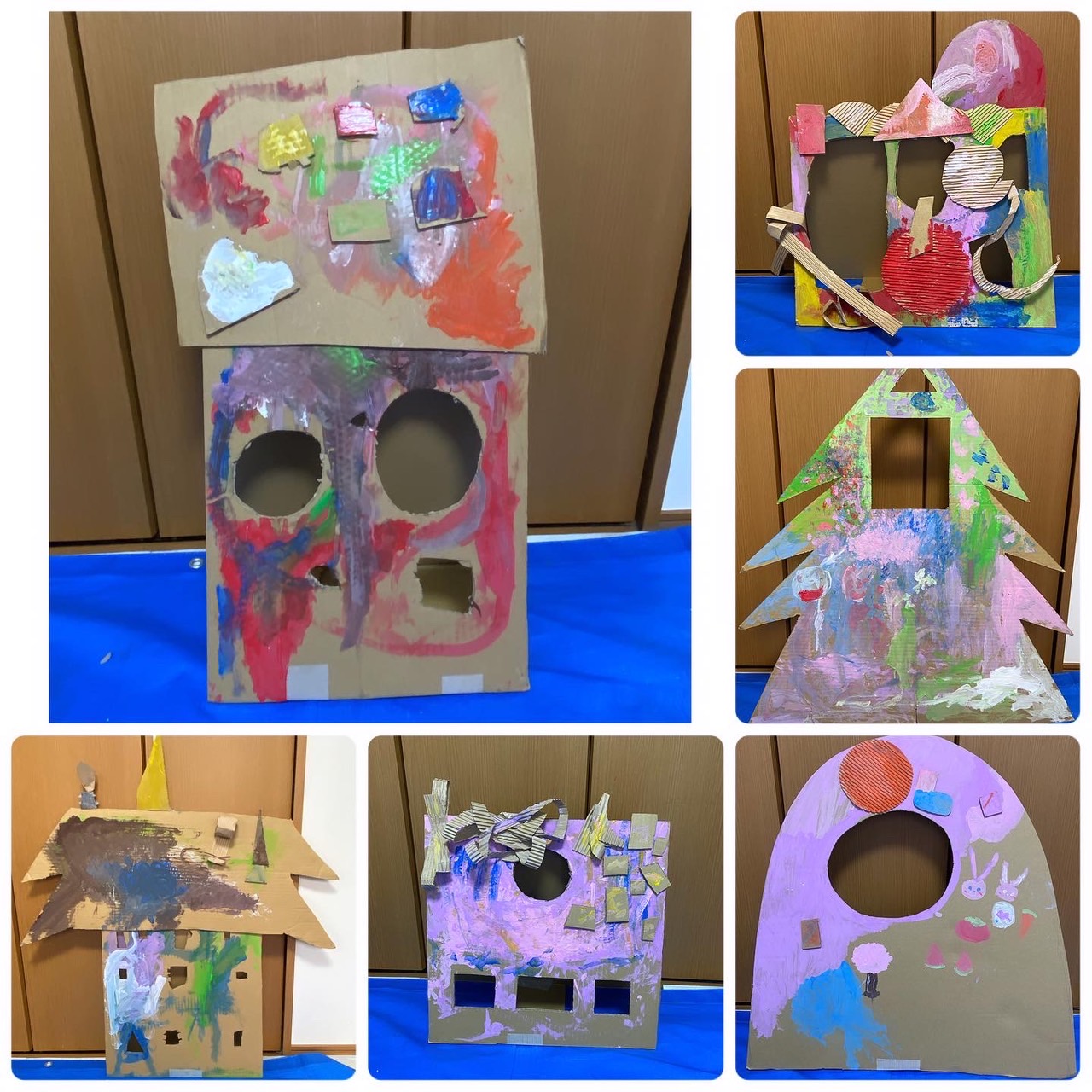 今回はダンボールに思い思いの窓を開けて、お家を作りました✨