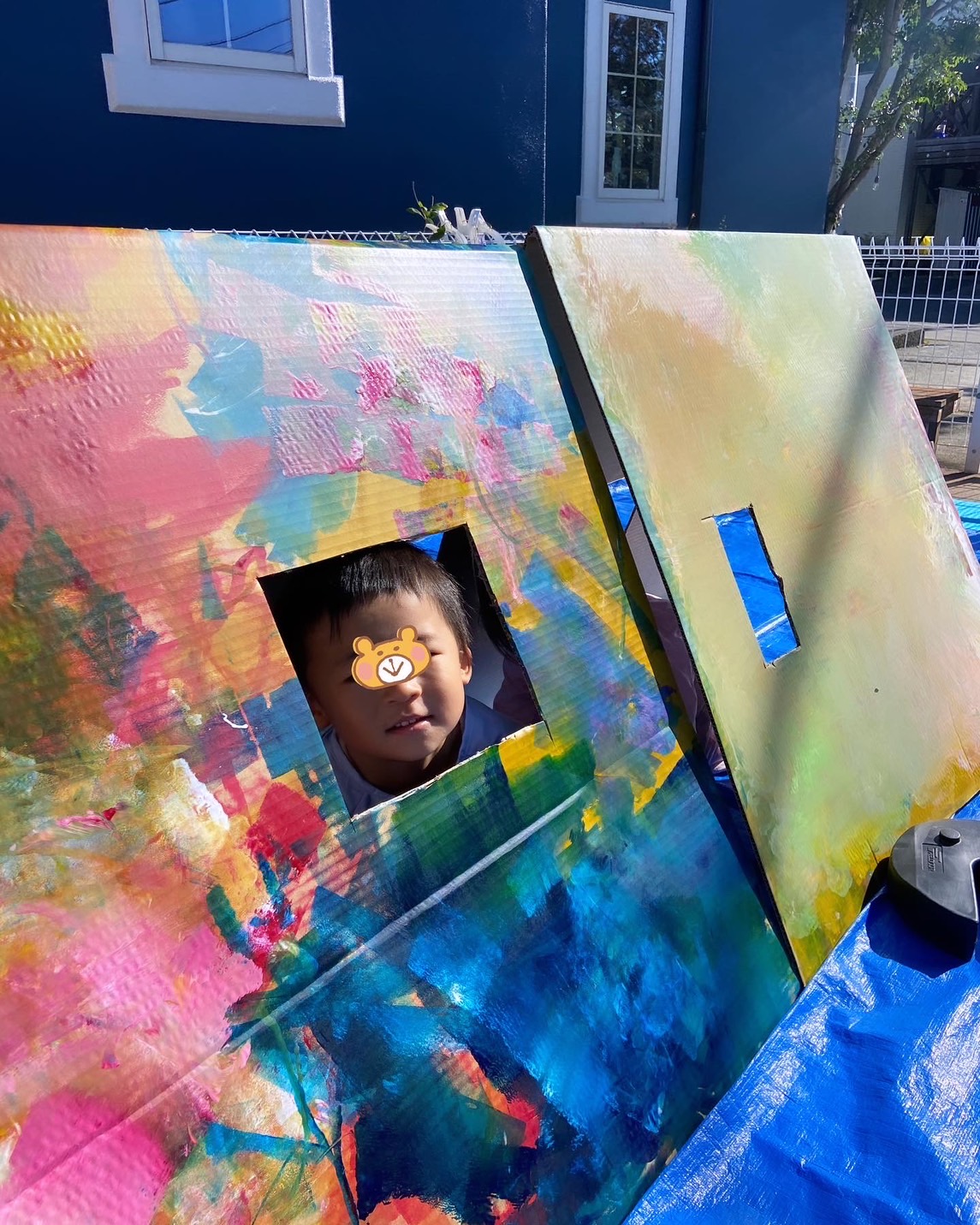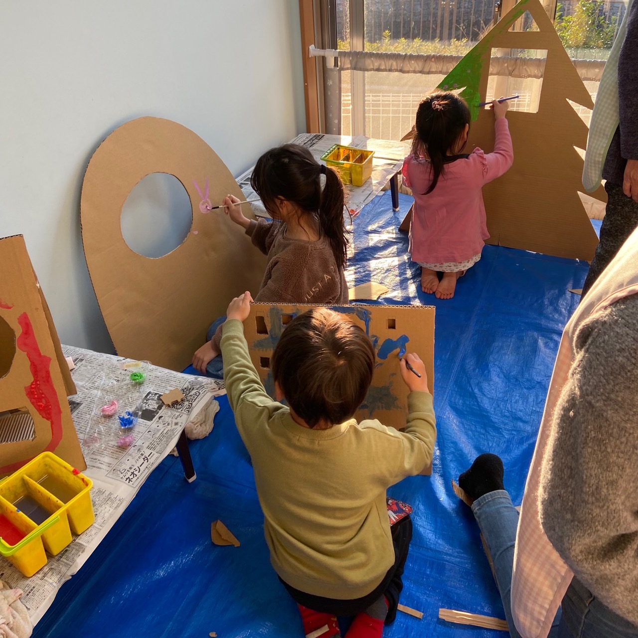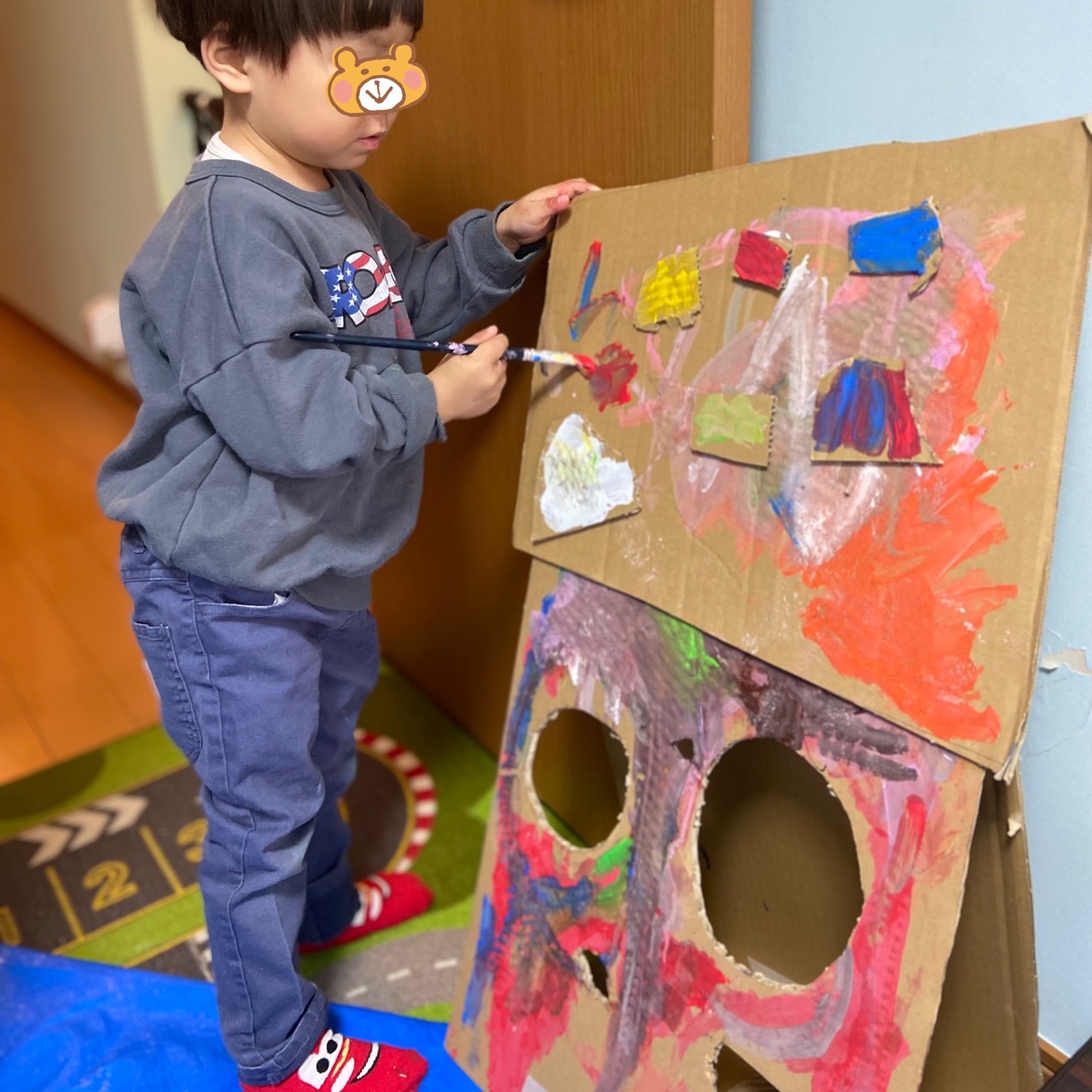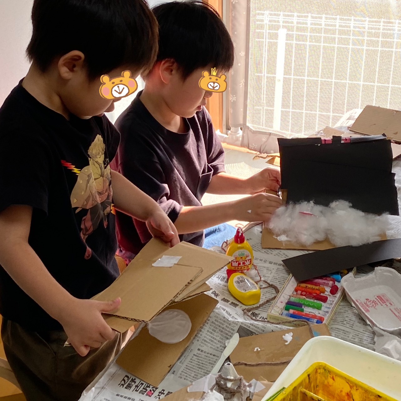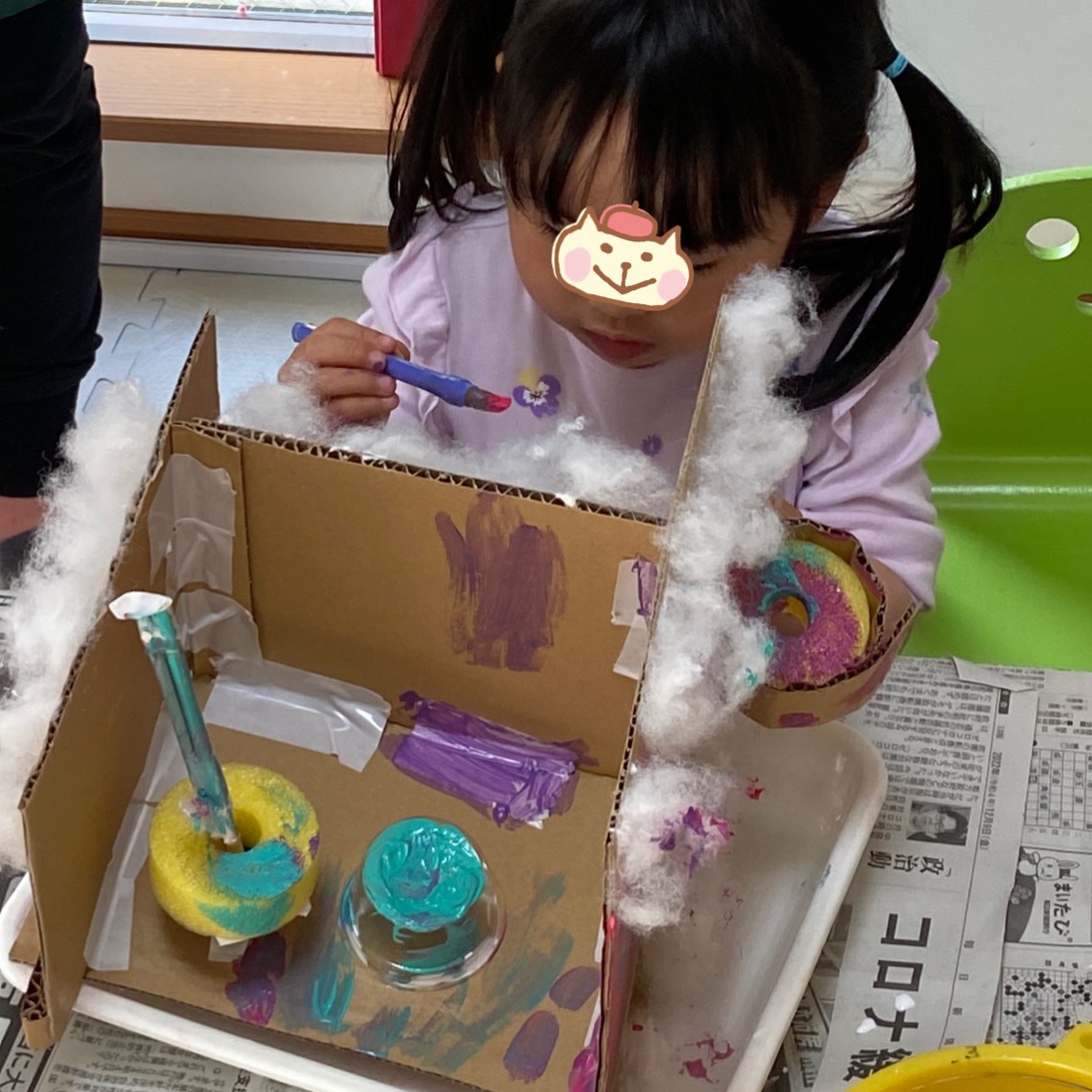 今回はダンボールに思い思いの窓を開けて、お家を作りました✨