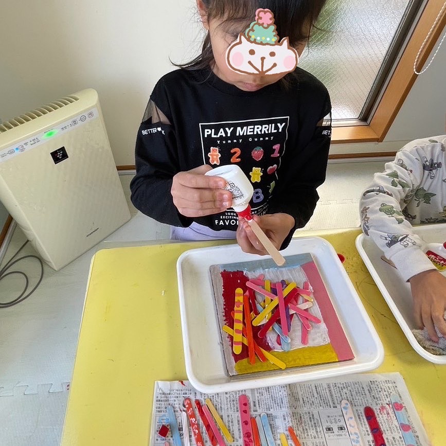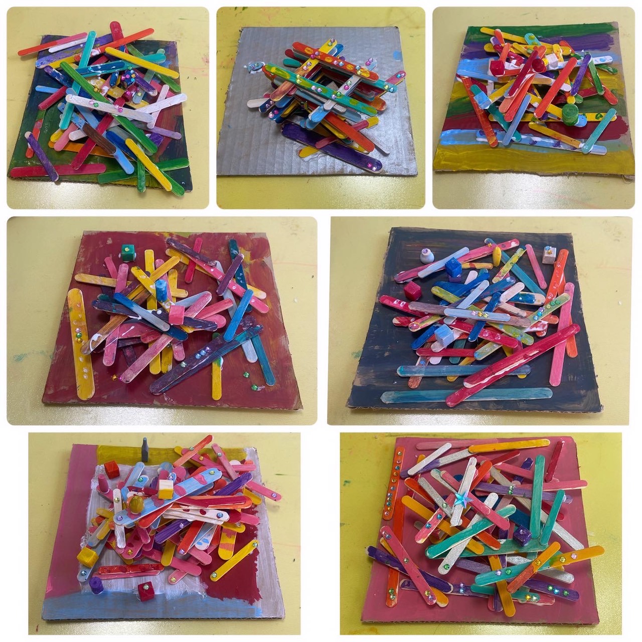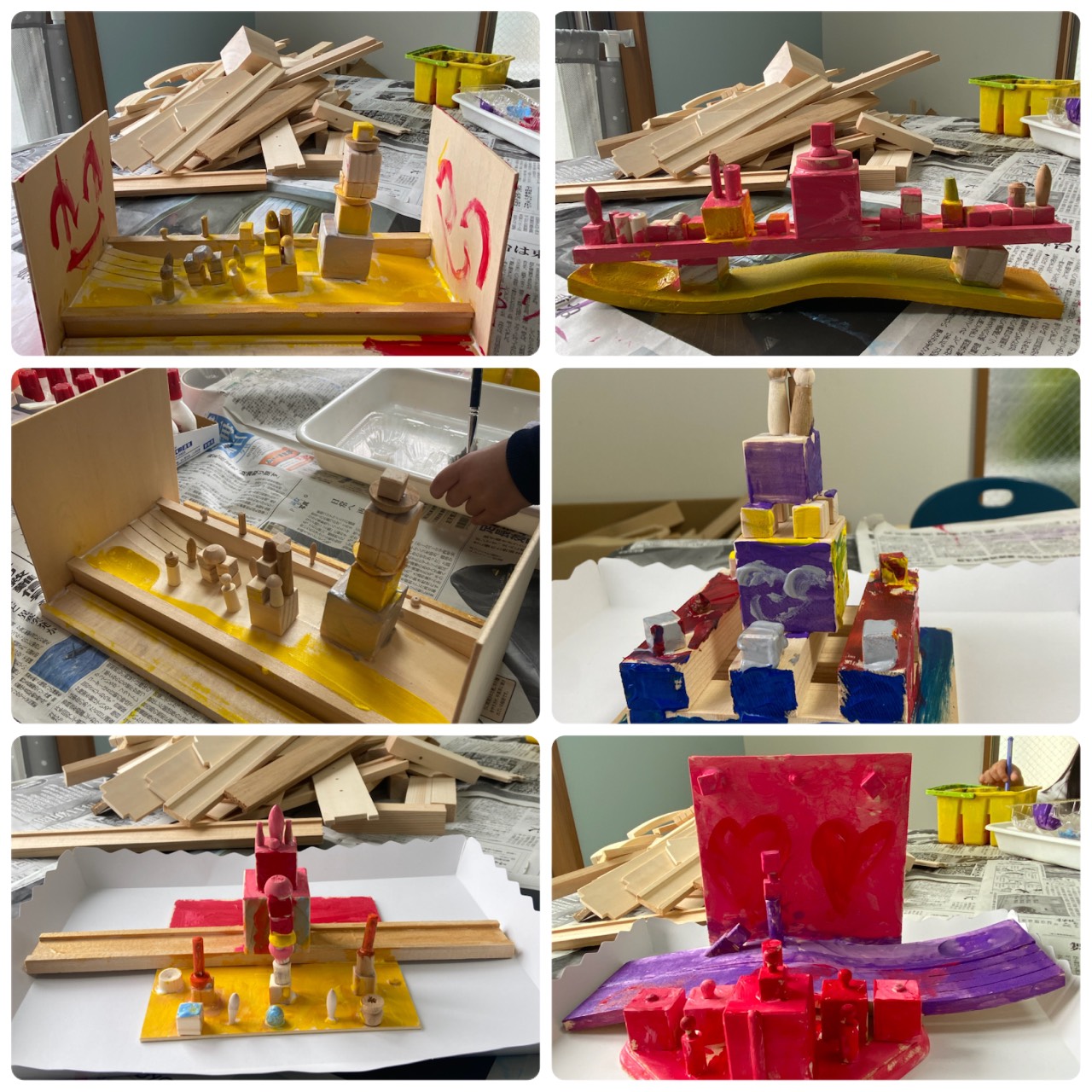 ダンボールやスティックに色や模様を塗って、ボンドで重ねて立体物を作りました✨