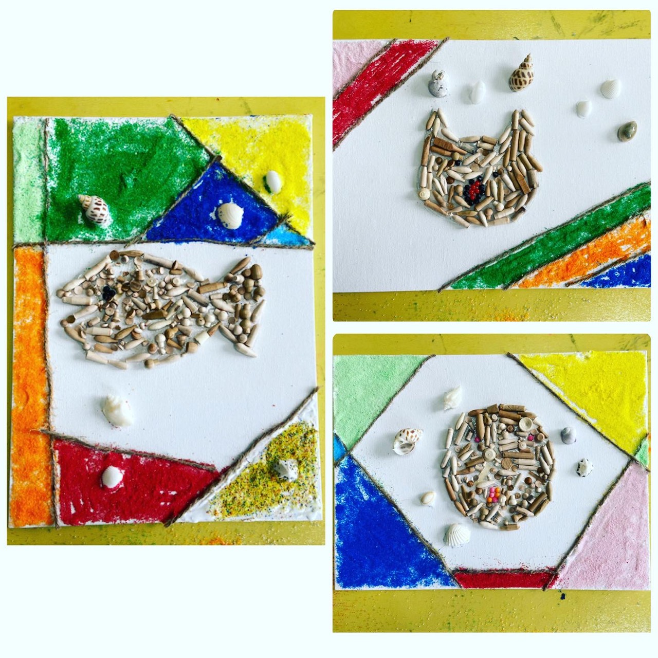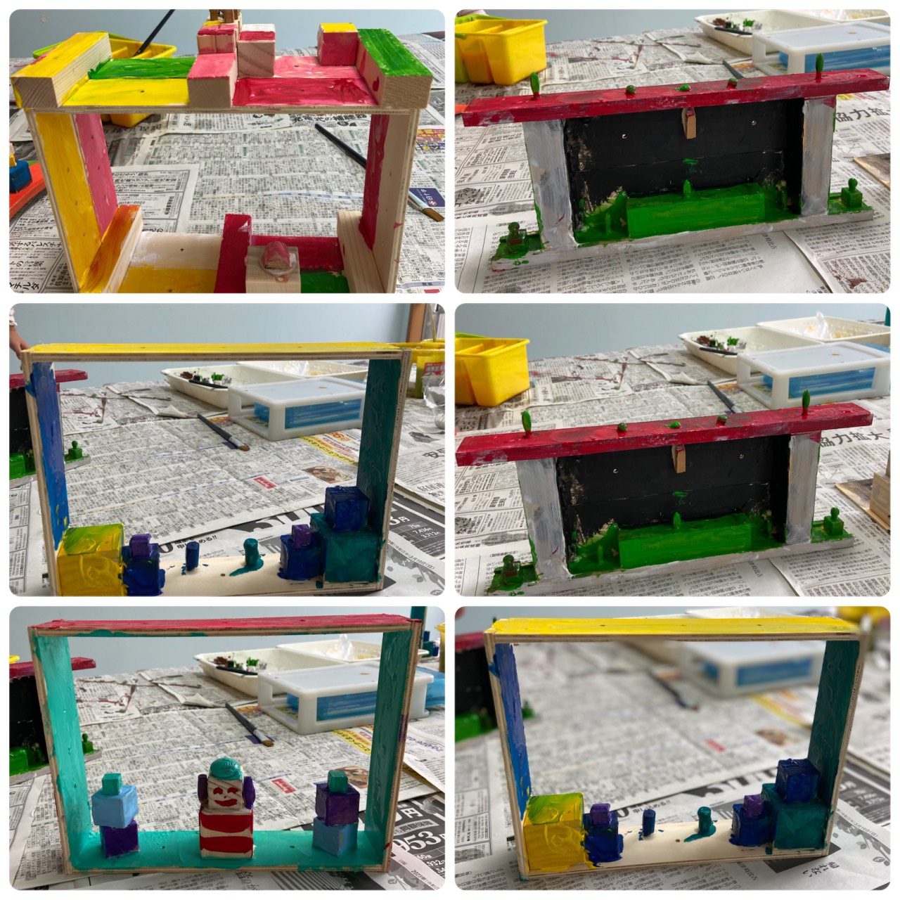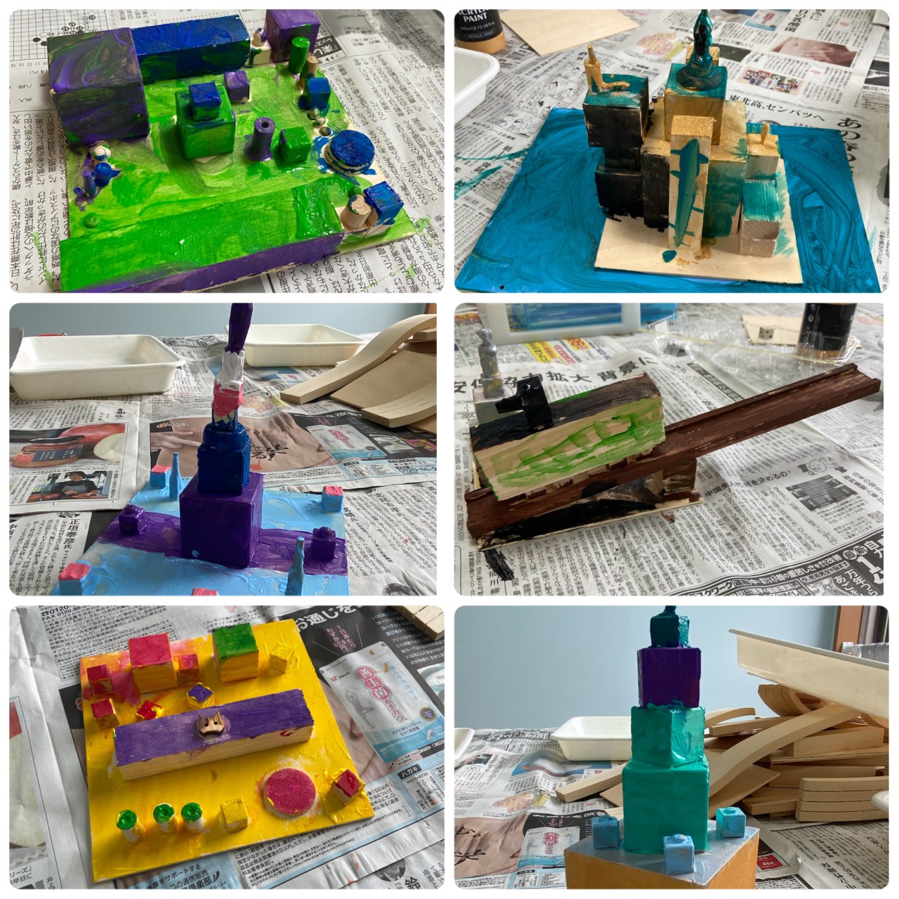 ダンボールやスティックに色や模様を塗って、ボンドで重ねて立体物を作りました✨