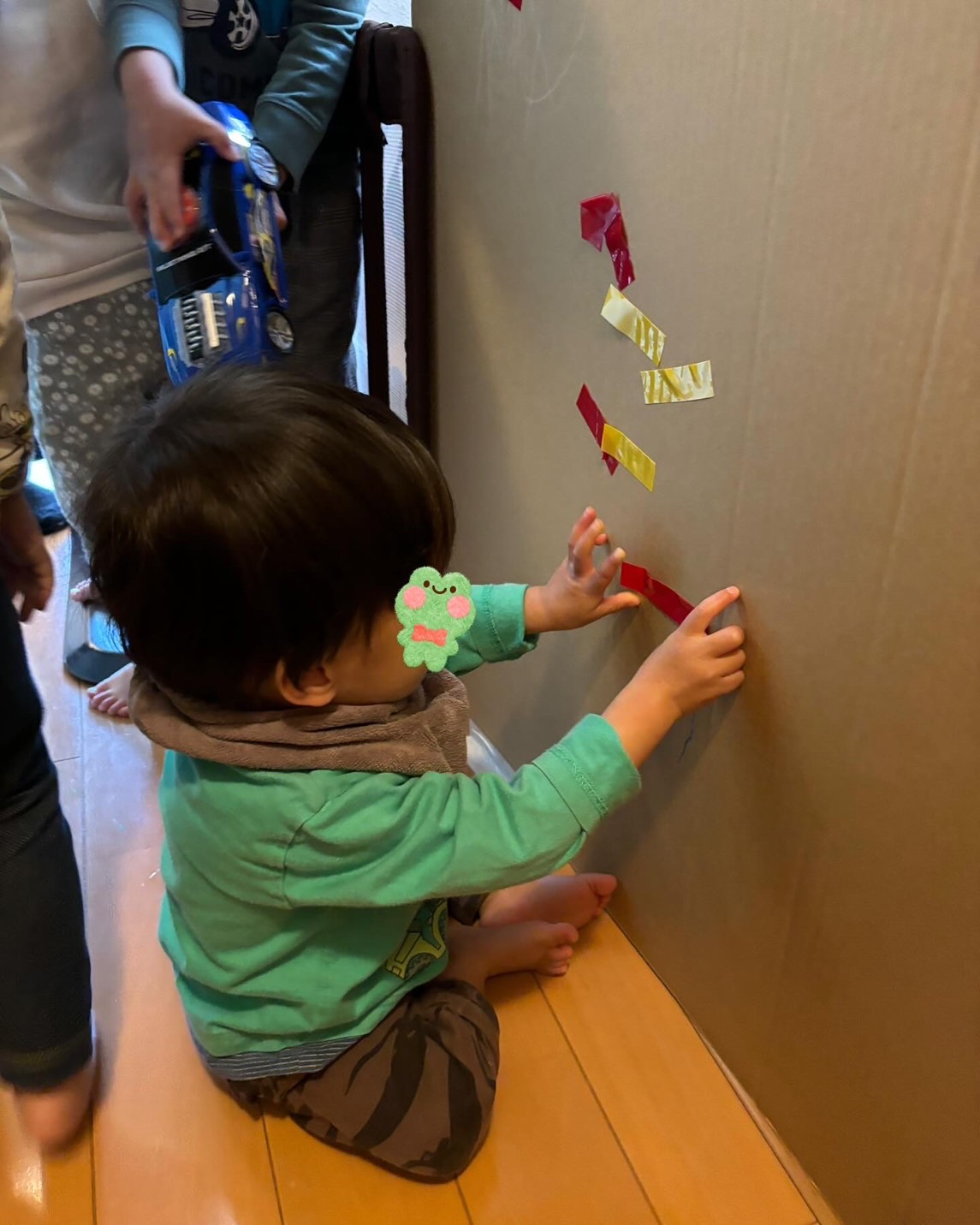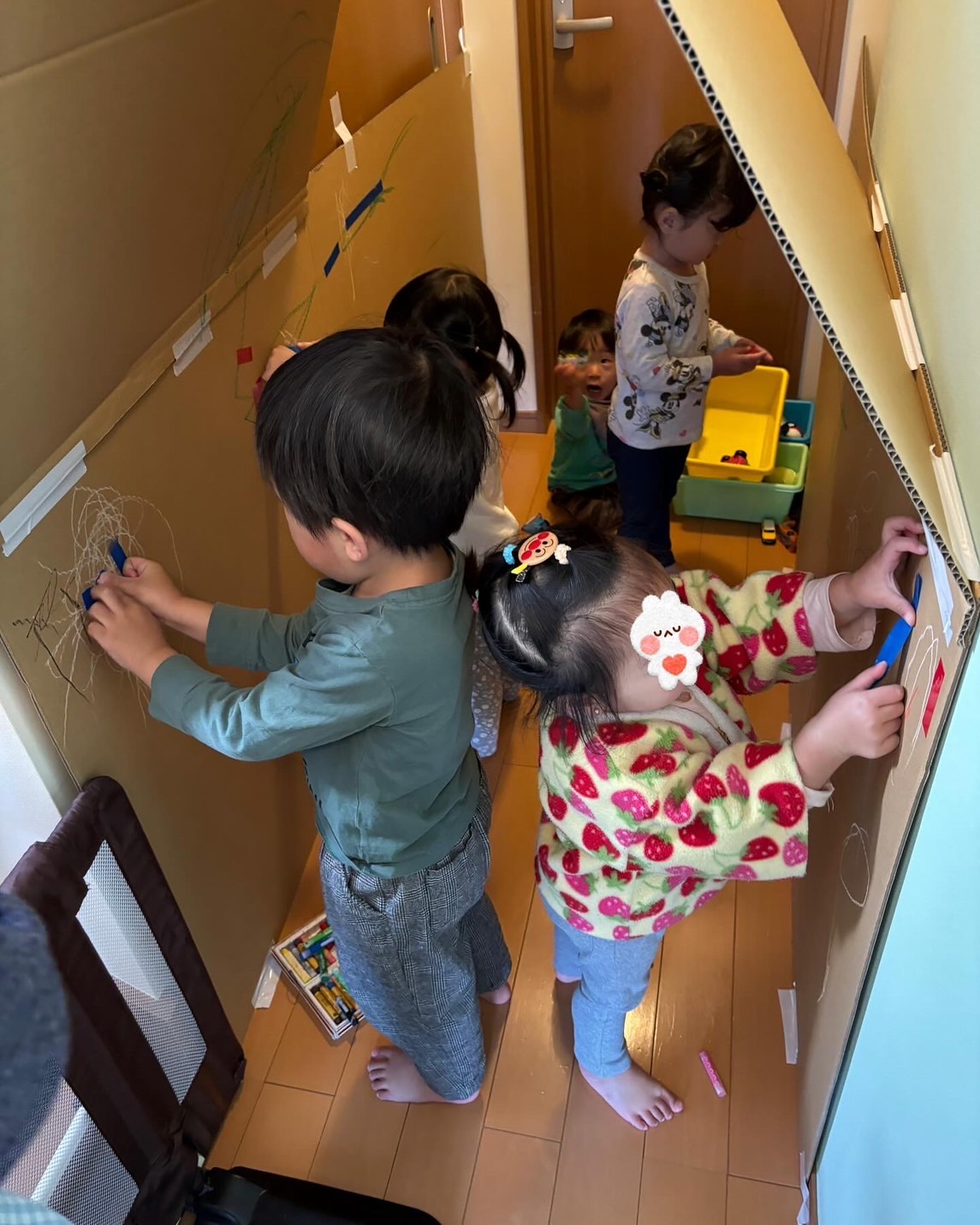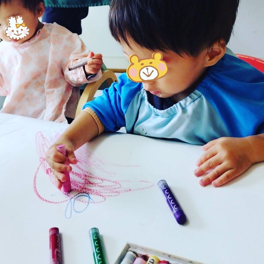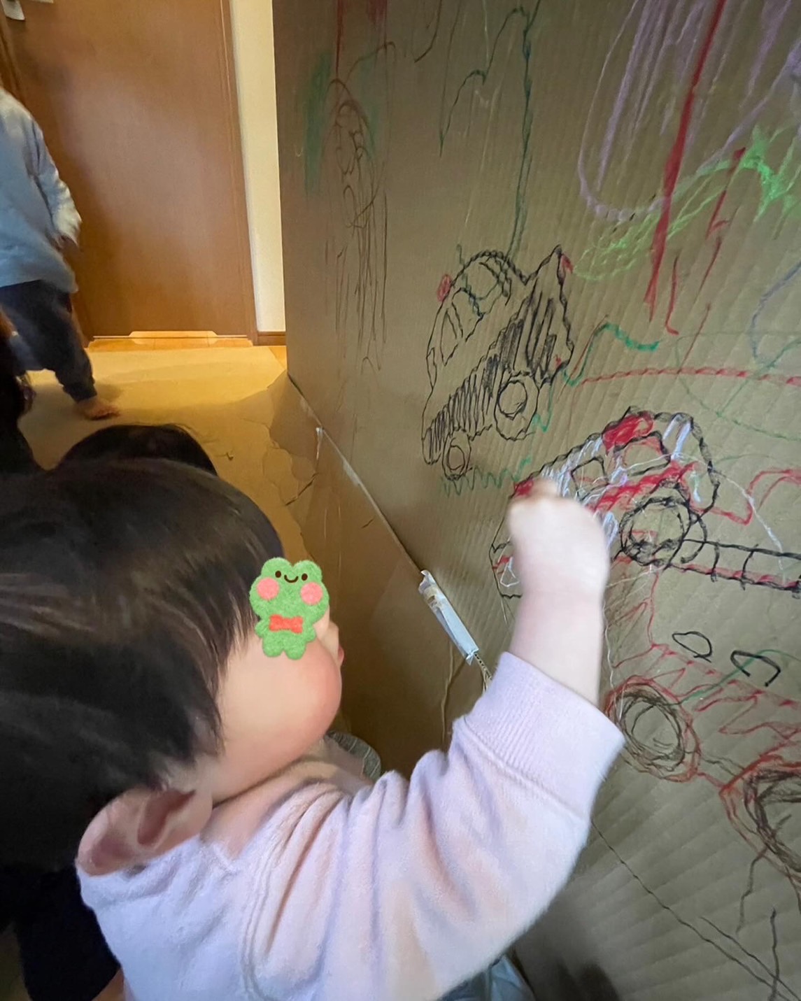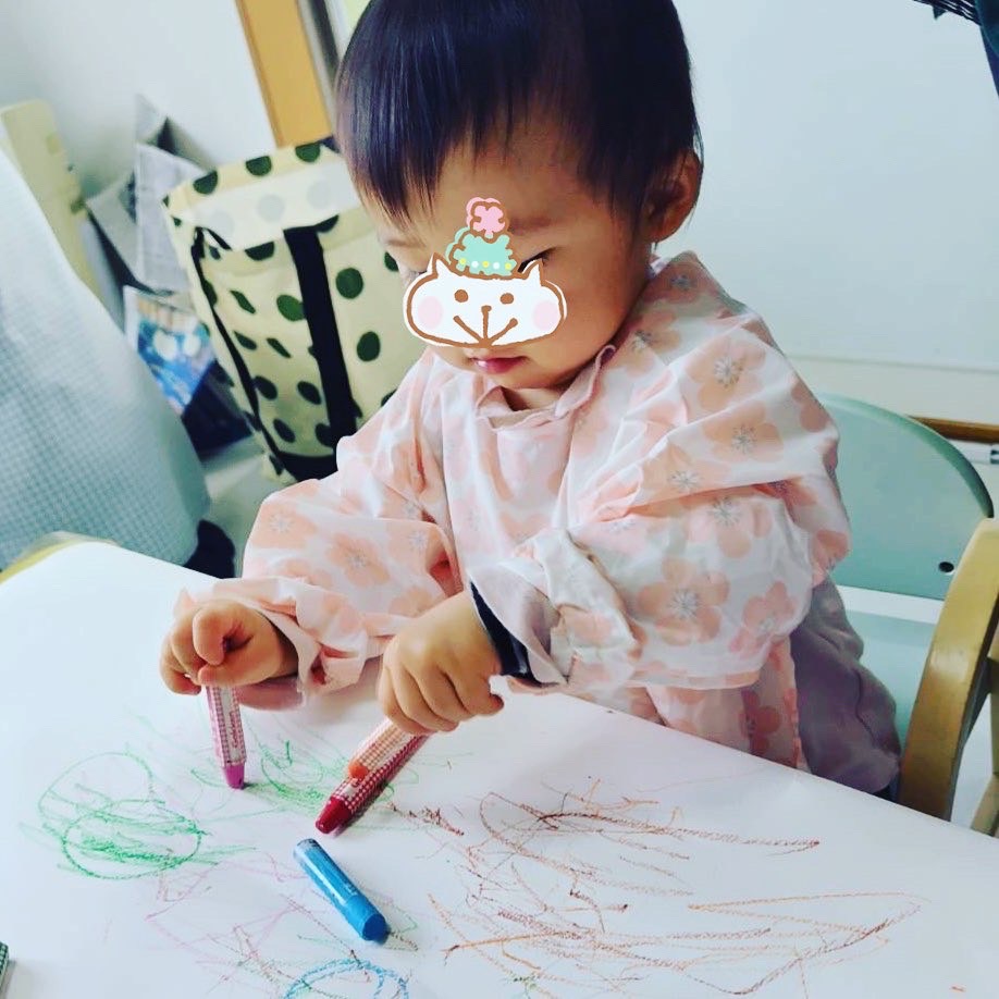 クレヨンで思い切りぐるぐる描いてみたり、テープを貼って飾り付けしてみたり、おもちゃを持ってきて遊んでみたり。。とっても楽しかったね✨