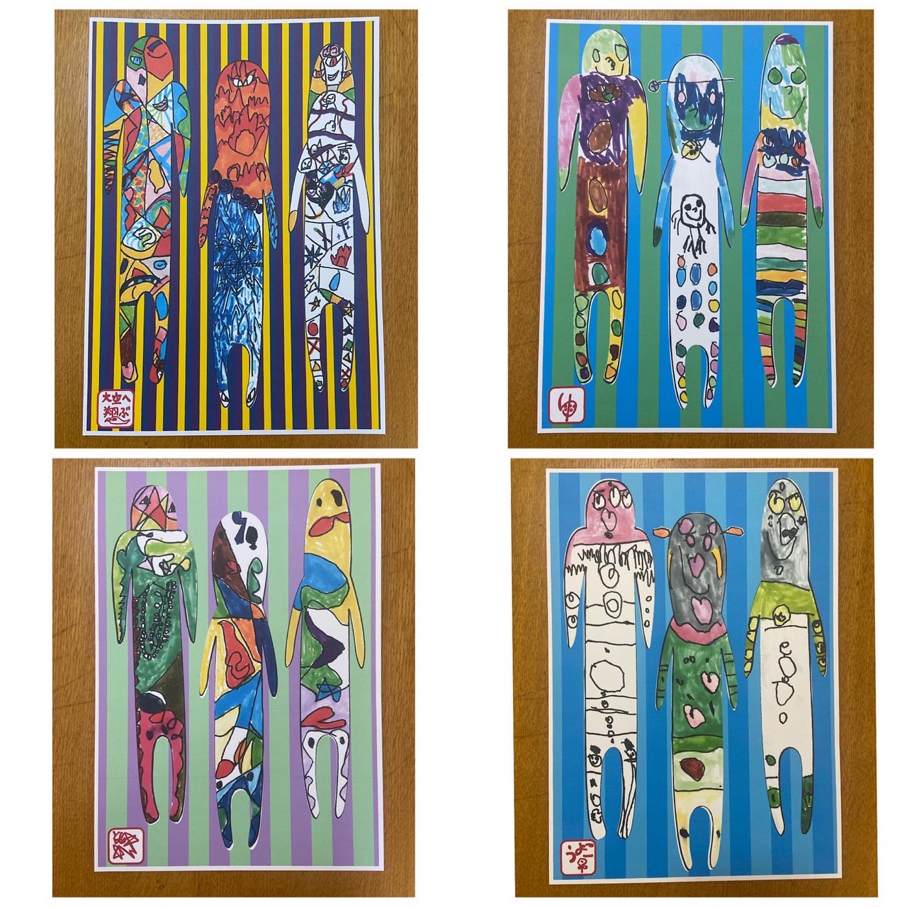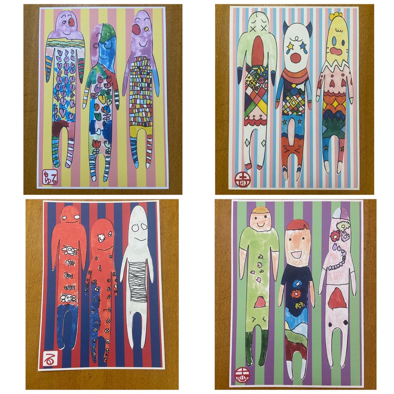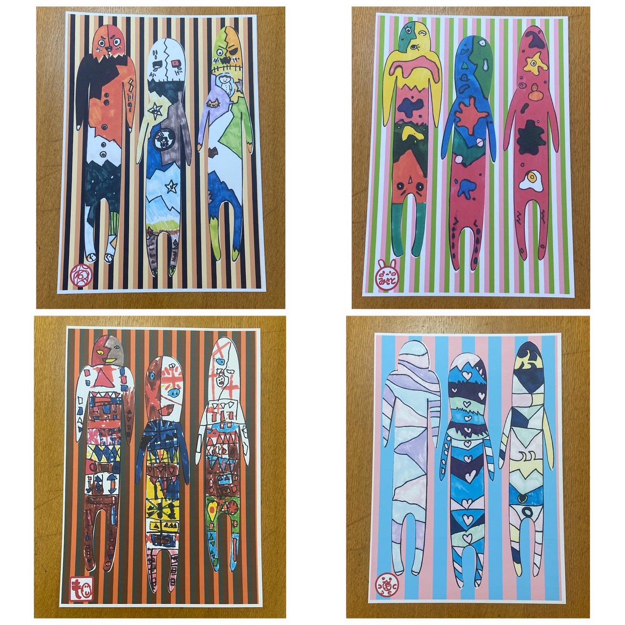 生徒さんのイラストをイラストレーターで紙全体に展開させて、模様風に私の方で配置してみたのですが。。これが。。また素晴らしい作品ばかり✨