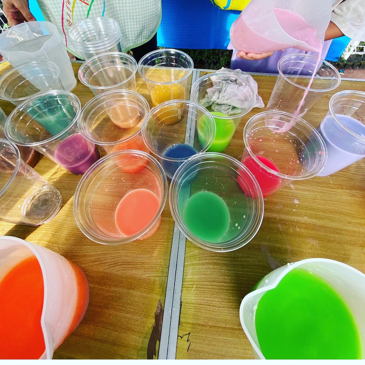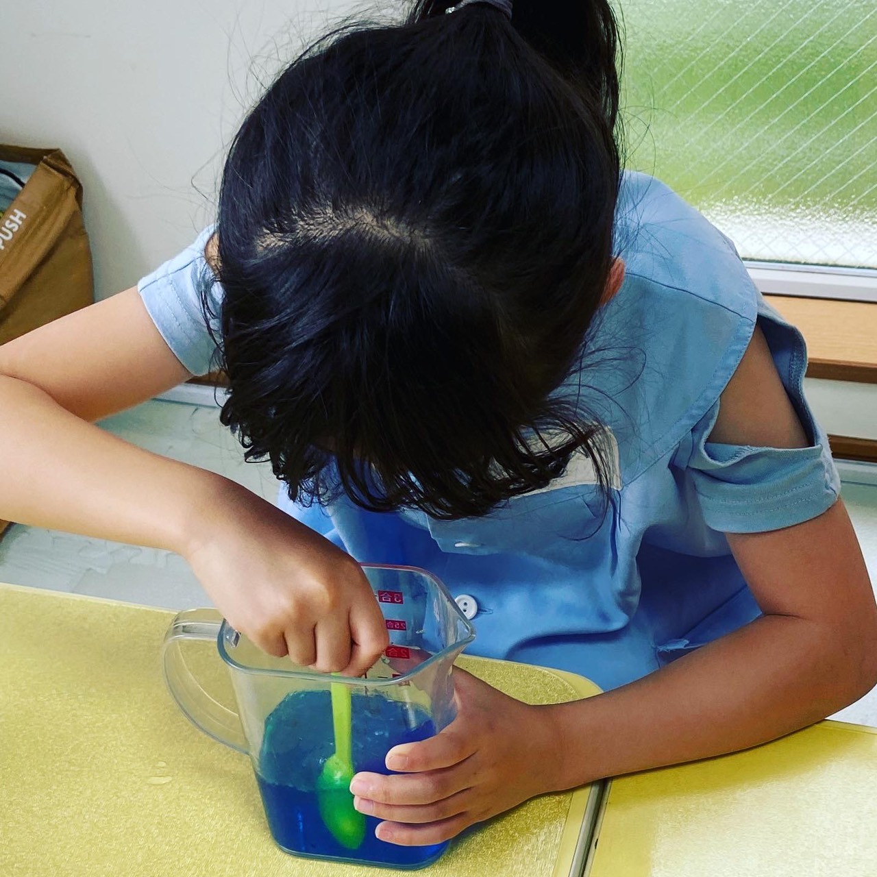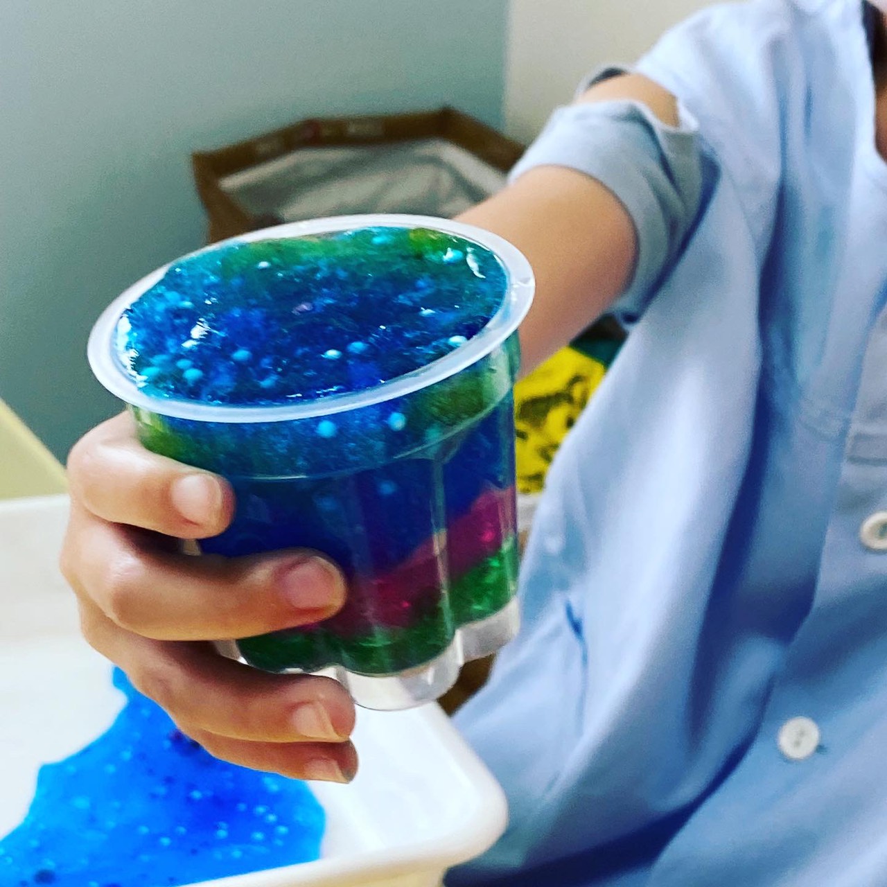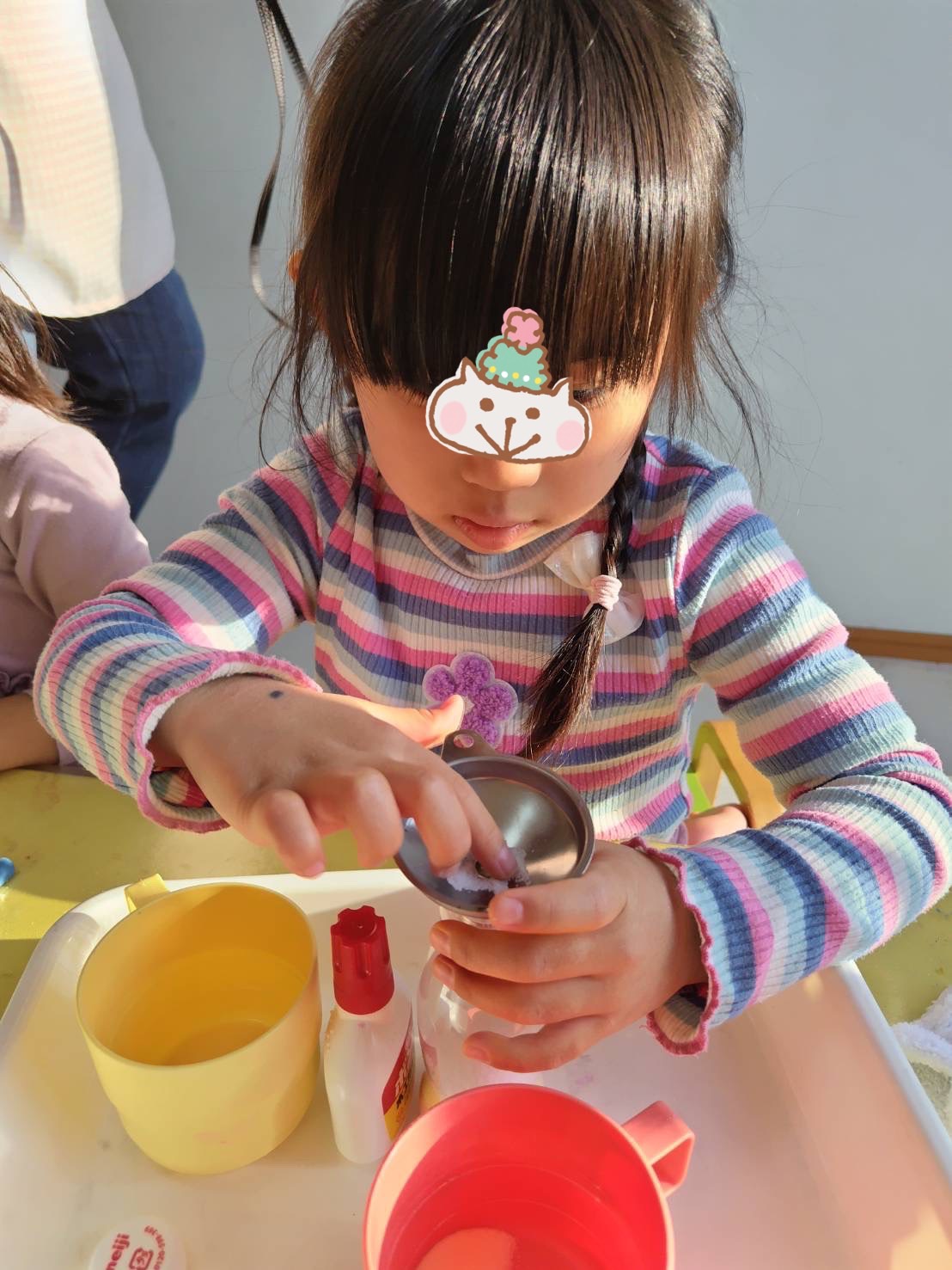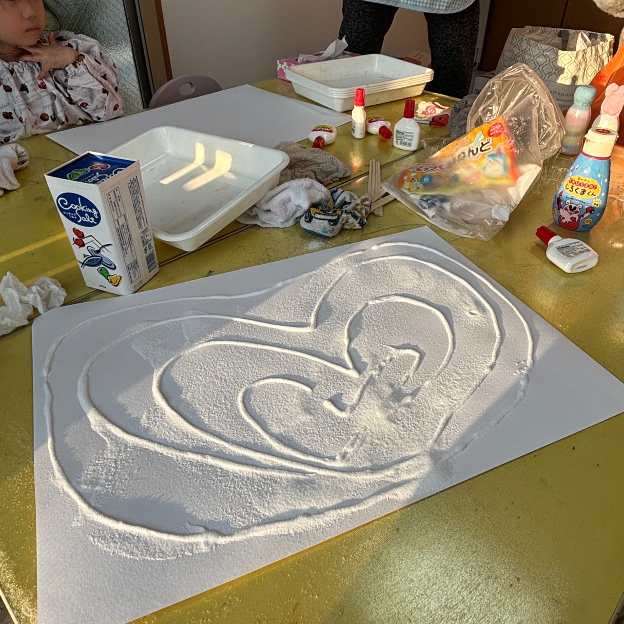 塩にパステルの粉を混ぜて色を付けてボトルに色の層を重ねていったり、塩に絵の具を吸い込ませてみたり、おもしろかったね♪