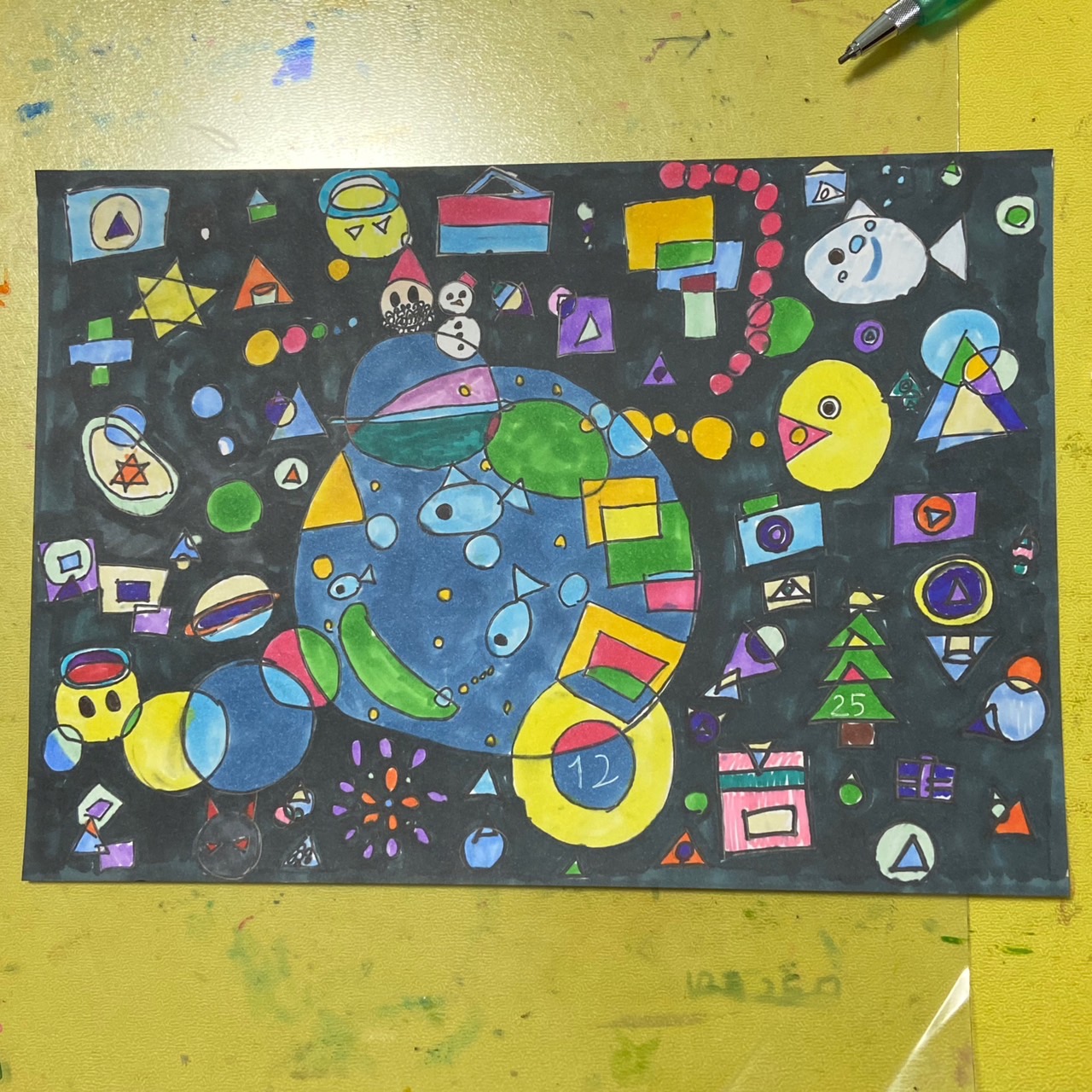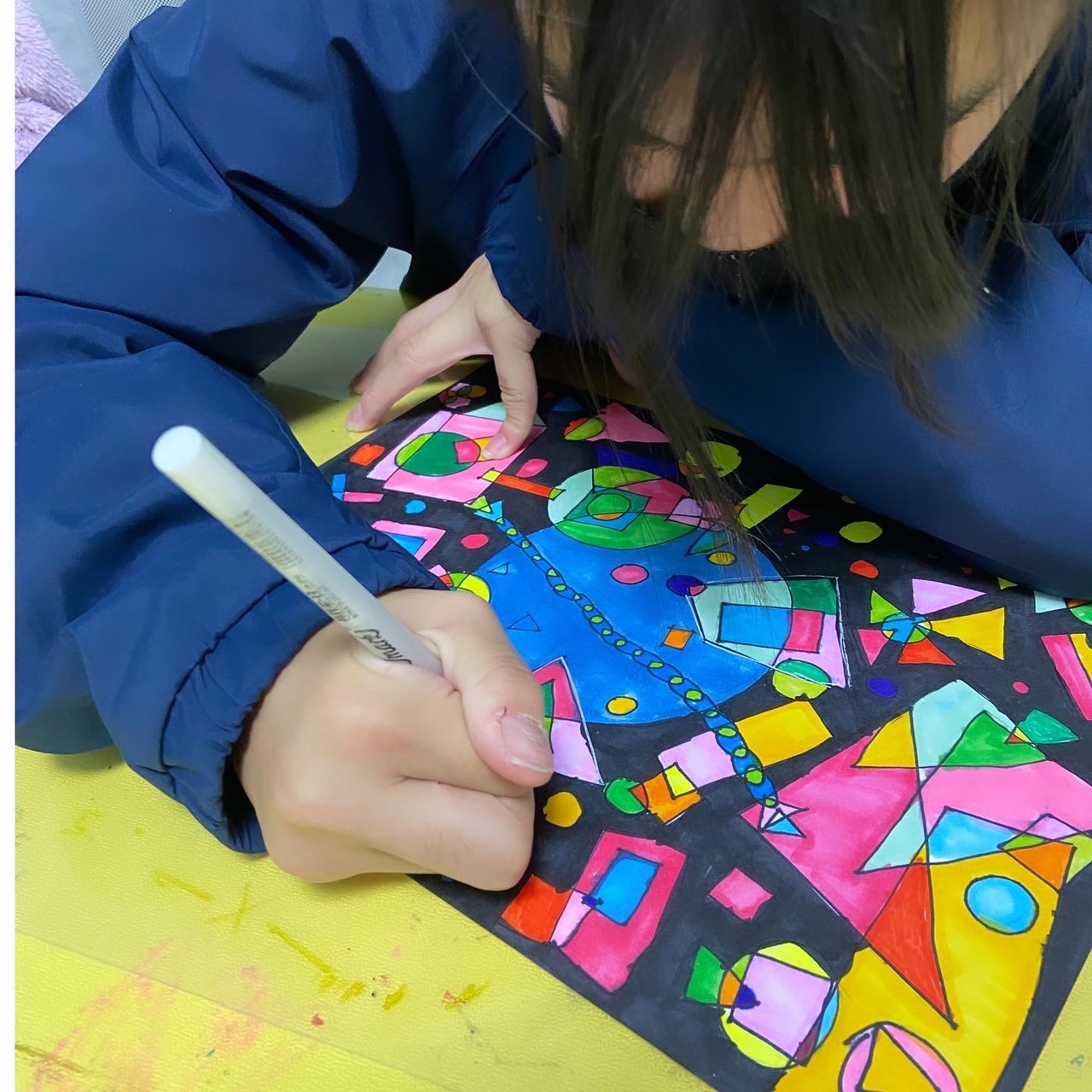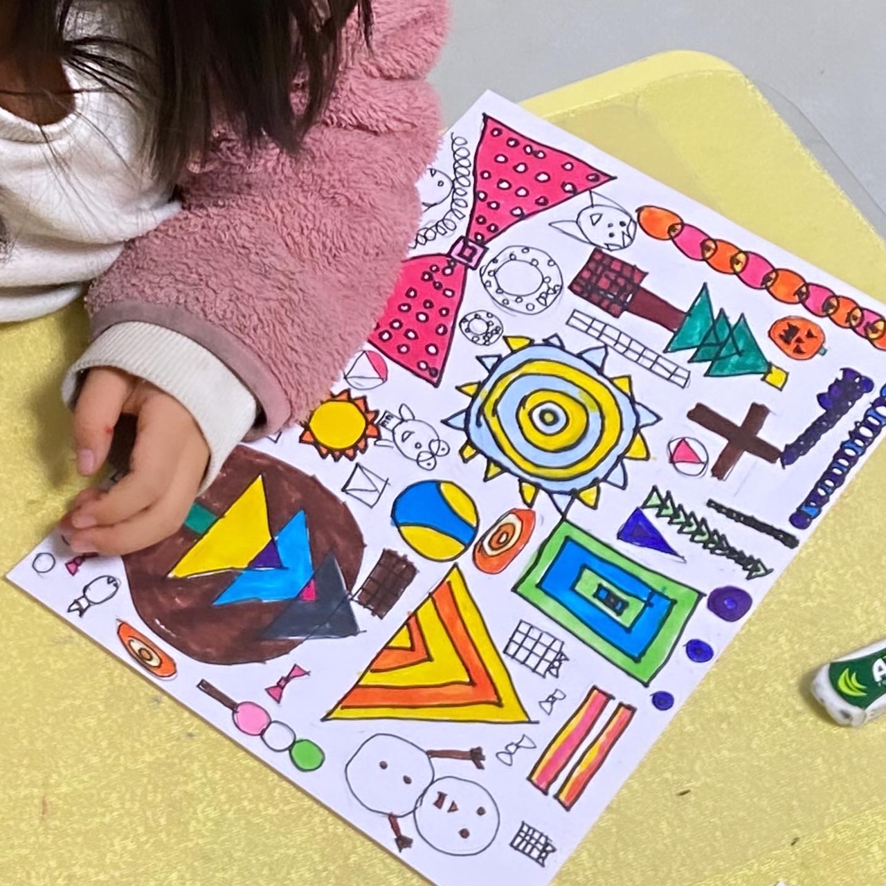 マル、さんかく、しかくを変形させながら、デザインを完成させることから始まり、応用編では、好きなもの3つを決めて、それを変形させながらデザインするところまでやってしまった生徒さんもいました✨