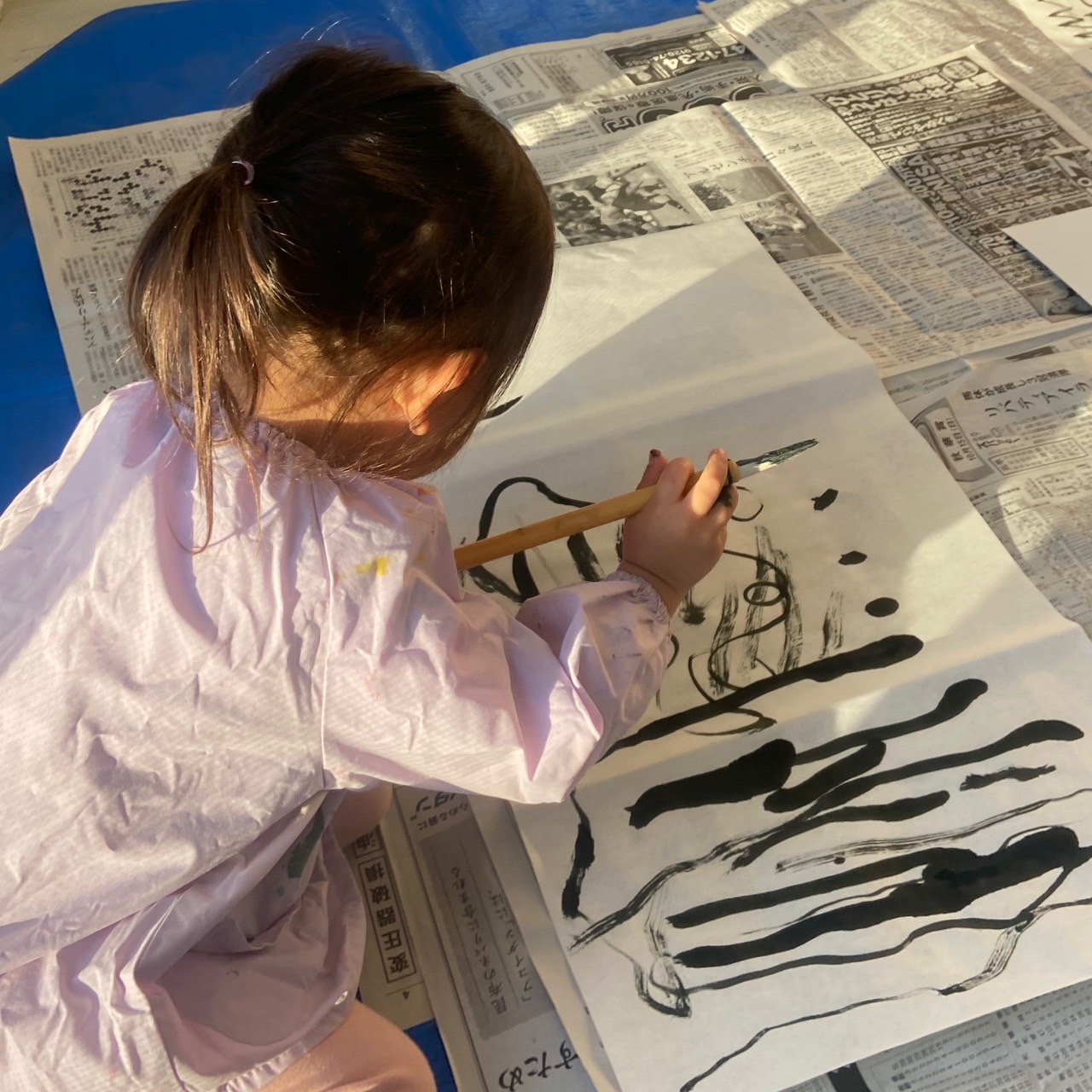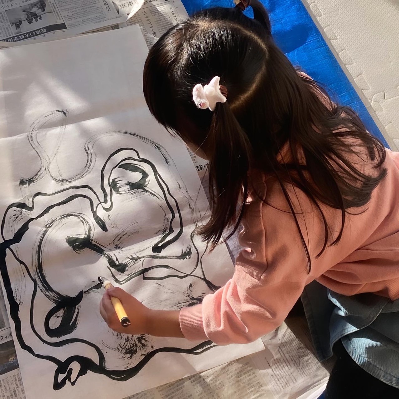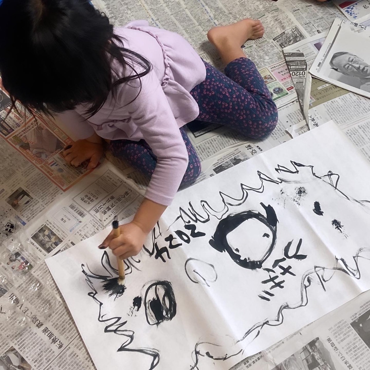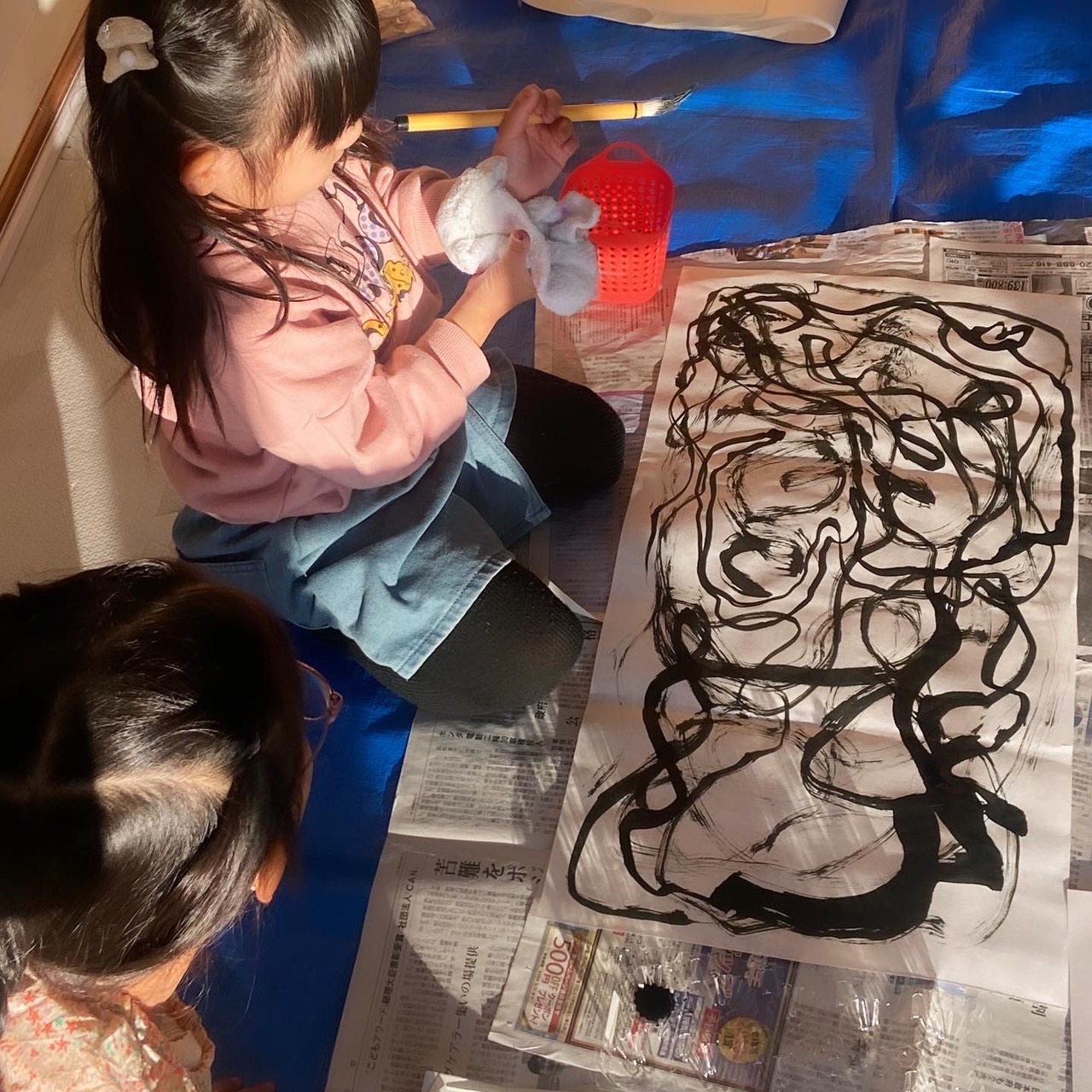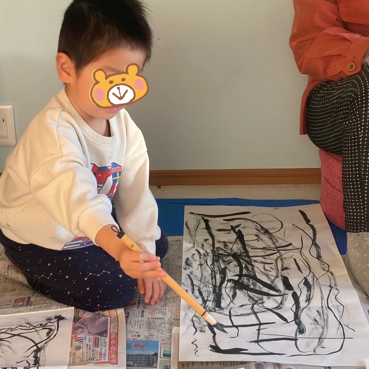 毎回何をするのか分からない放課後造形教室ですが、今回は、墨汁を使って、書き初め風長い線を描こう♪ということで、やってみました😊✨