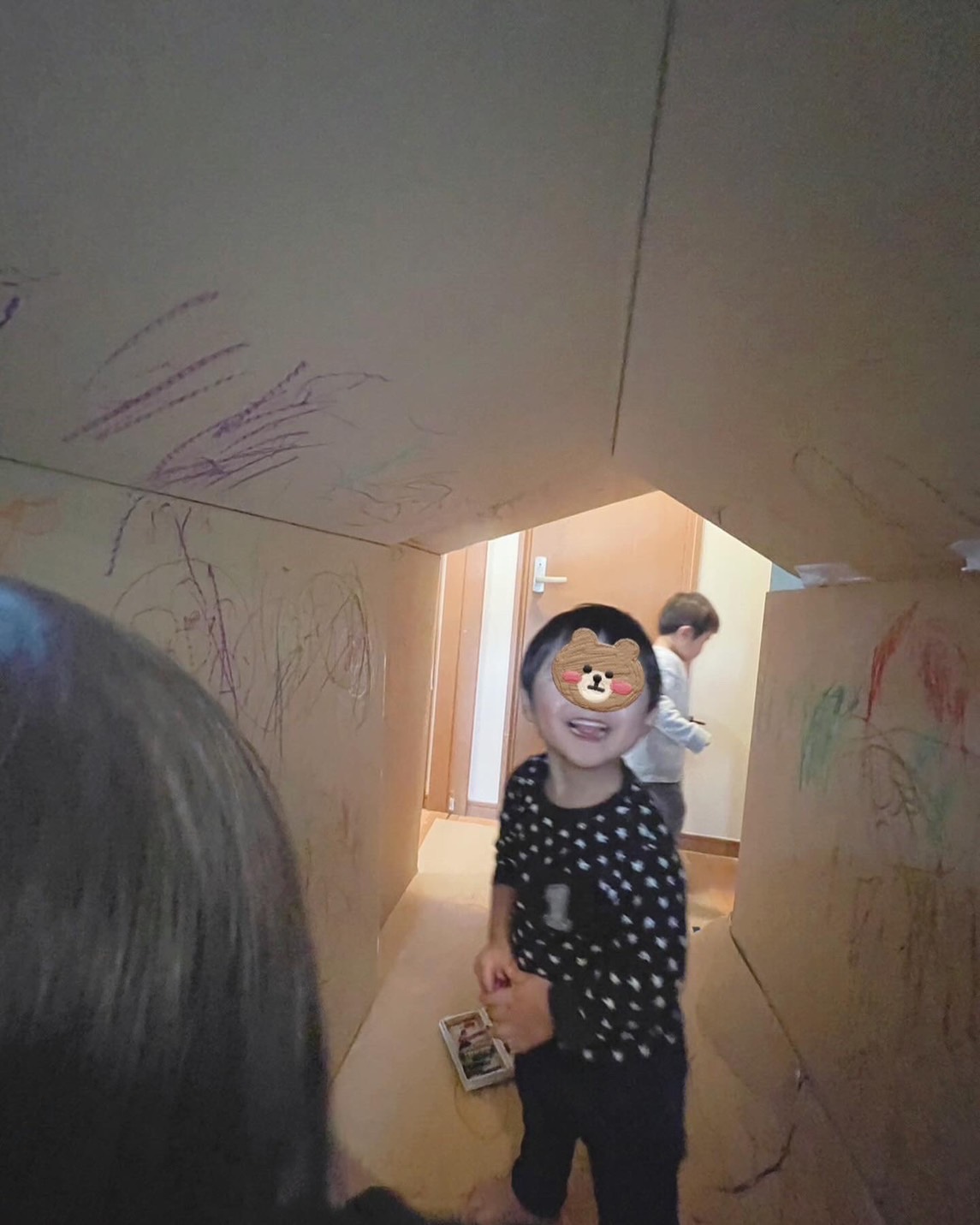 大きなダンボールで、廊下の細い通路が秘密基地に大変身♪