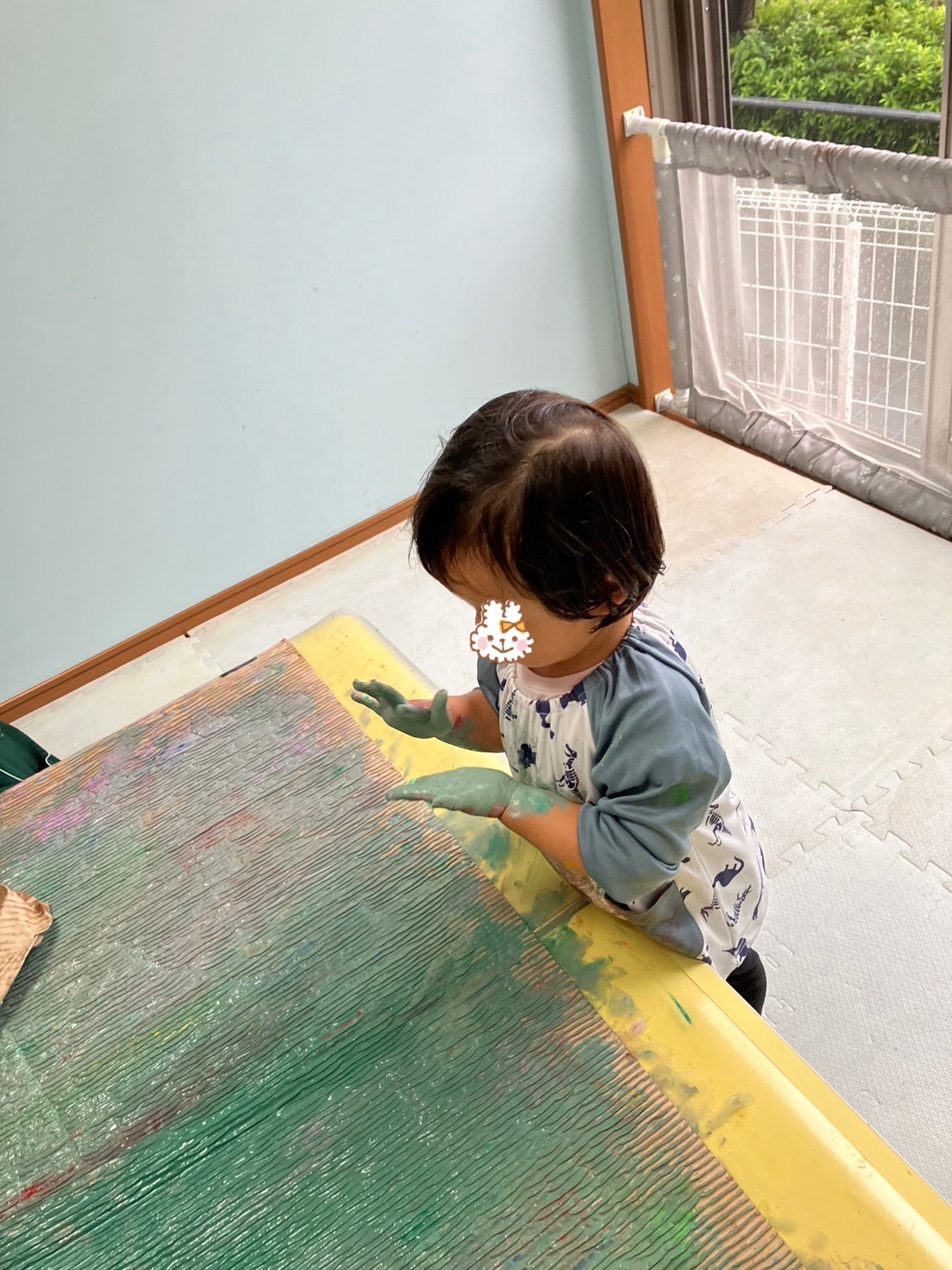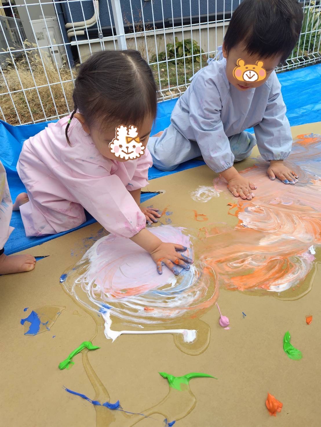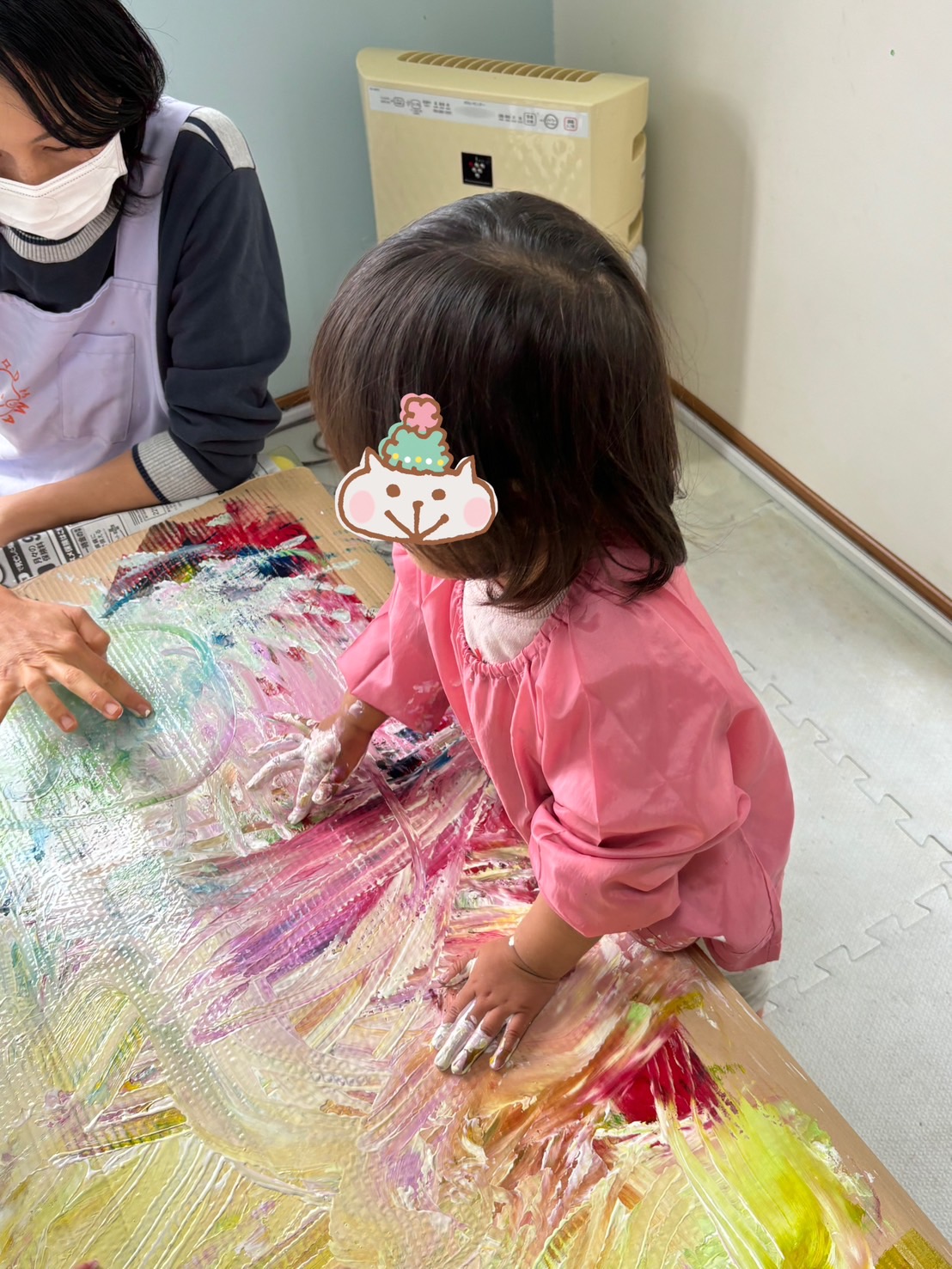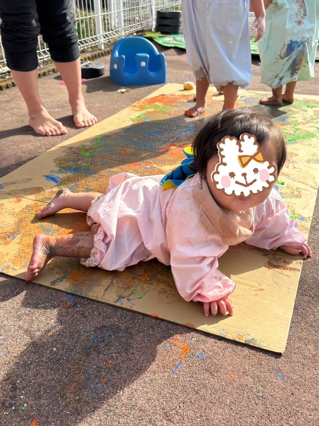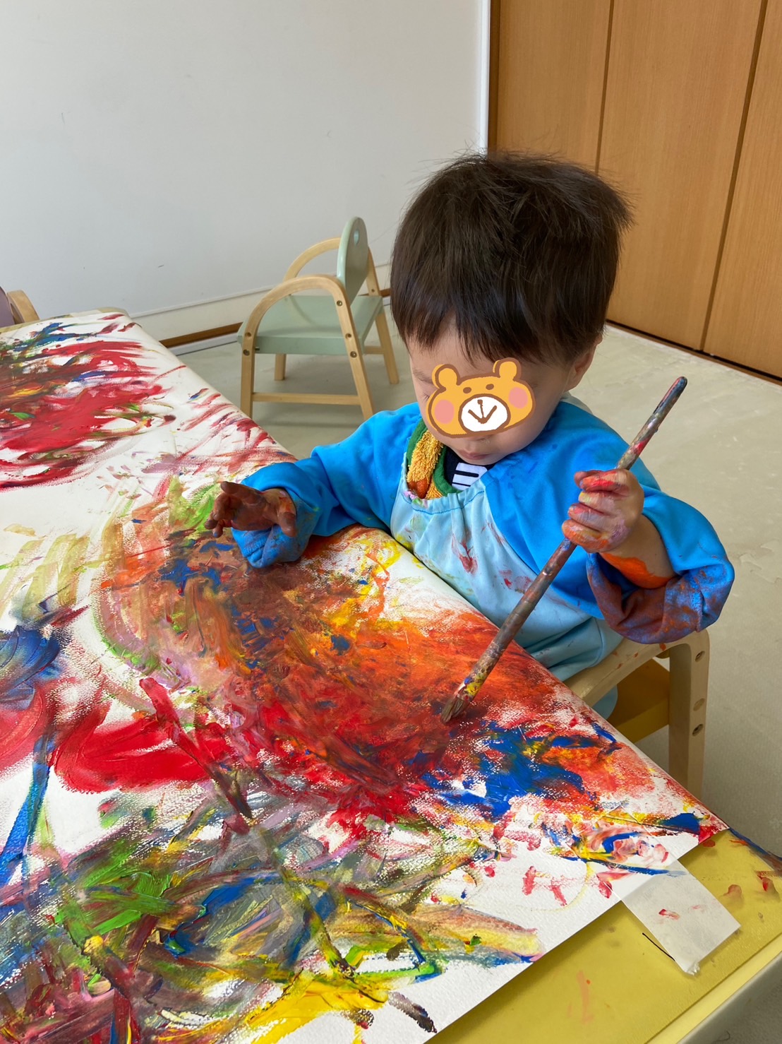 五感をフル回転させながら、途中からは手に色を塗って楽しむ子や、絵の具を混ぜて嬉しそうな子や、これだけ遊んでくれたら、絵の具も喜びます✨
