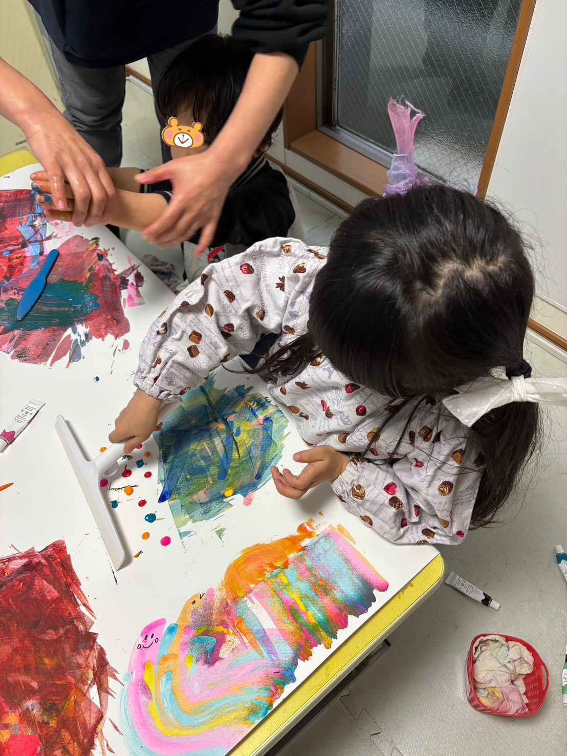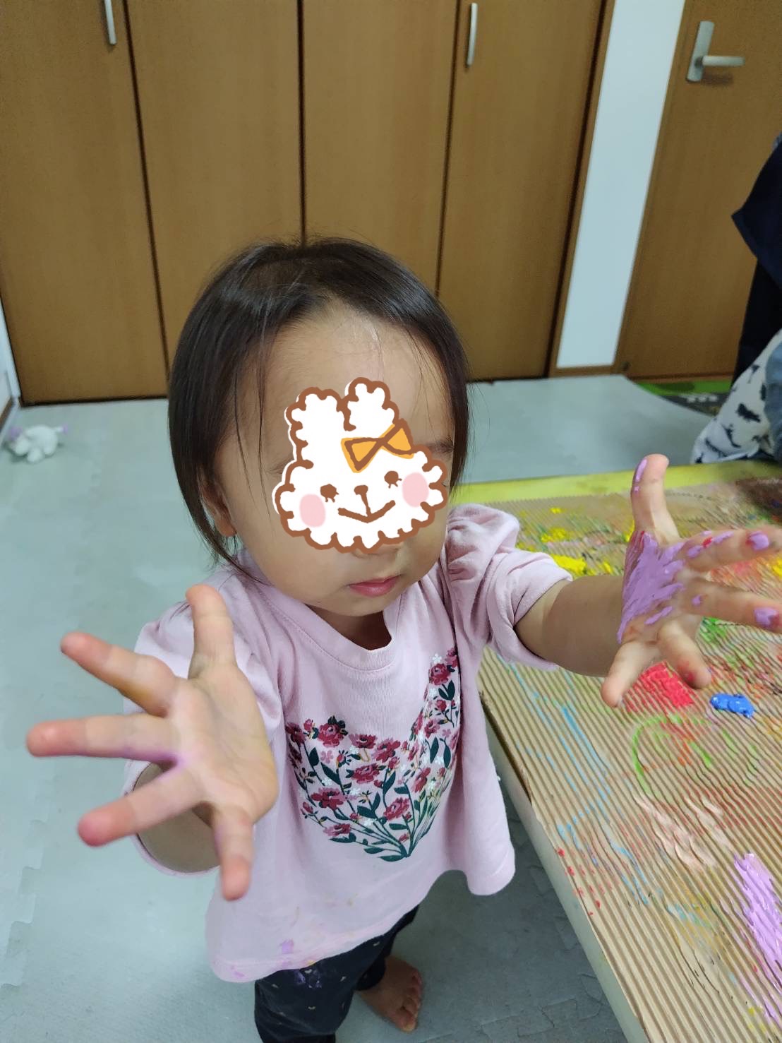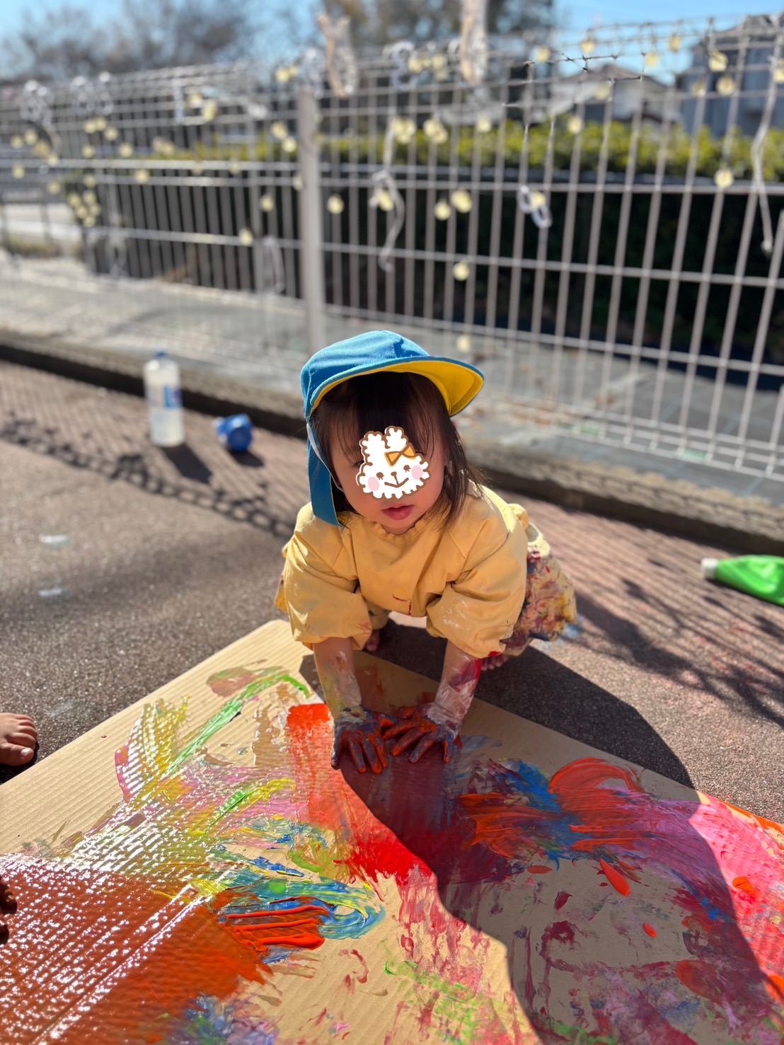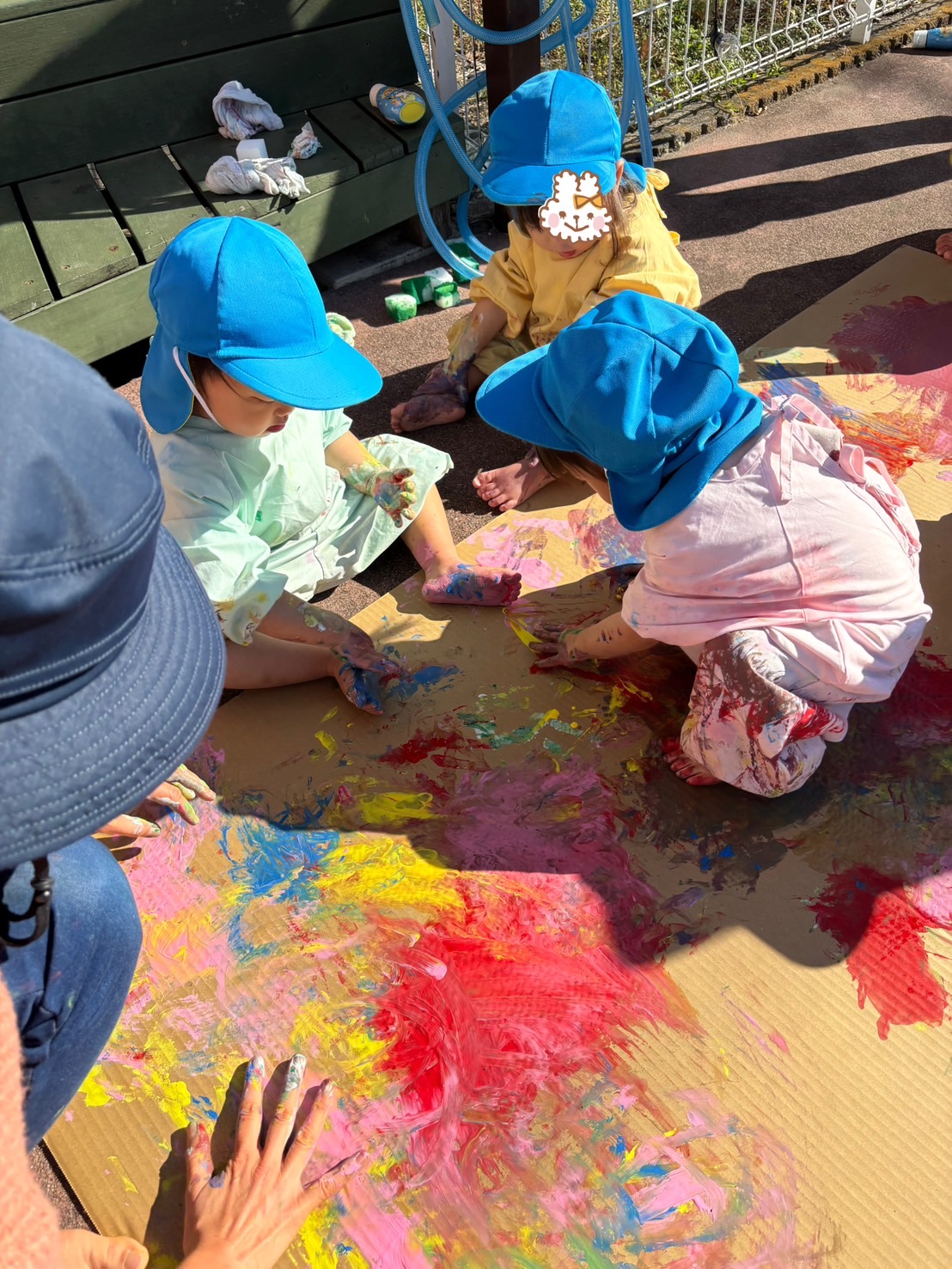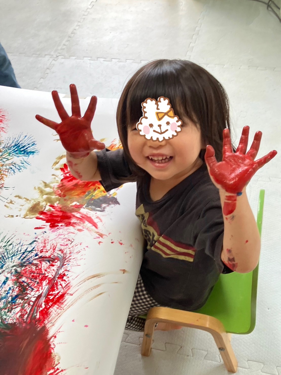 五感をフル回転させながら、途中からは手に色を塗って楽しむ子や、絵の具を混ぜて嬉しそうな子や、これだけ遊んでくれたら、絵の具も喜びます✨
