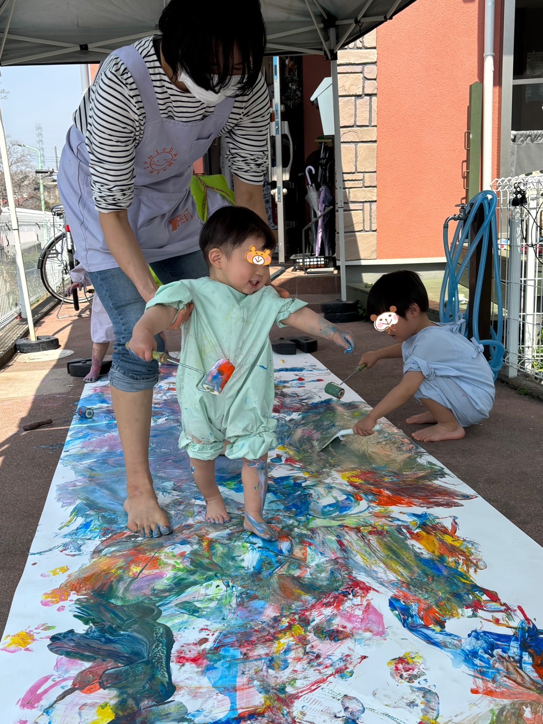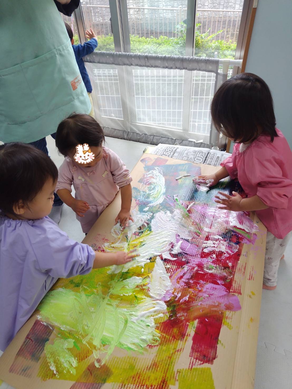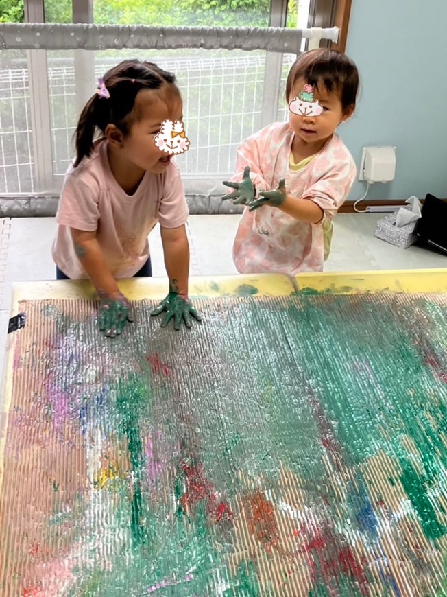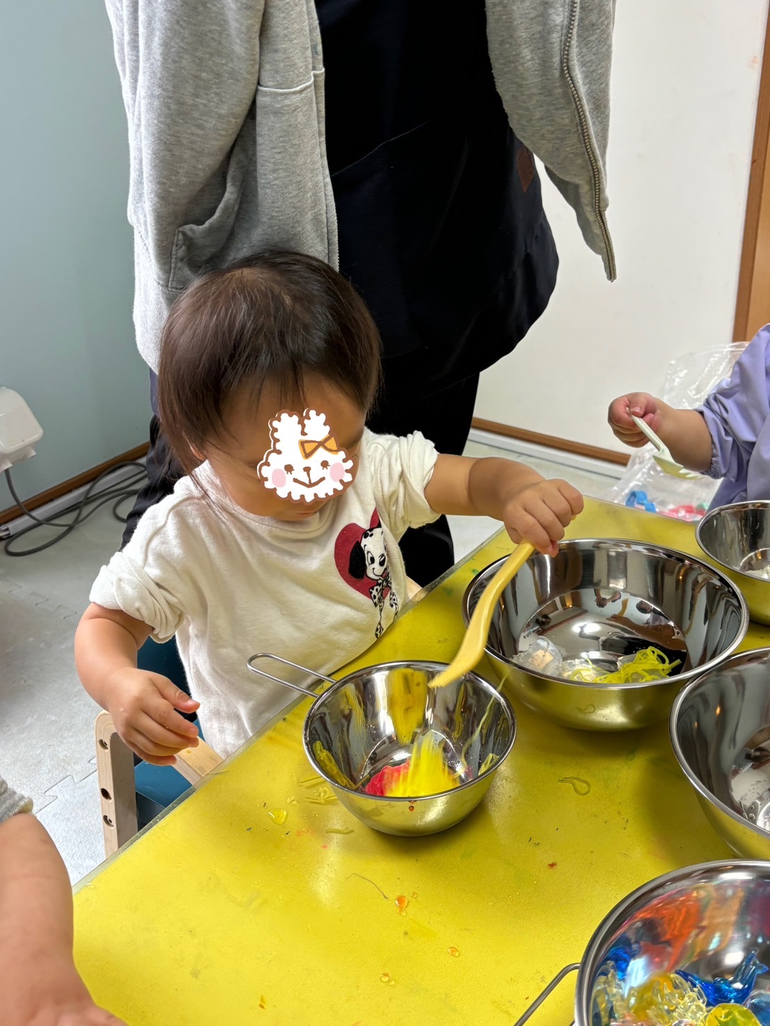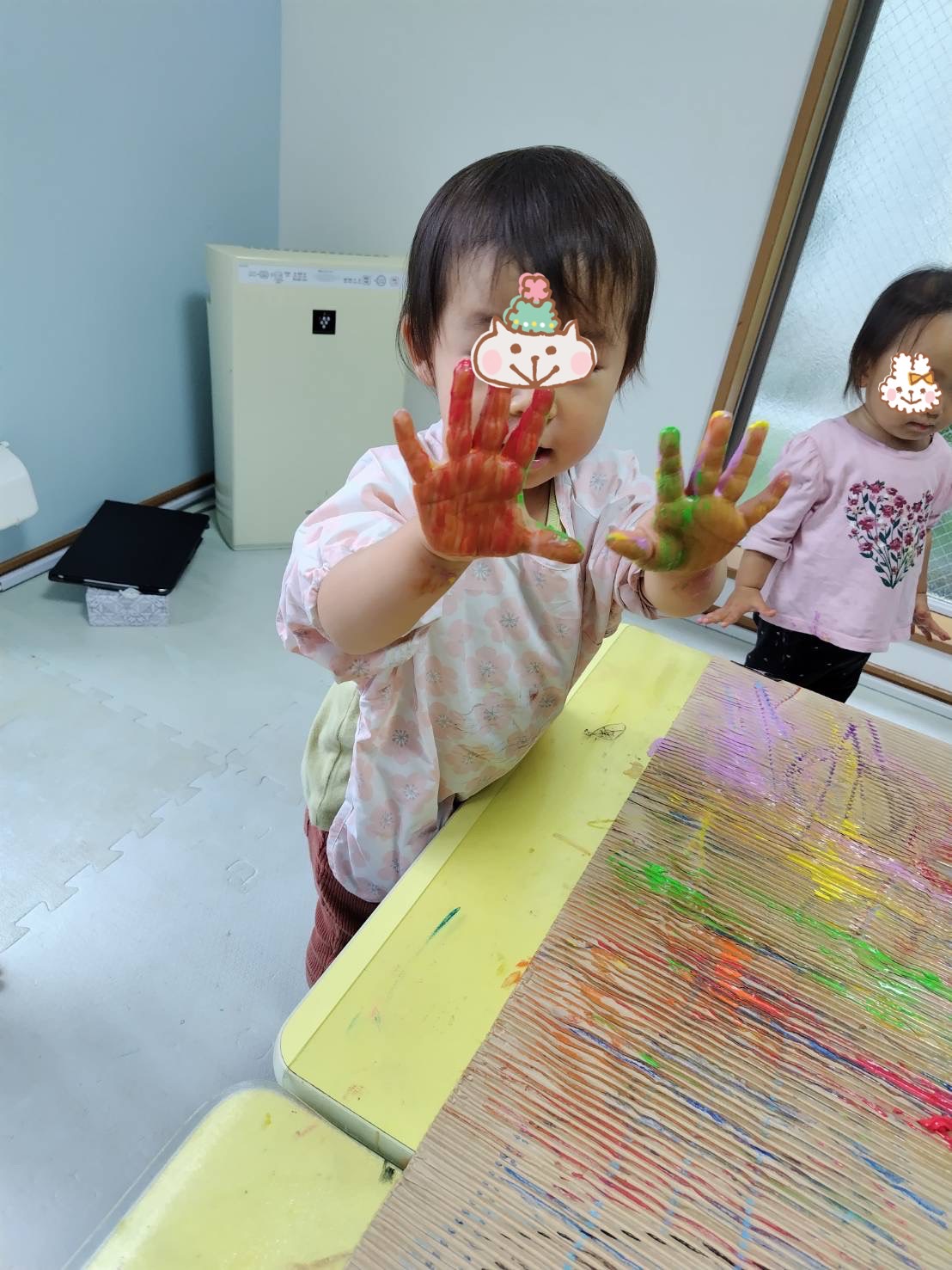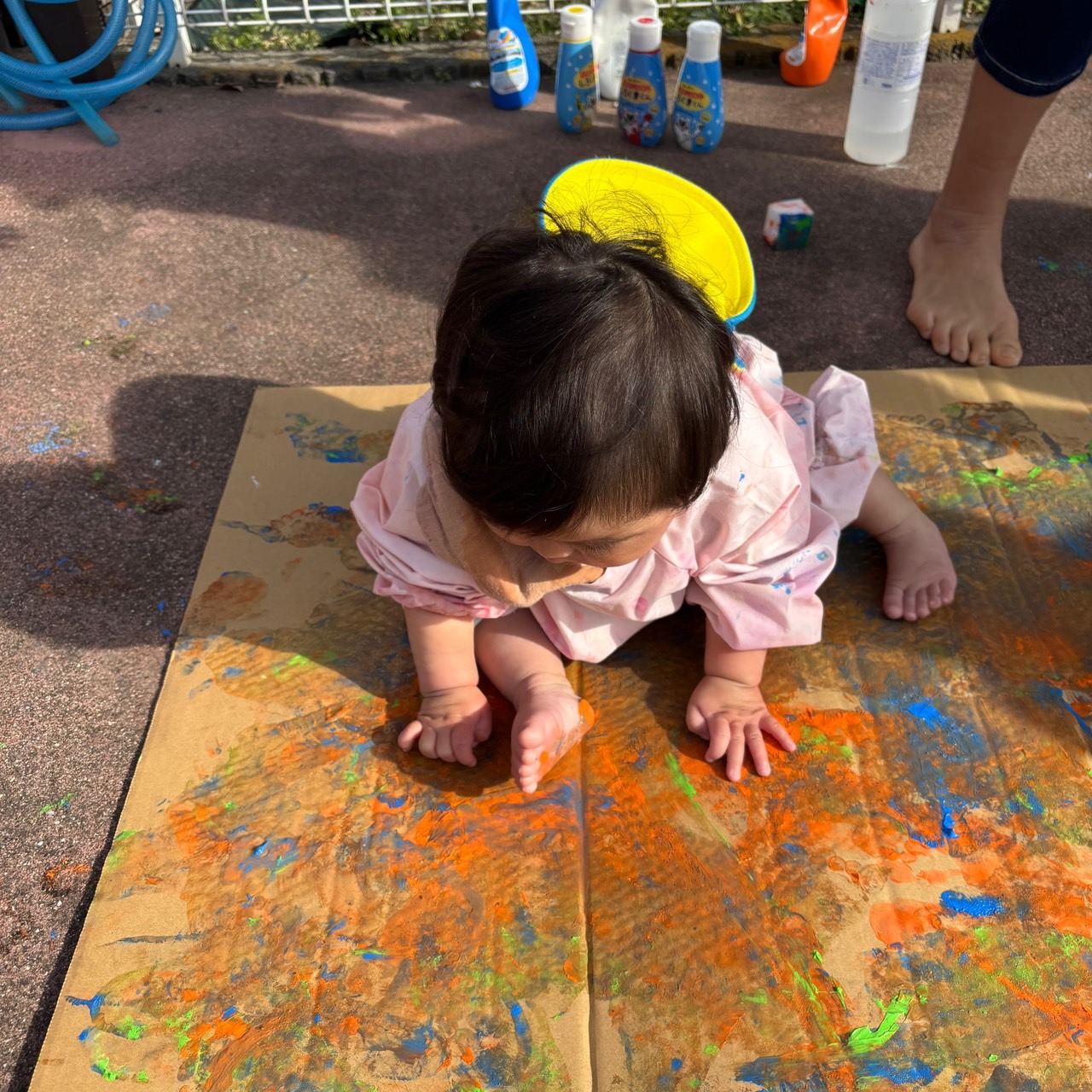五感をフル回転させながら、途中からは手に色を塗って楽しむ子や、絵の具を混ぜて嬉しそうな子や、これだけ遊んでくれたら、絵の具も喜びます✨