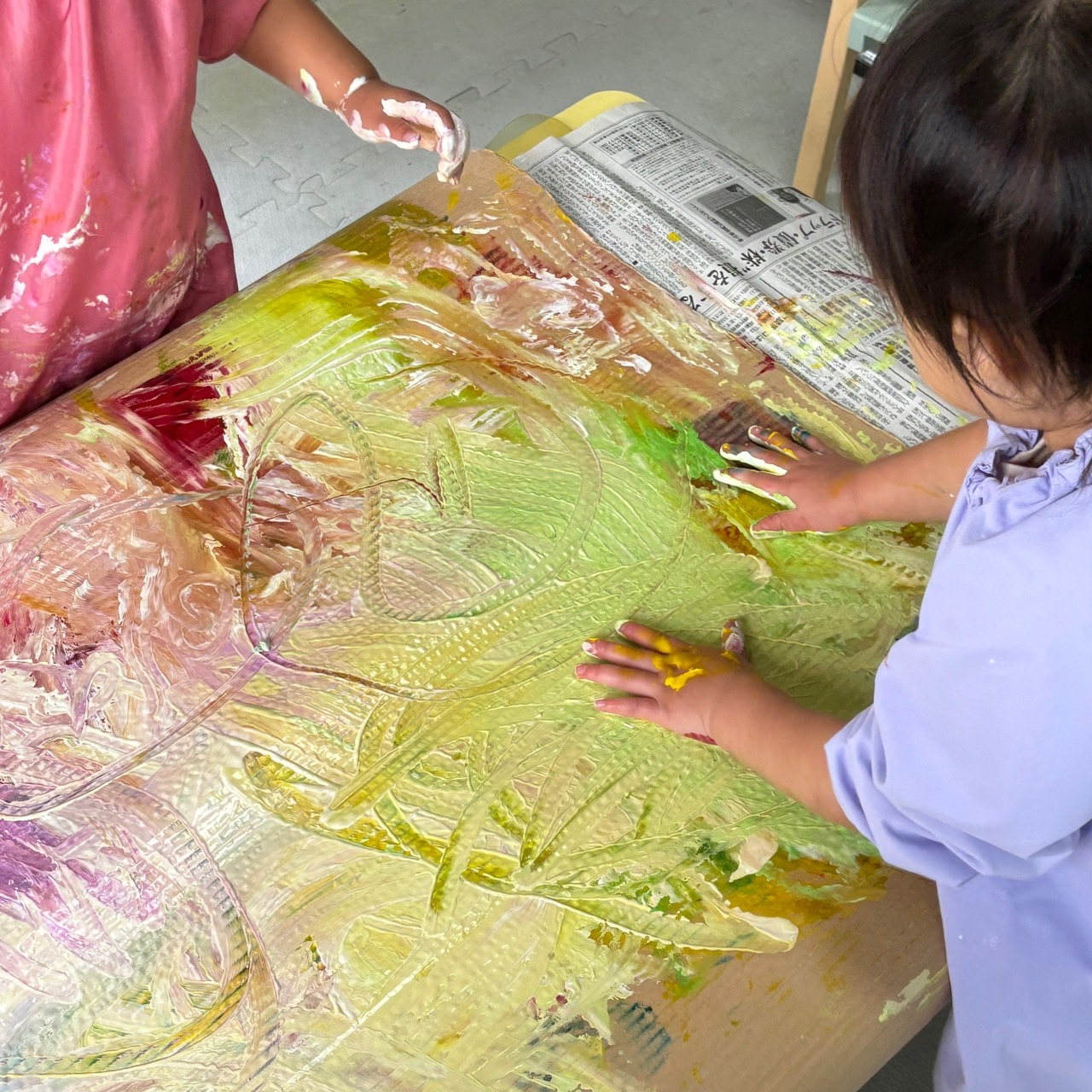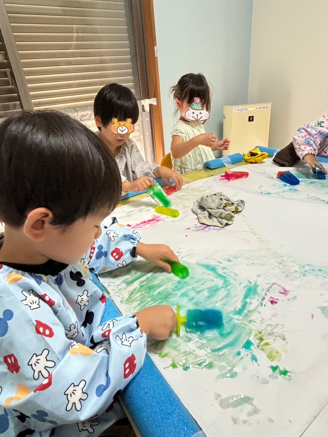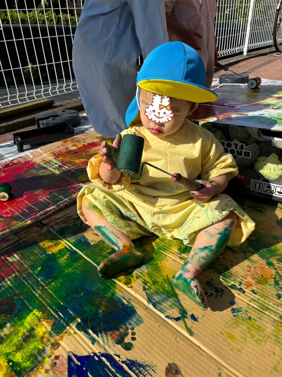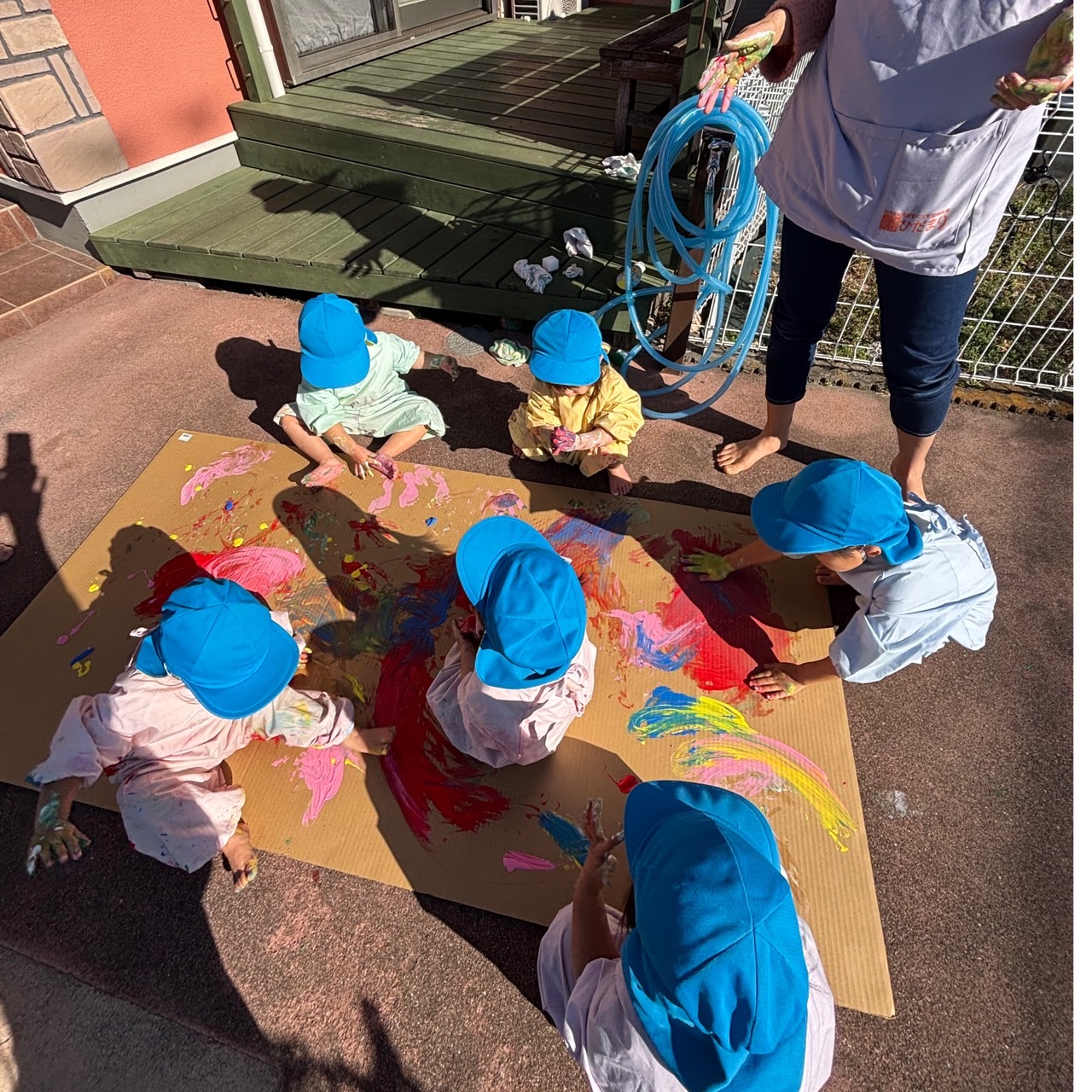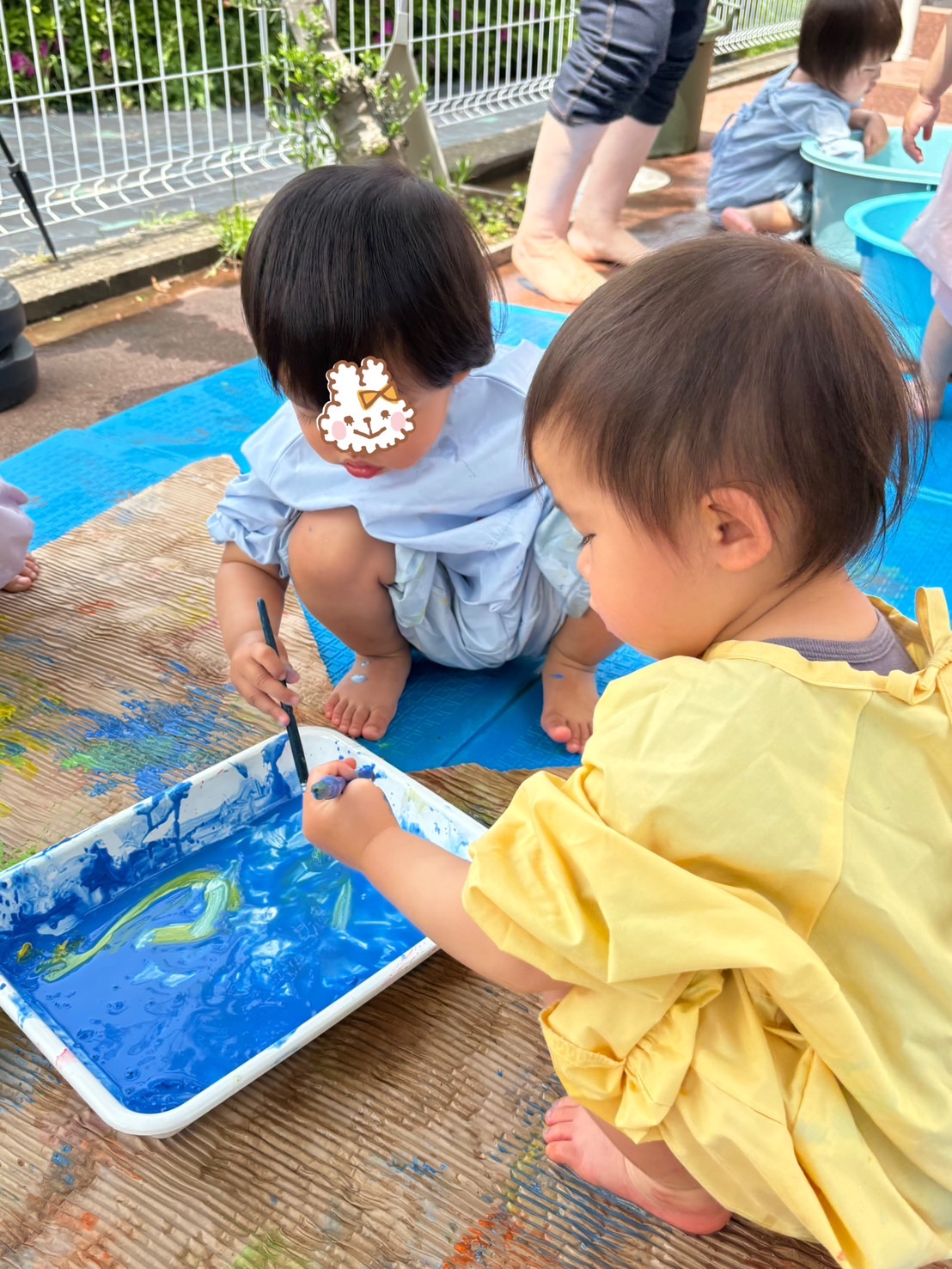五感をフル回転させながら、途中からは手に色を塗って楽しむ子や、絵の具を混ぜて嬉しそうな子や、これだけ遊んでくれたら、絵の具も喜びます✨