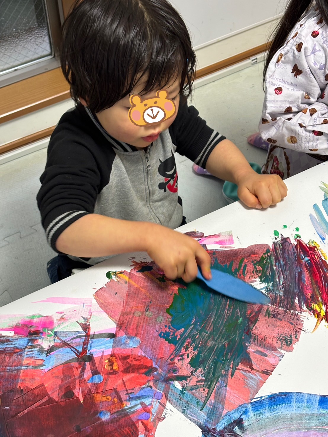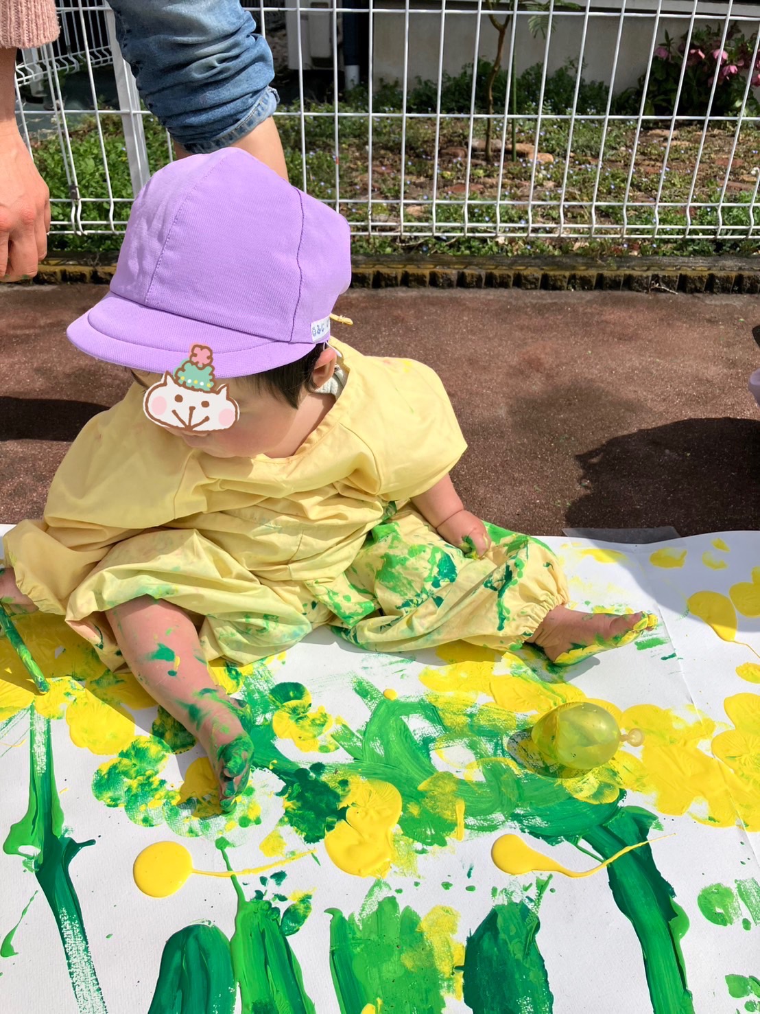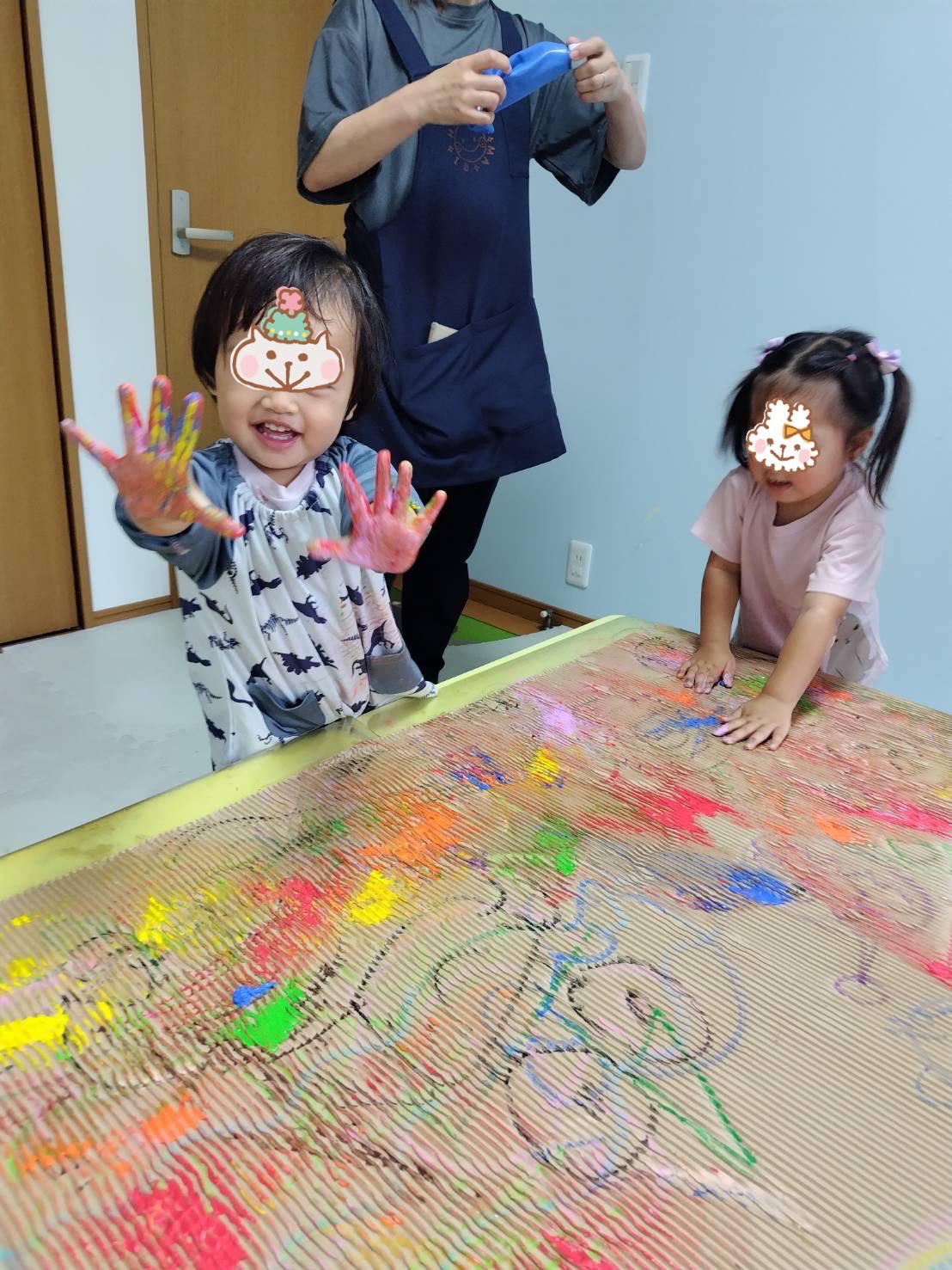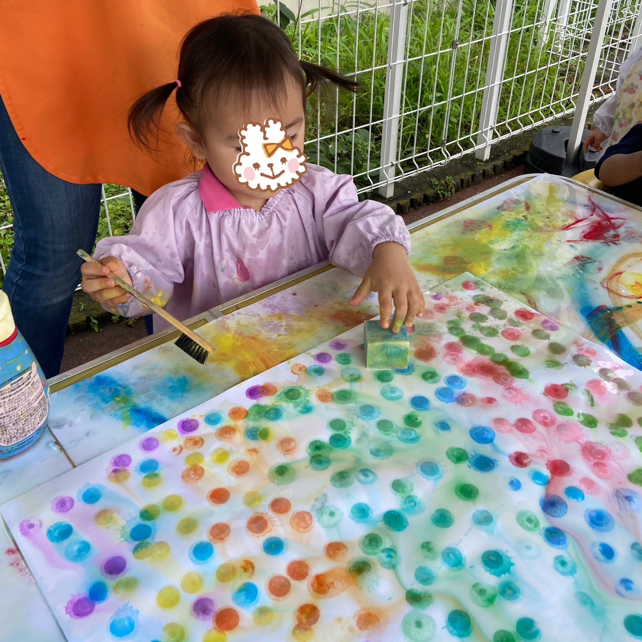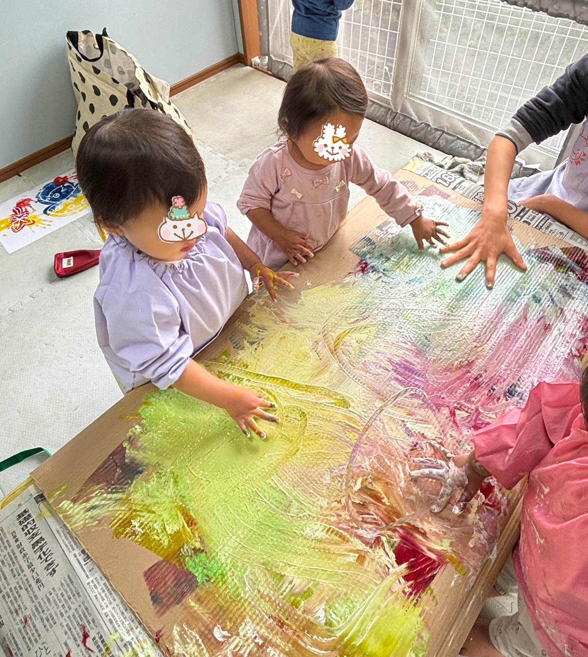 五感をフル回転させながら、途中からは手に色を塗って楽しむ子や、絵の具を混ぜて嬉しそうな子や、これだけ遊んでくれたら、絵の具も喜びます✨