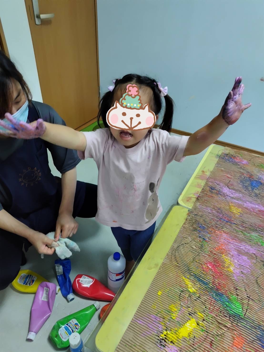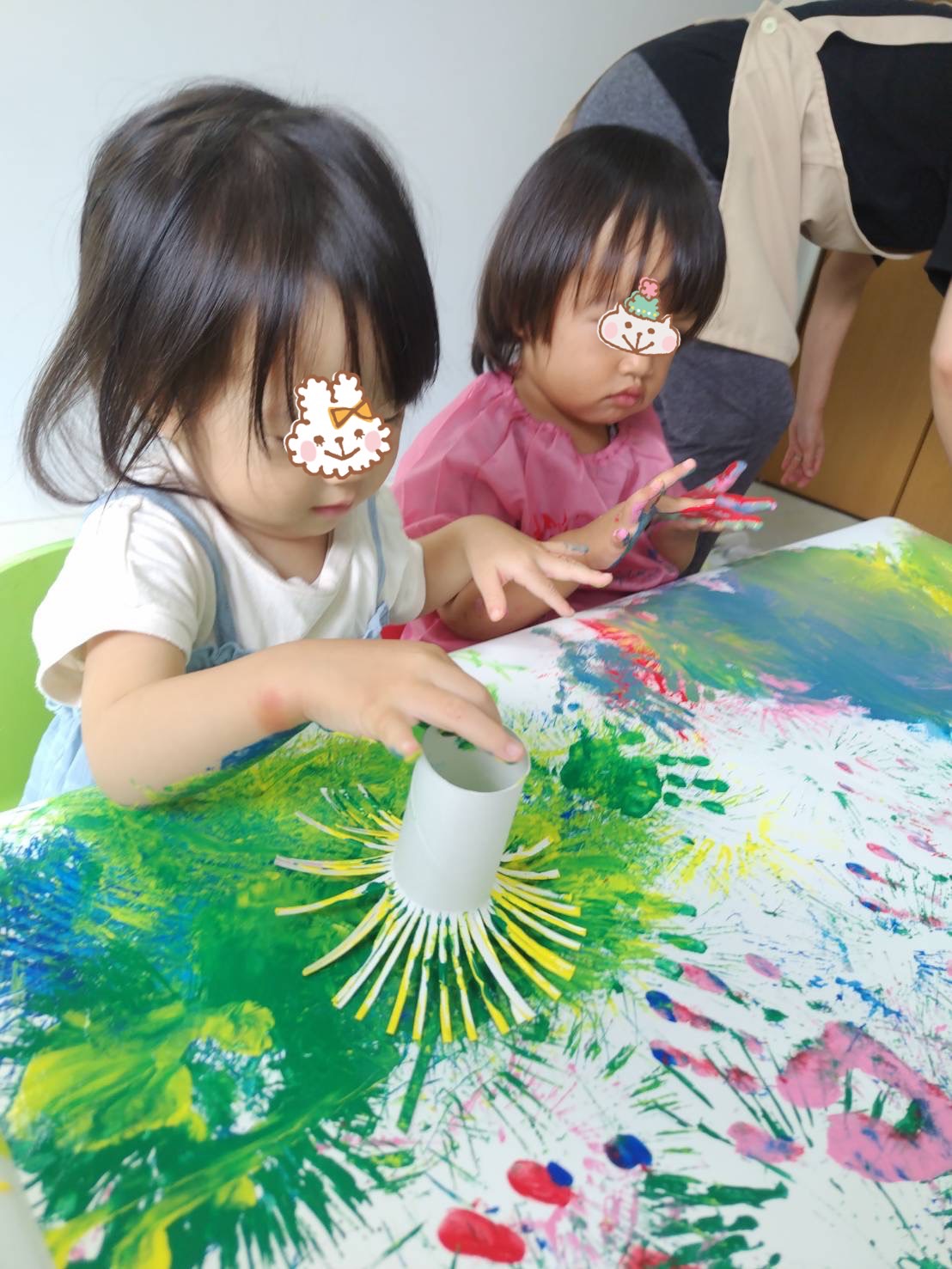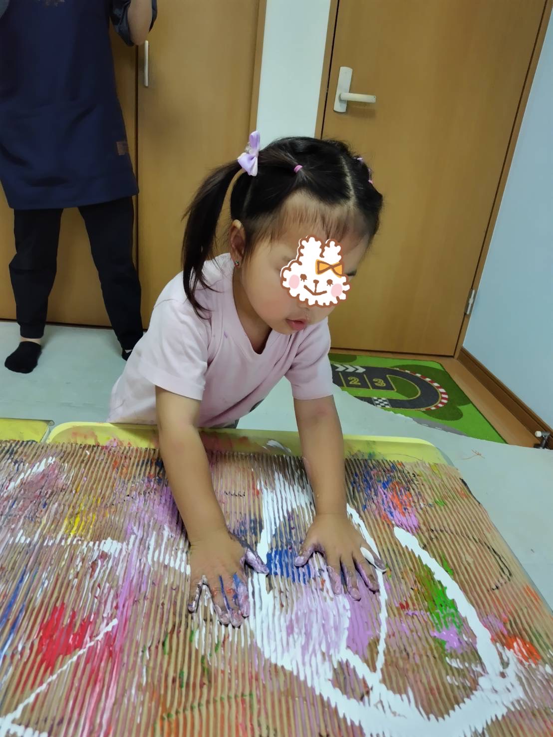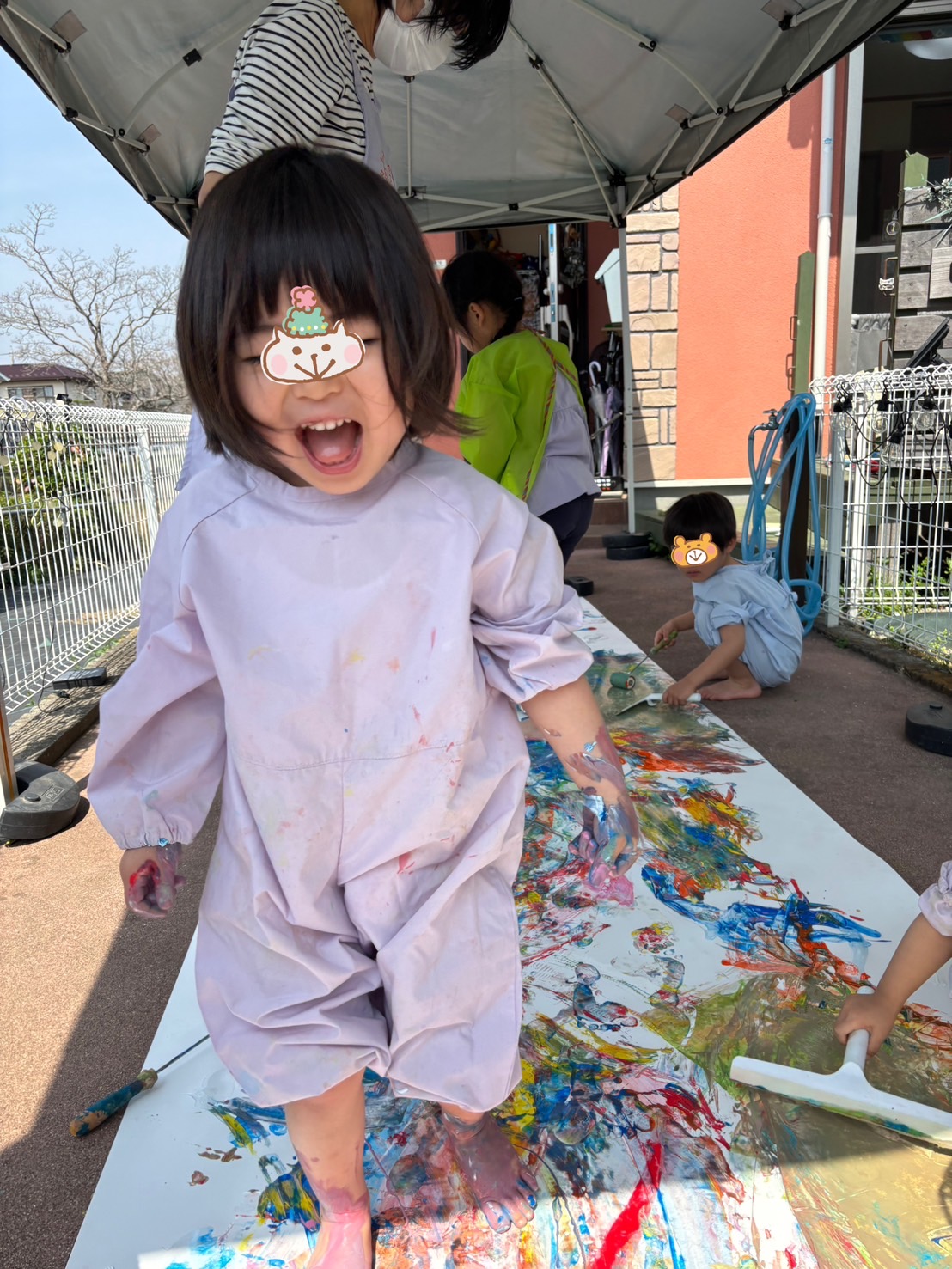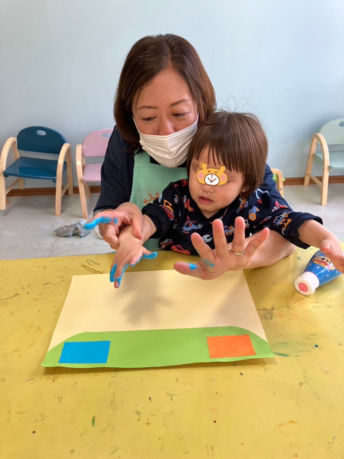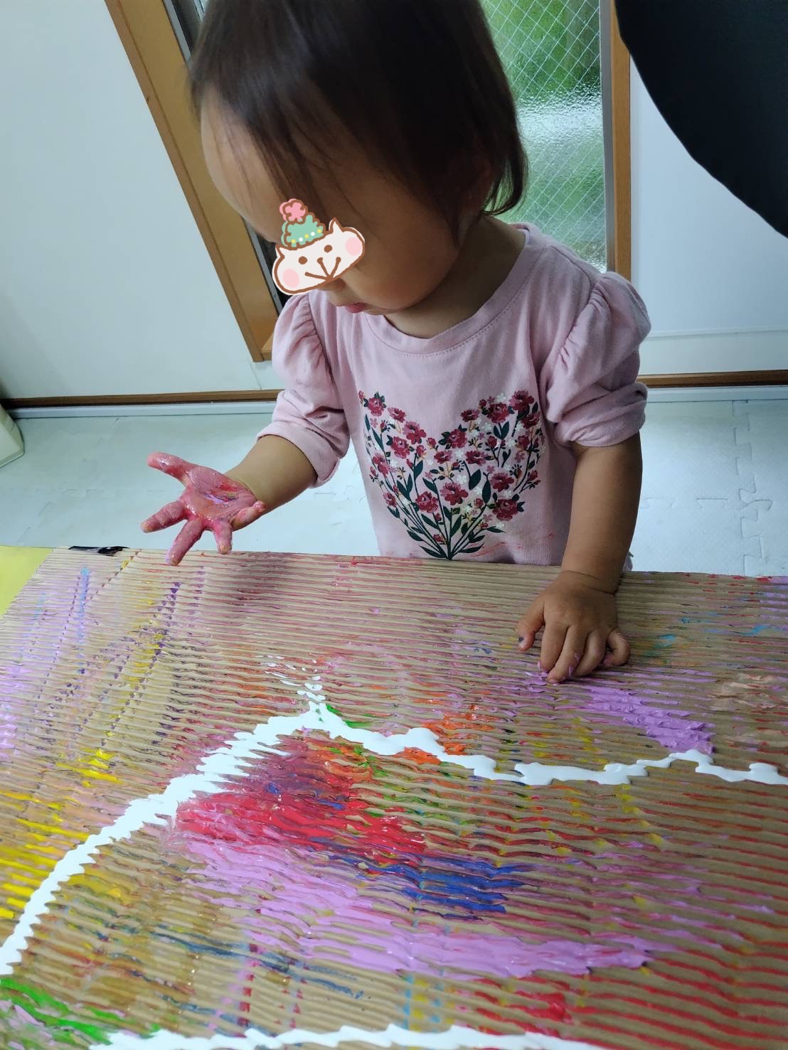 五感をフル回転させながら、途中からは手に色を塗って楽しむ子や、絵の具を混ぜて嬉しそうな子や、これだけ遊んでくれたら、絵の具も喜びます✨