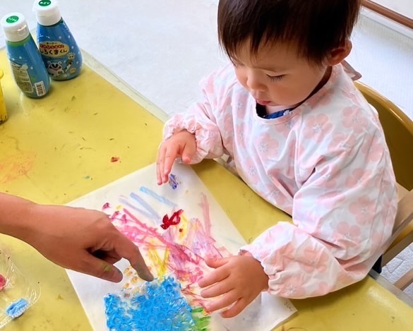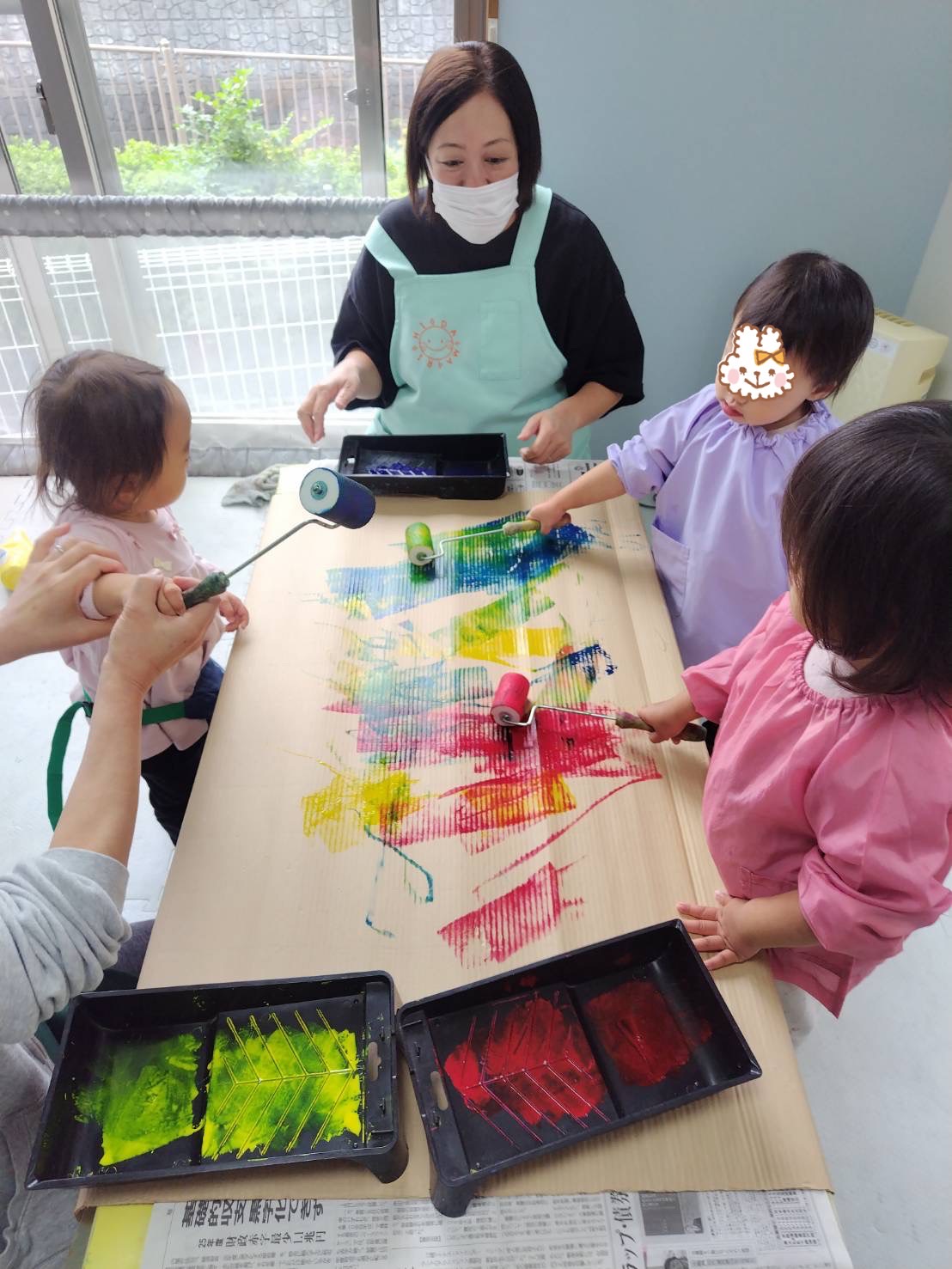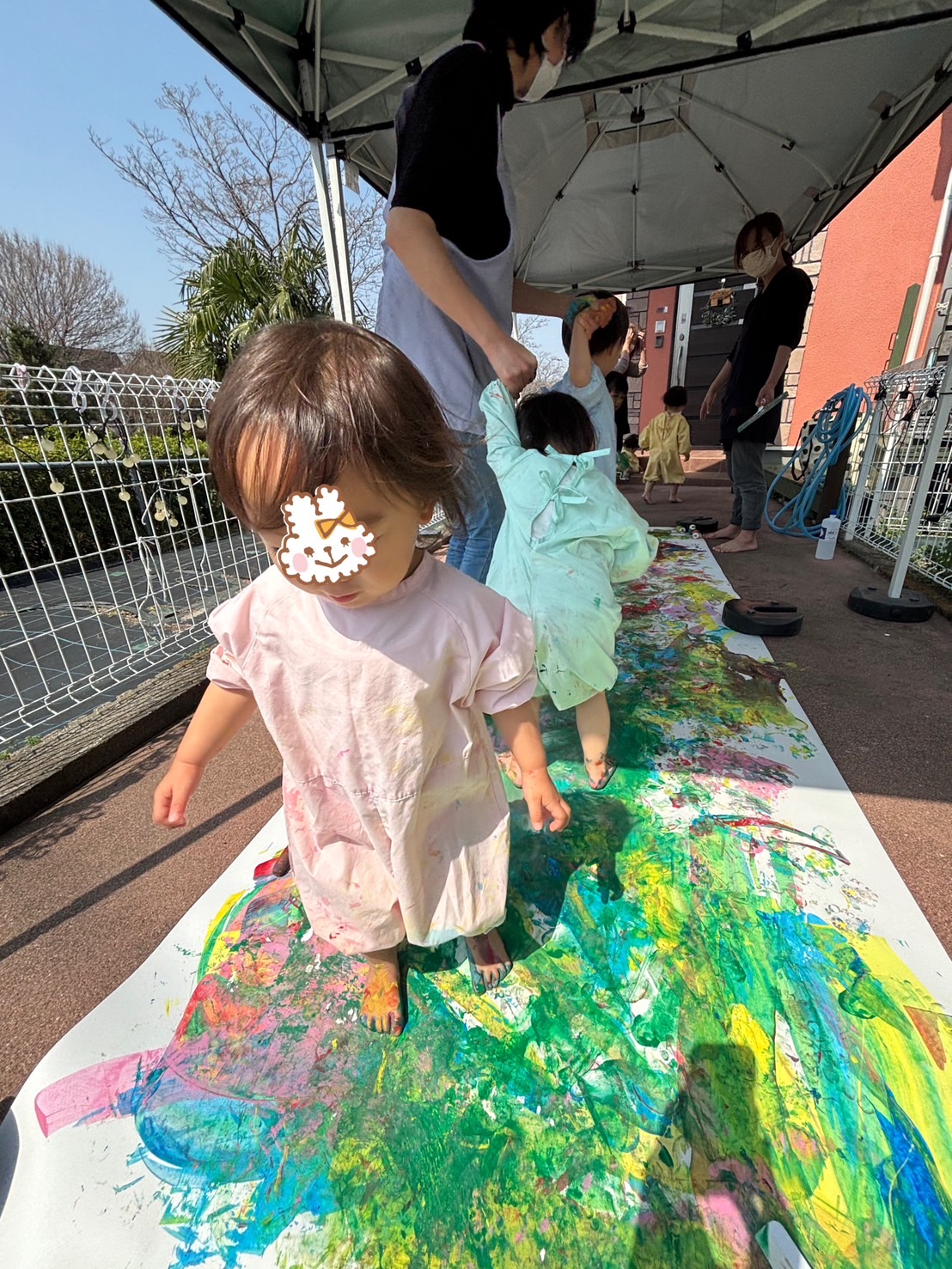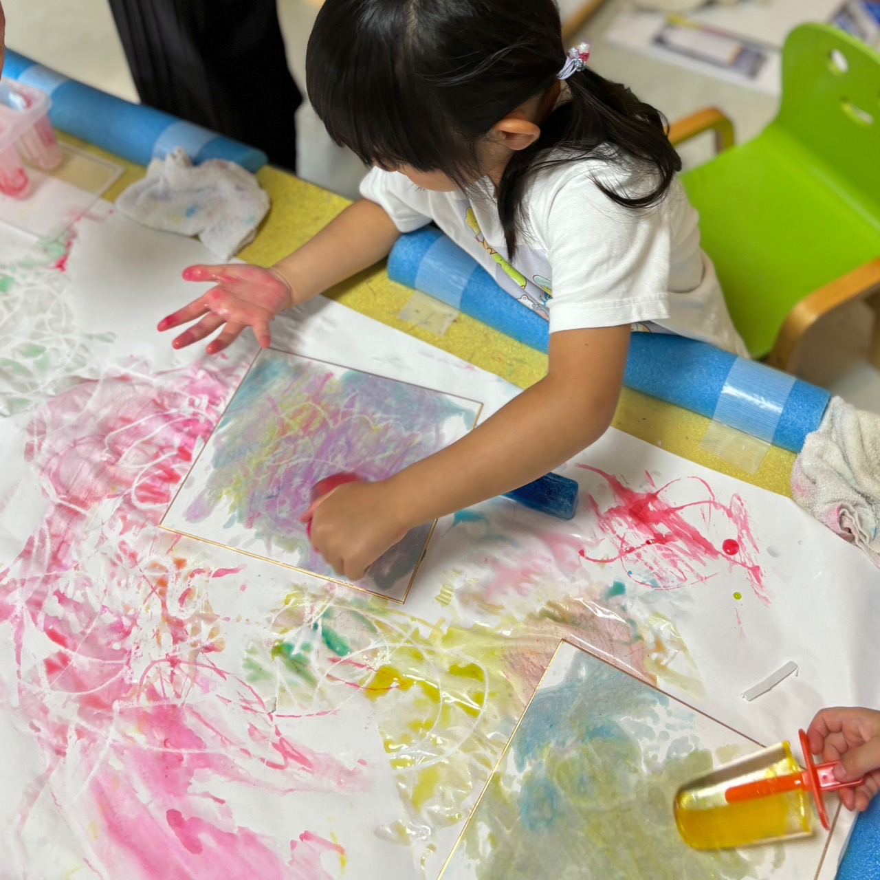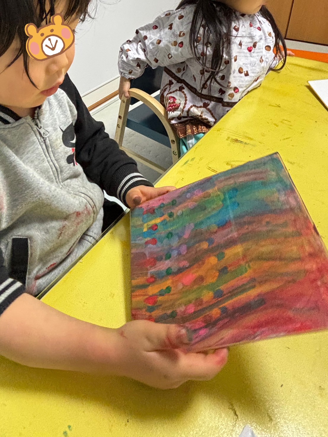 五感をフル回転させながら、途中からは手に色を塗って楽しむ子や、絵の具を混ぜて嬉しそうな子や、これだけ遊んでくれたら、絵の具も喜びます✨