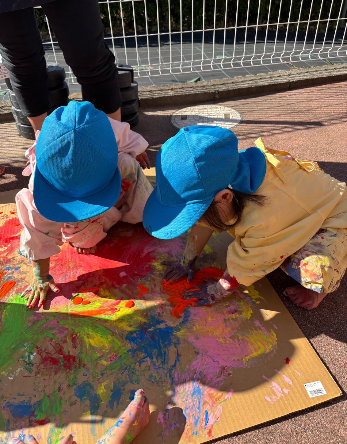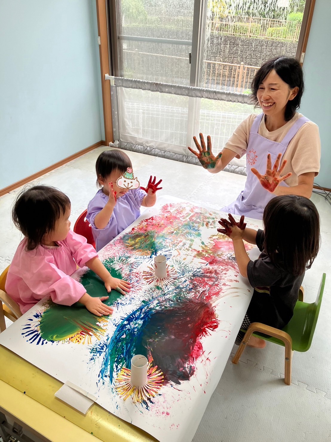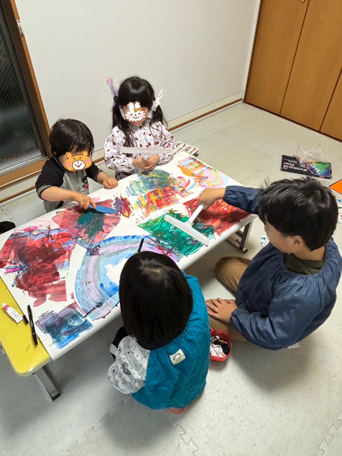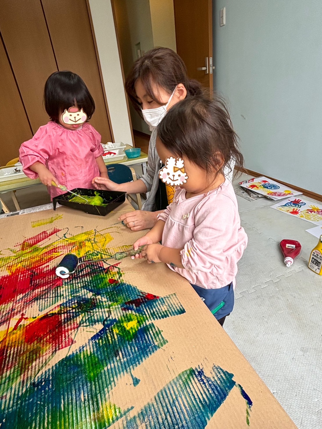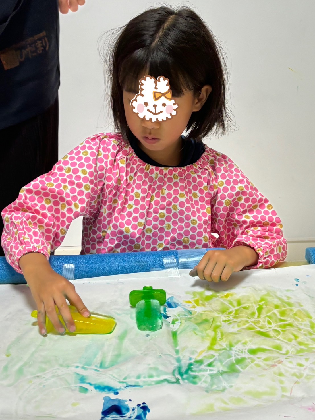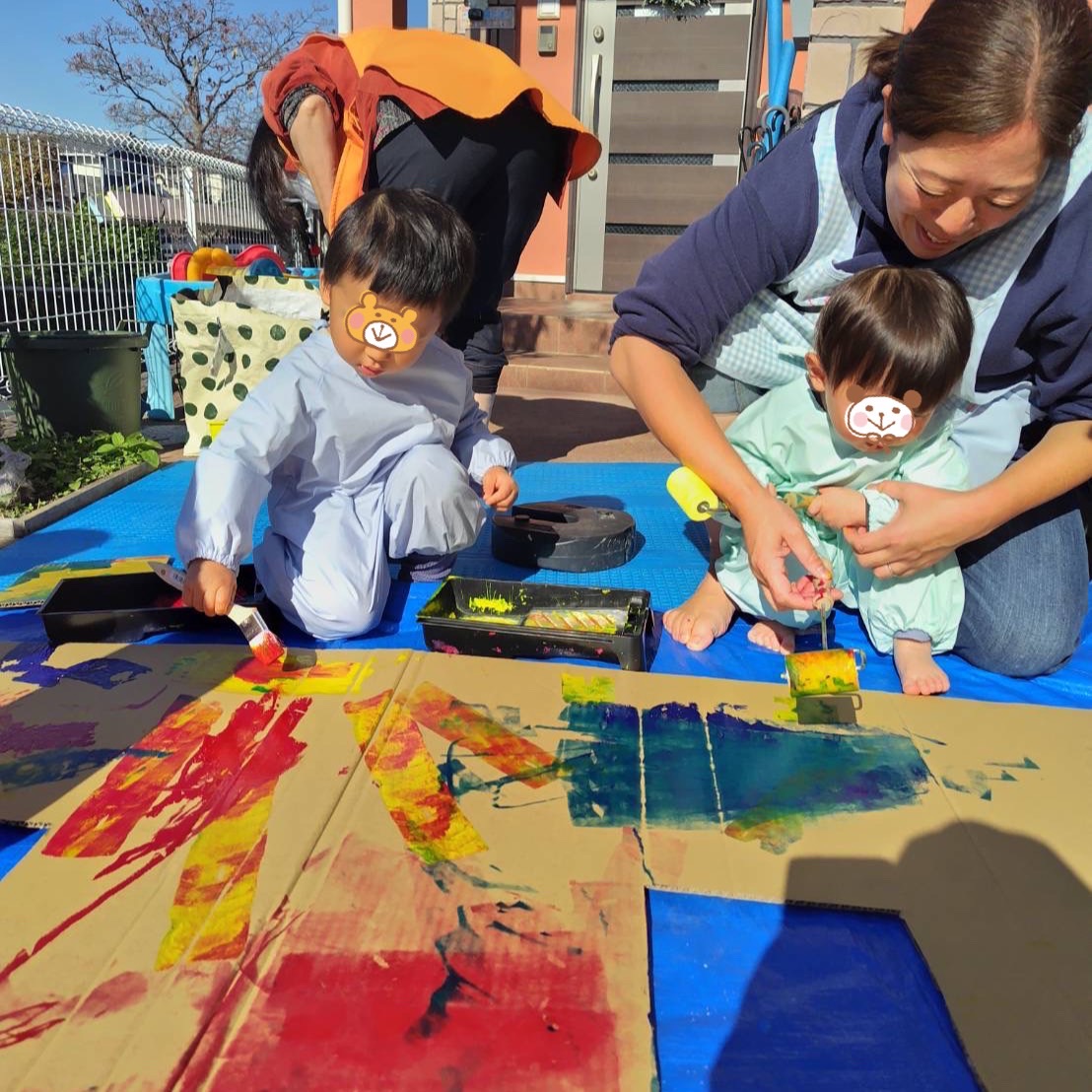 五感をフル回転させながら、途中からは手に色を塗って楽しむ子や、絵の具を混ぜて嬉しそうな子や、これだけ遊んでくれたら、絵の具も喜びます✨