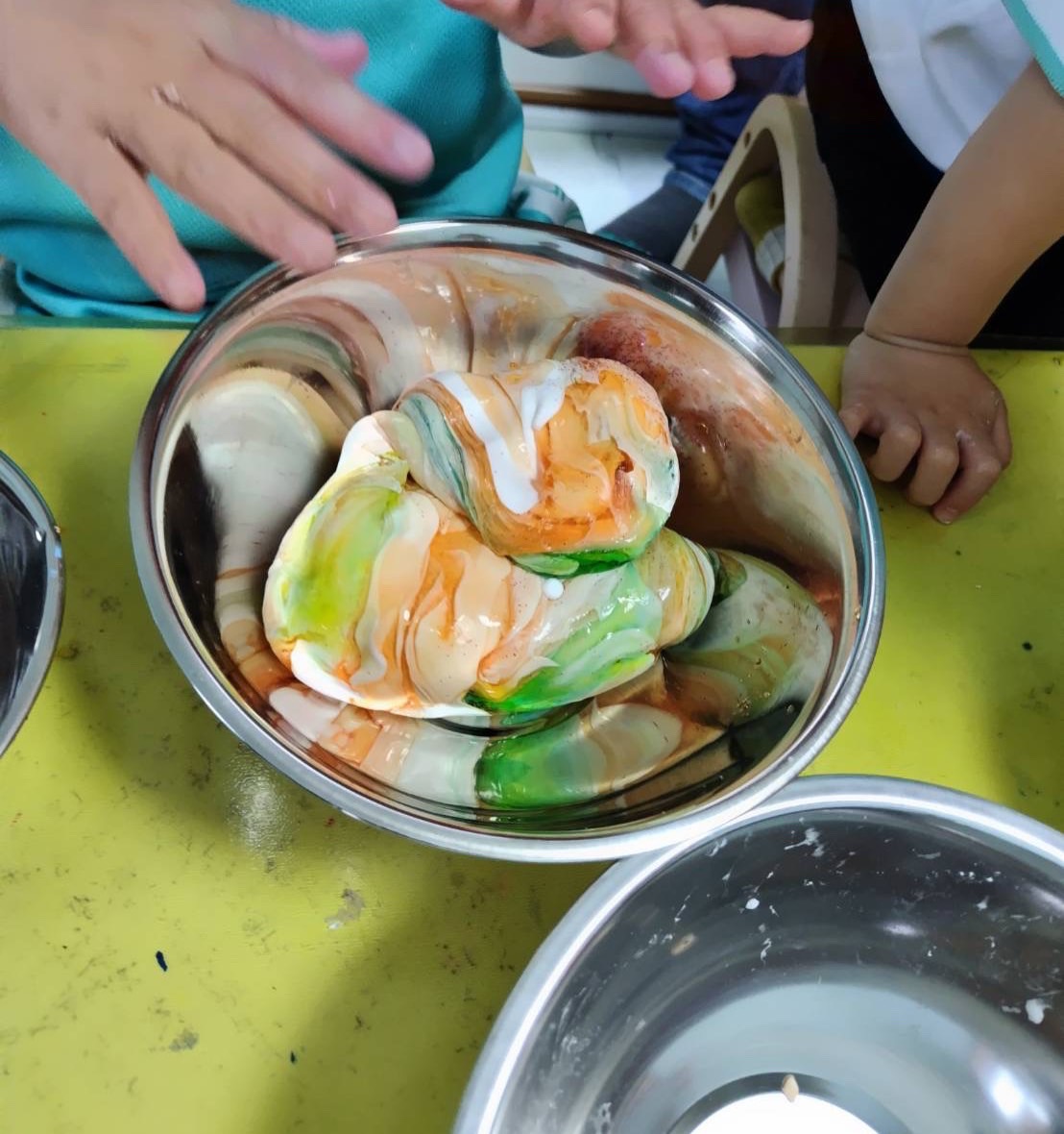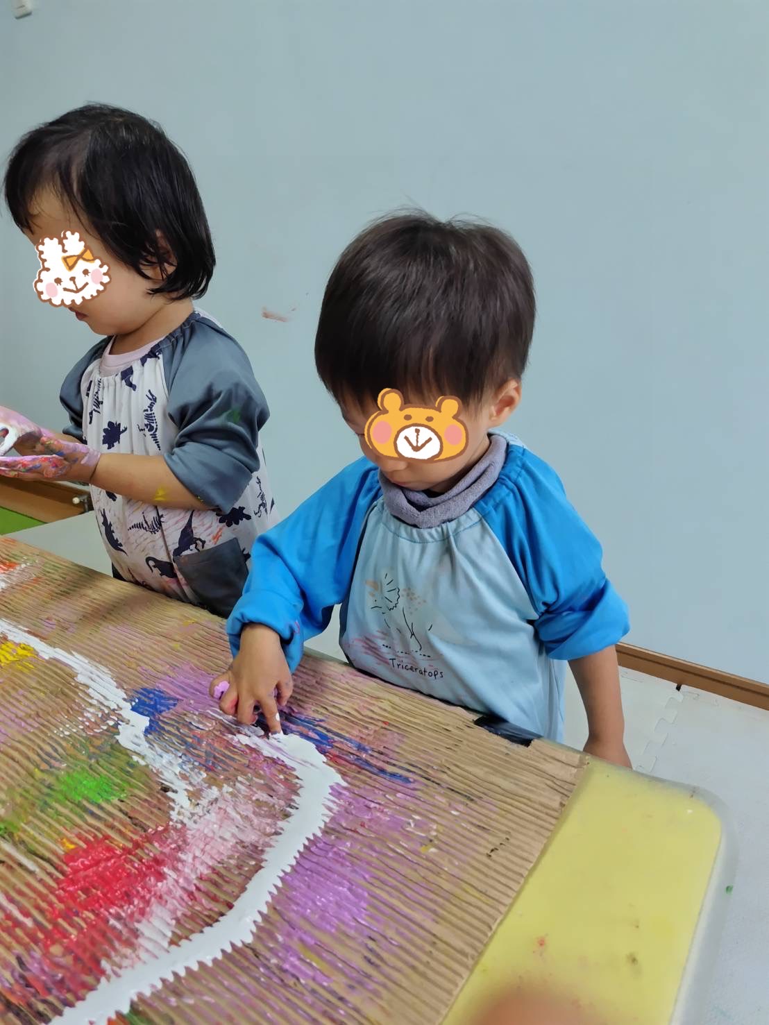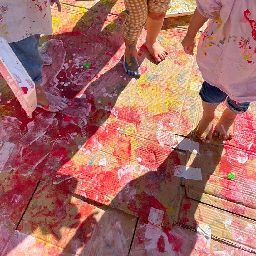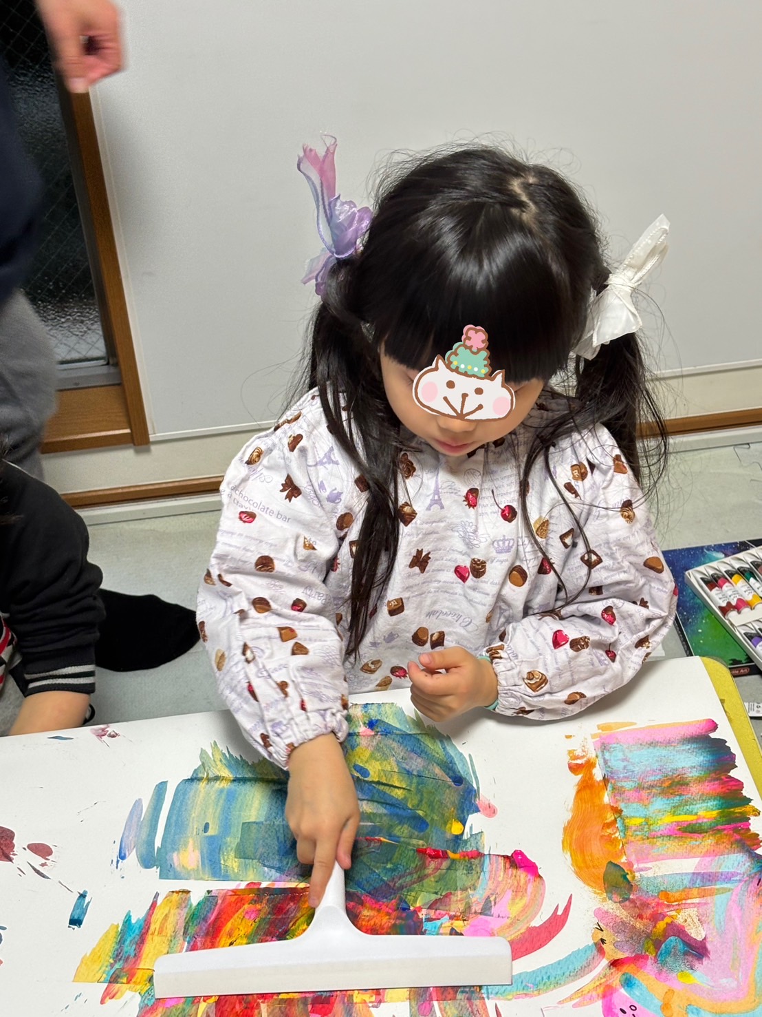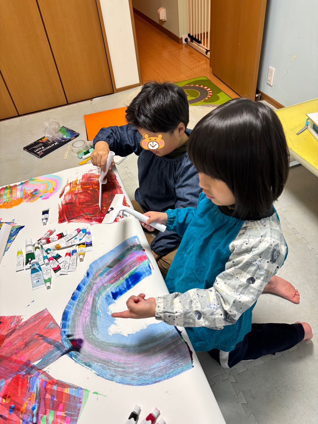 五感をフル回転させながら、途中からは手に色を塗って楽しむ子や、絵の具を混ぜて嬉しそうな子や、これだけ遊んでくれたら、絵の具も喜びます✨