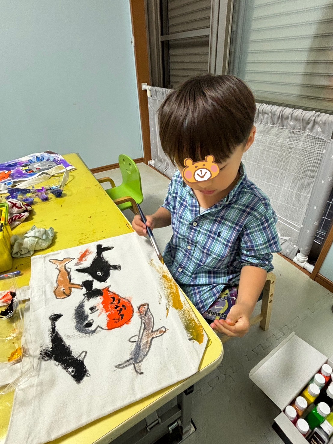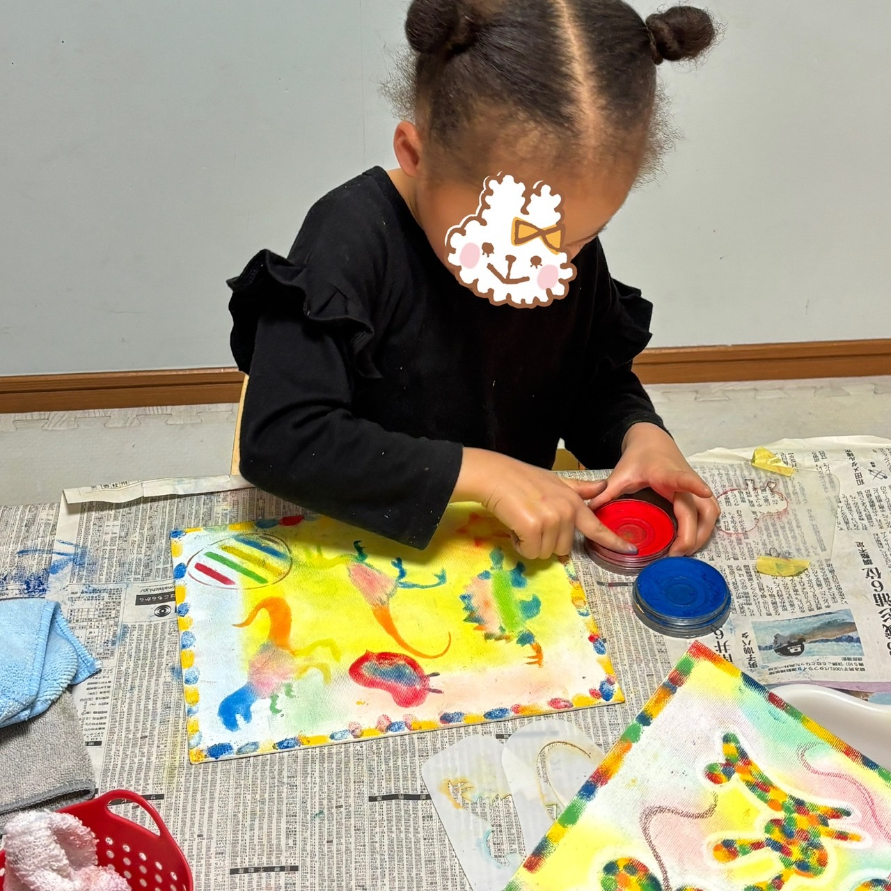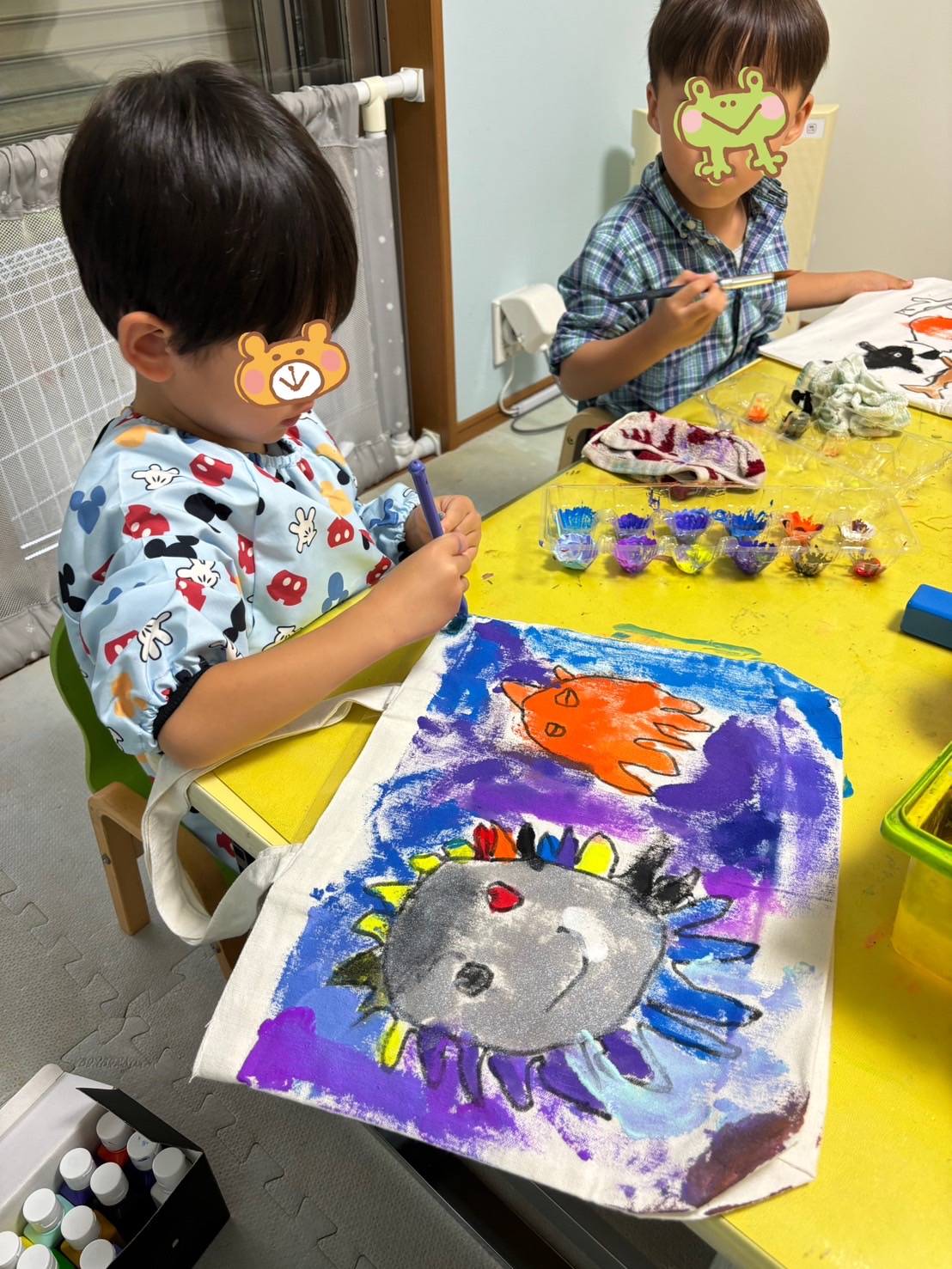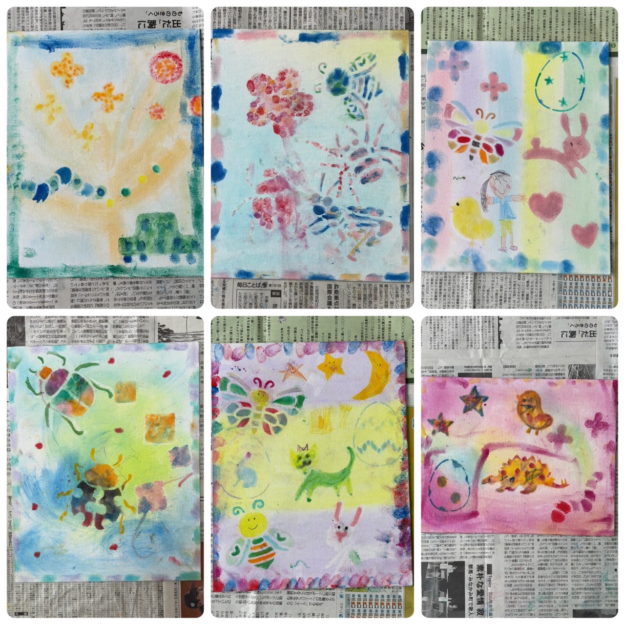 プリント作業が終わった生徒さんたちは、布絵の具で色を少し入れてみたり、私の方で生徒さんたちのイラストを配置換えした紙用の柄に色を塗ったりして、布地、紙地共に完成させていきました✨