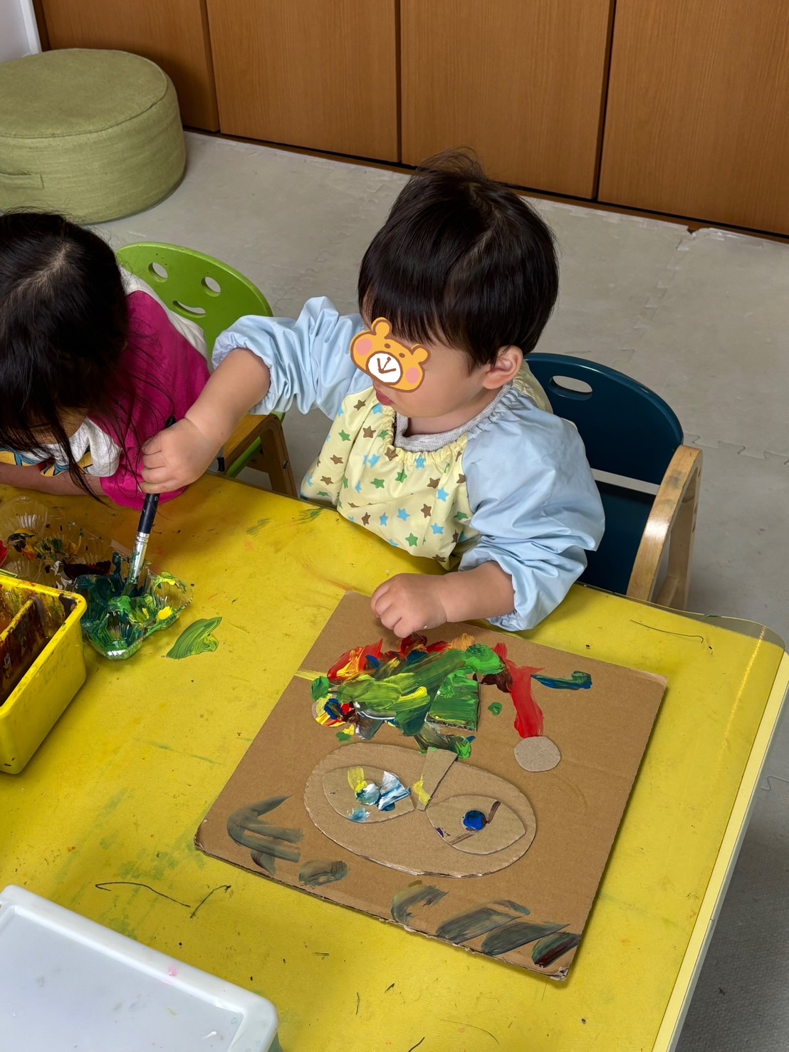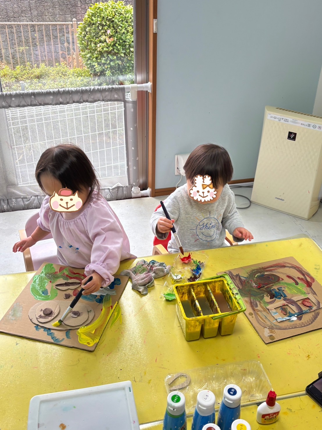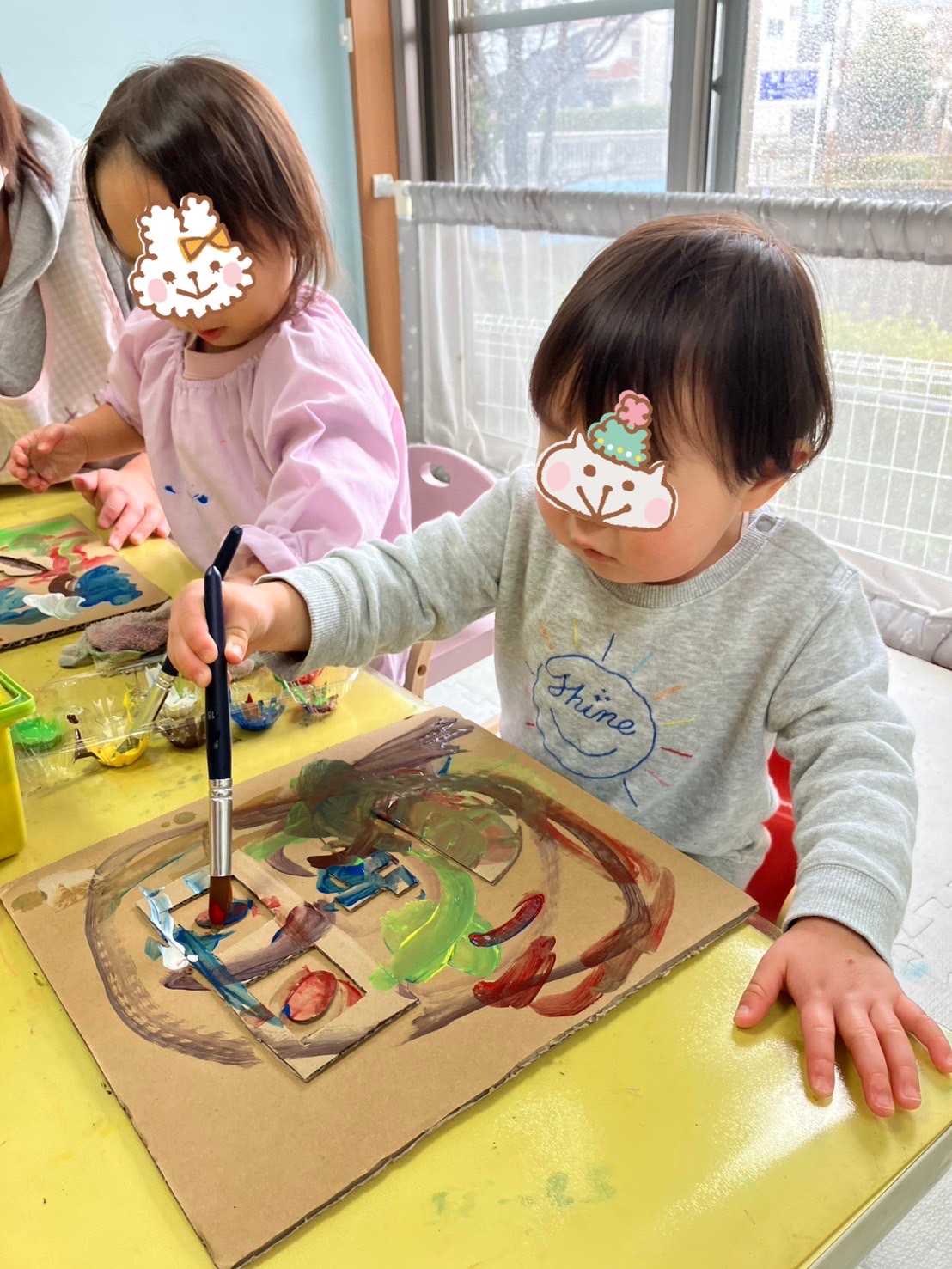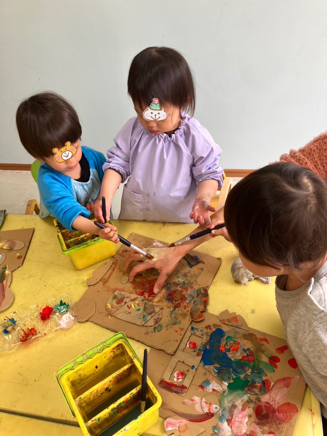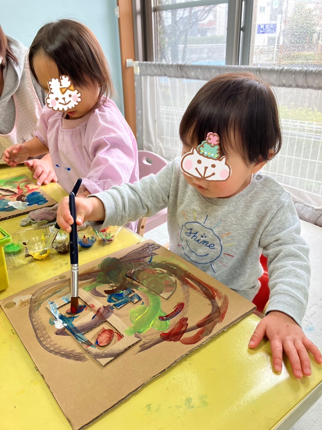 昨年の4月頃は、まだまだ子どもたちが小さくて、まだまだ造形活動は難しい部分がありましたが、今では、絵の具にも慣れて、色塗りの楽しさに目覚めています♪