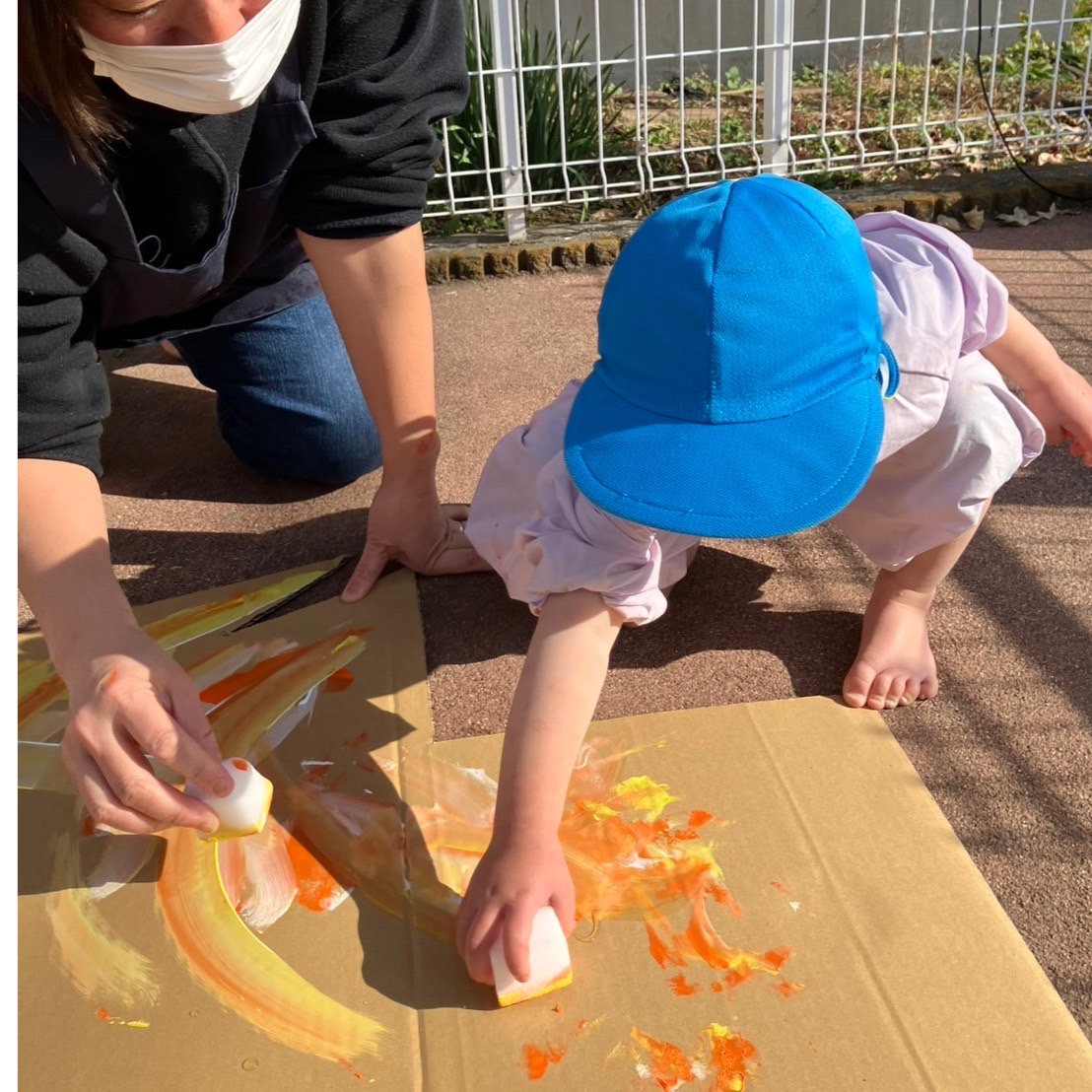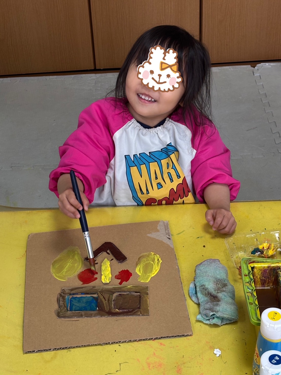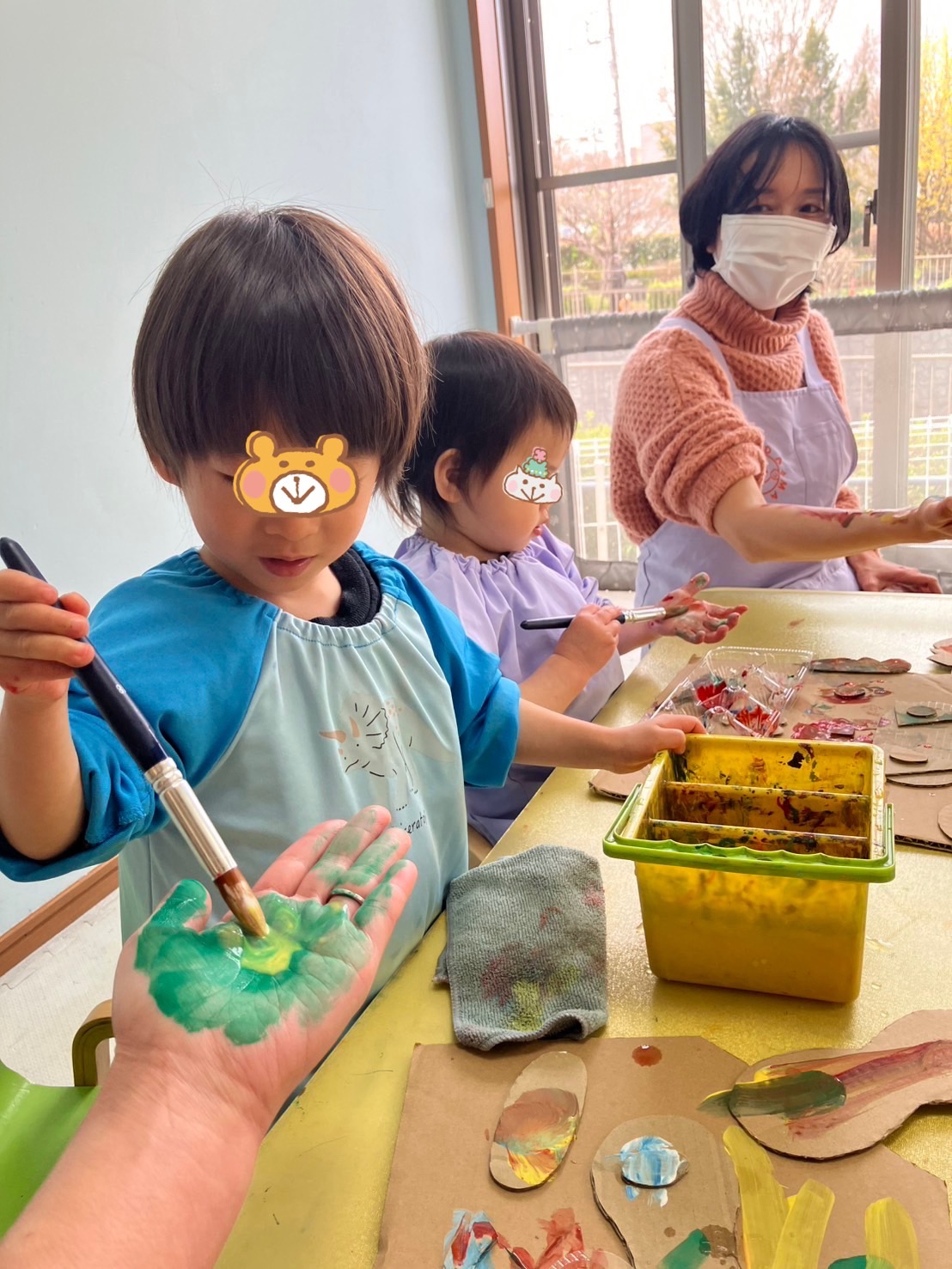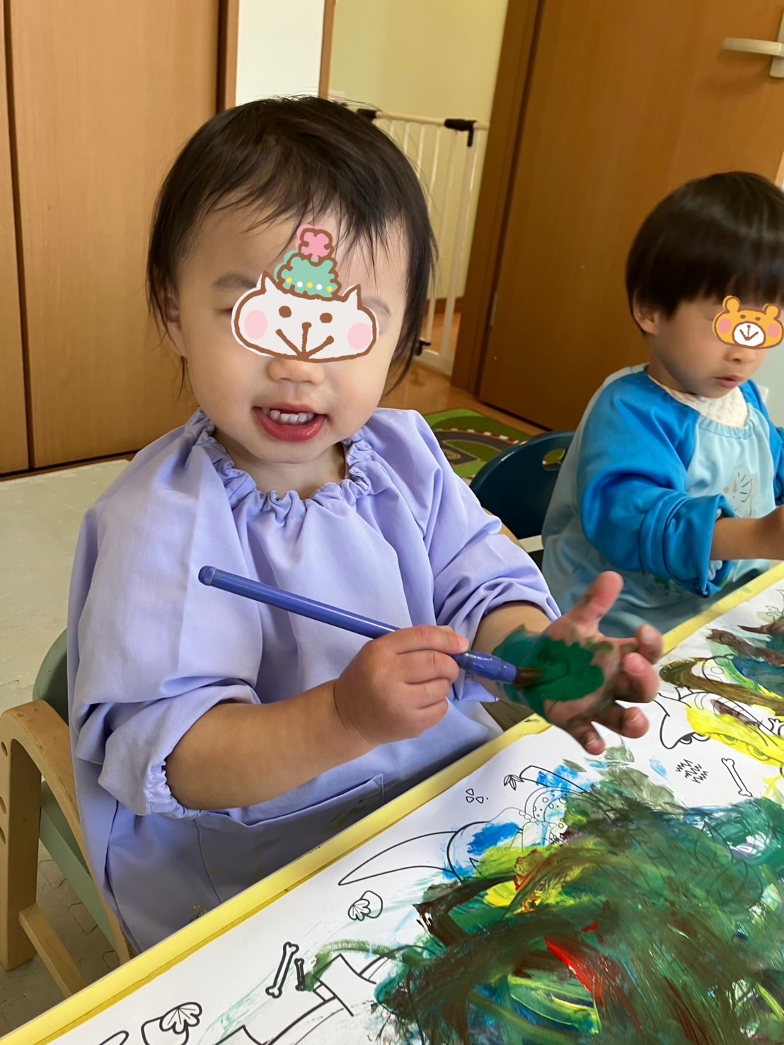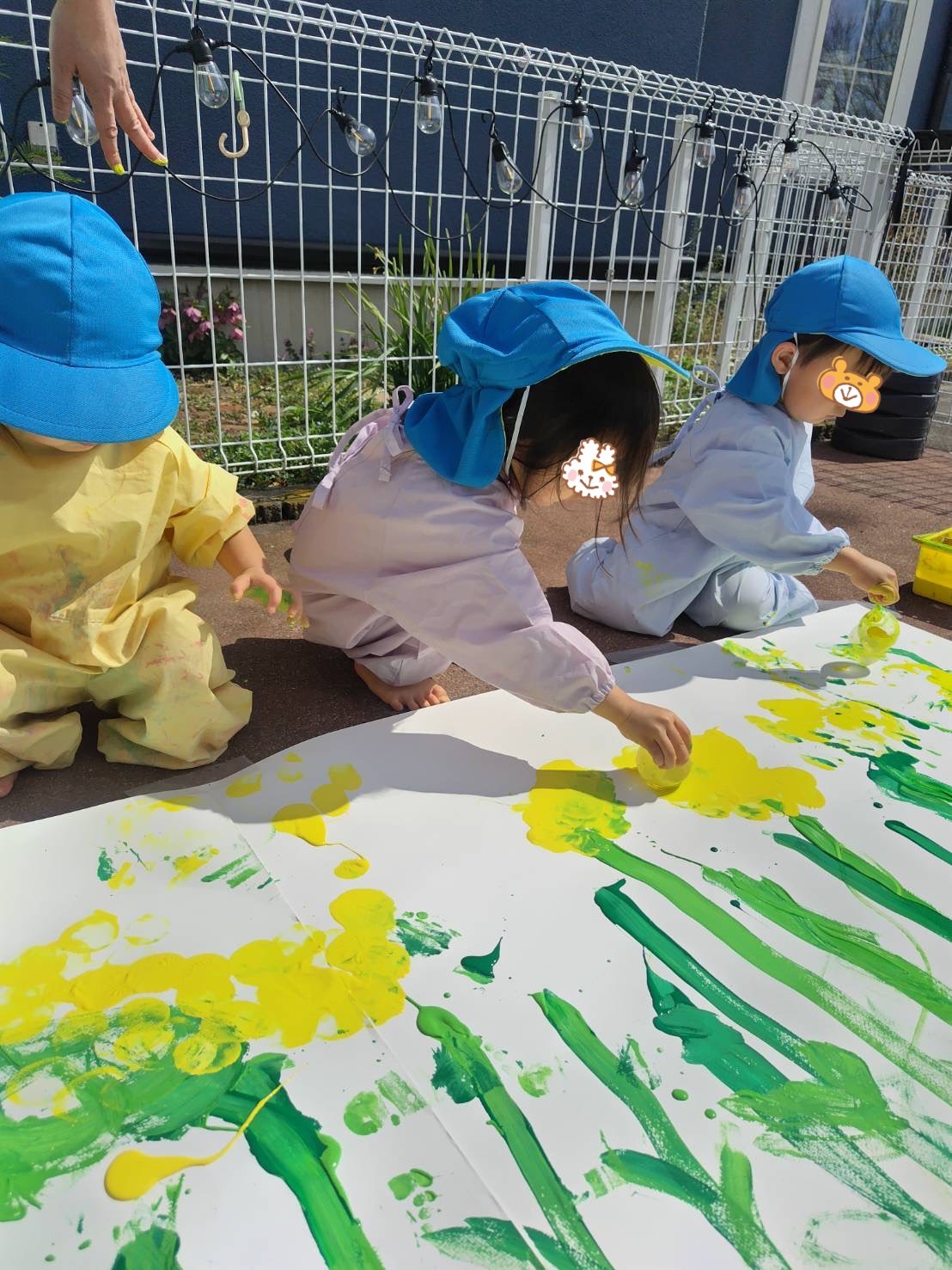 昨年の4月頃は、まだまだ子どもたちが小さくて、まだまだ造形活動は難しい部分がありましたが、今では、絵の具にも慣れて、色塗りの楽しさに目覚めています♪