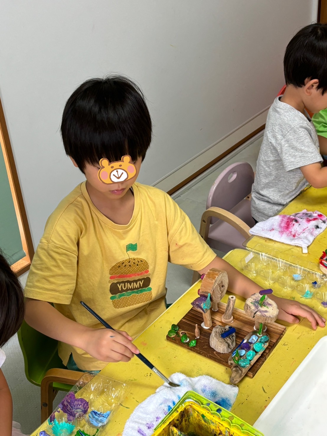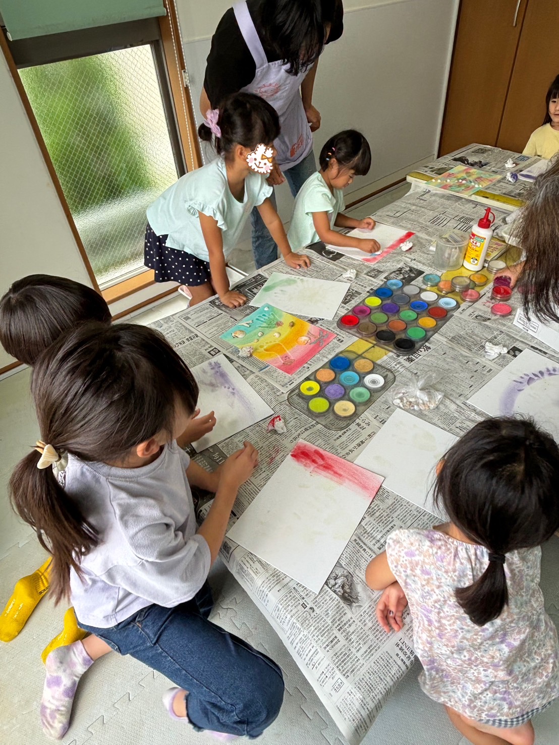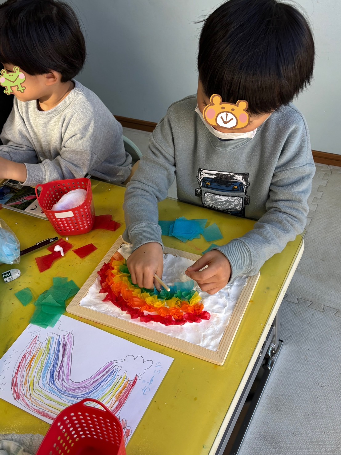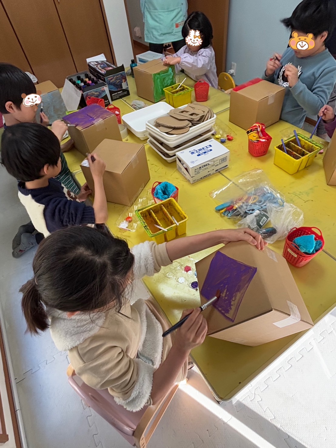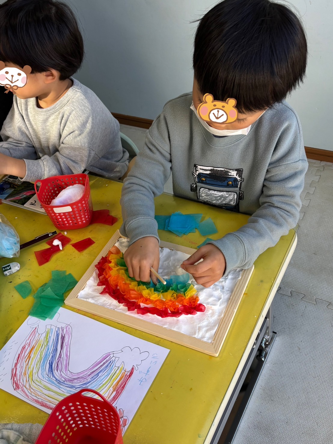 昨年の4月頃は、まだまだ子どもたちが小さくて、まだまだ造形活動は難しい部分がありましたが、今では、絵の具にも慣れて、色塗りの楽しさに目覚めています♪