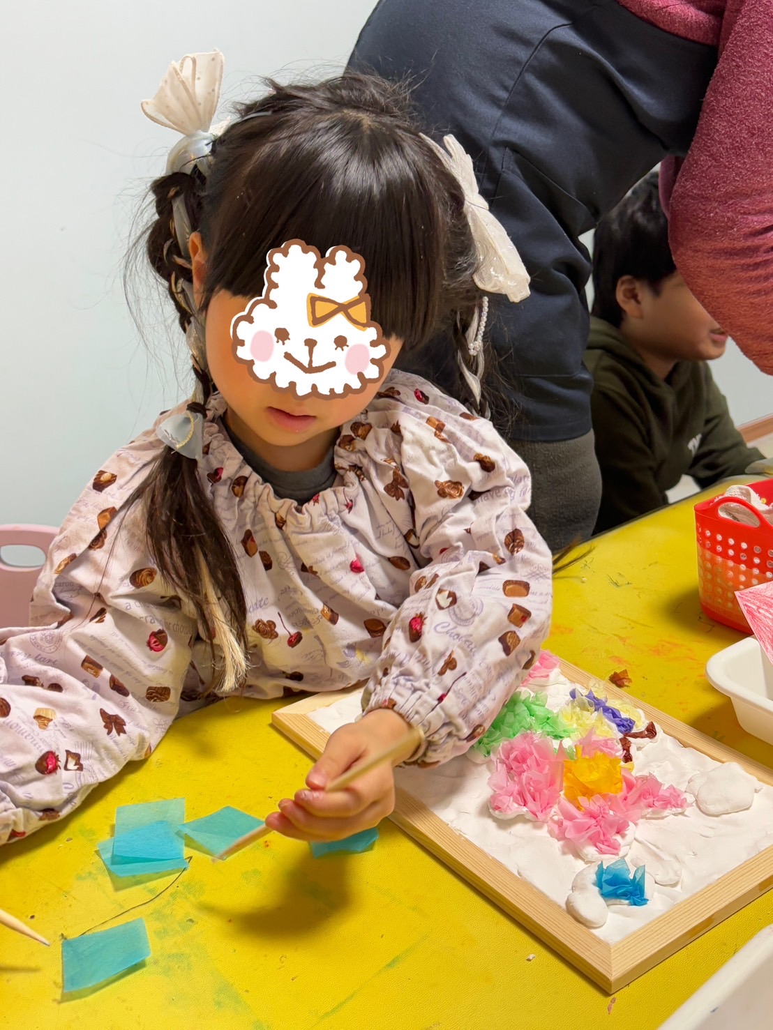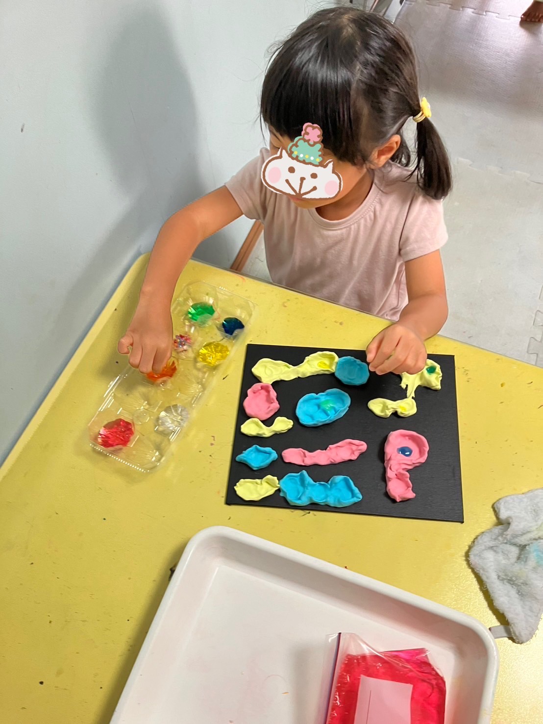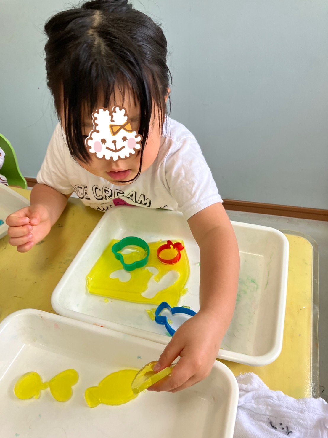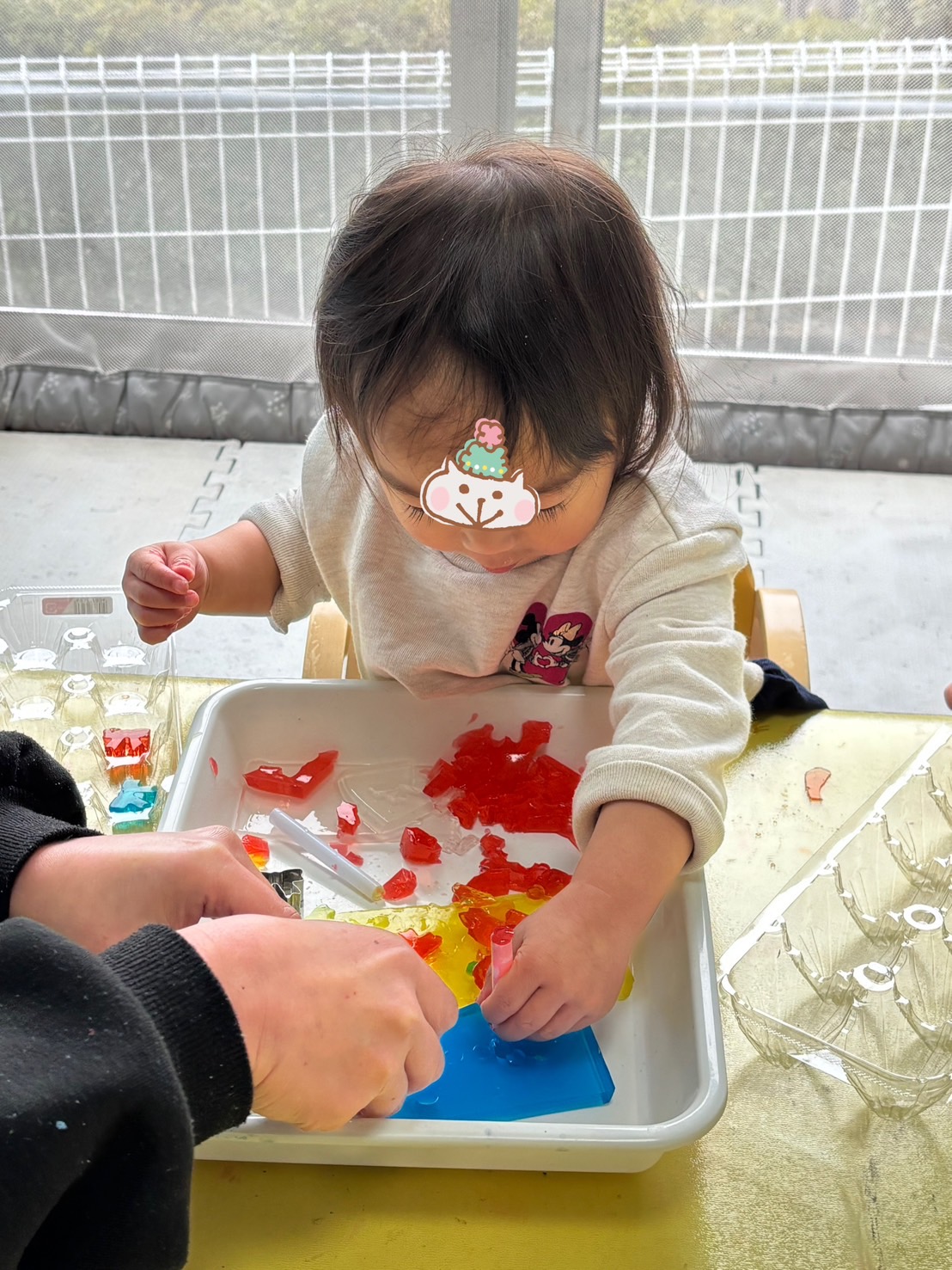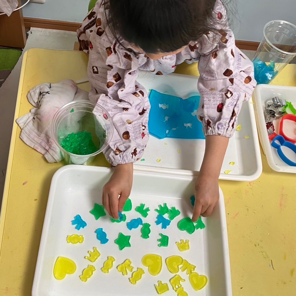 寒天の冷たい感触や、きれいな色に触れ、型抜きしてそーっと壊れないように剥がしたり、細かく切り刻んだり。。それを材料にして、四角いシートの中で飾り付けしながら一枚のアート作品を作りました✨
