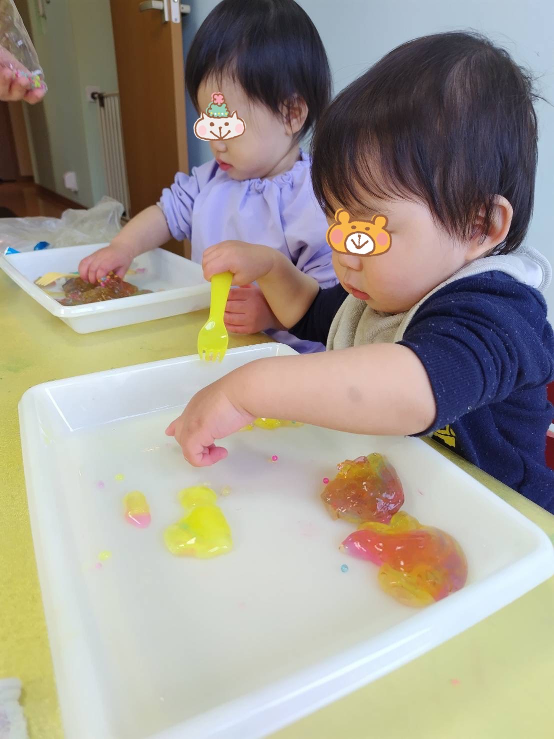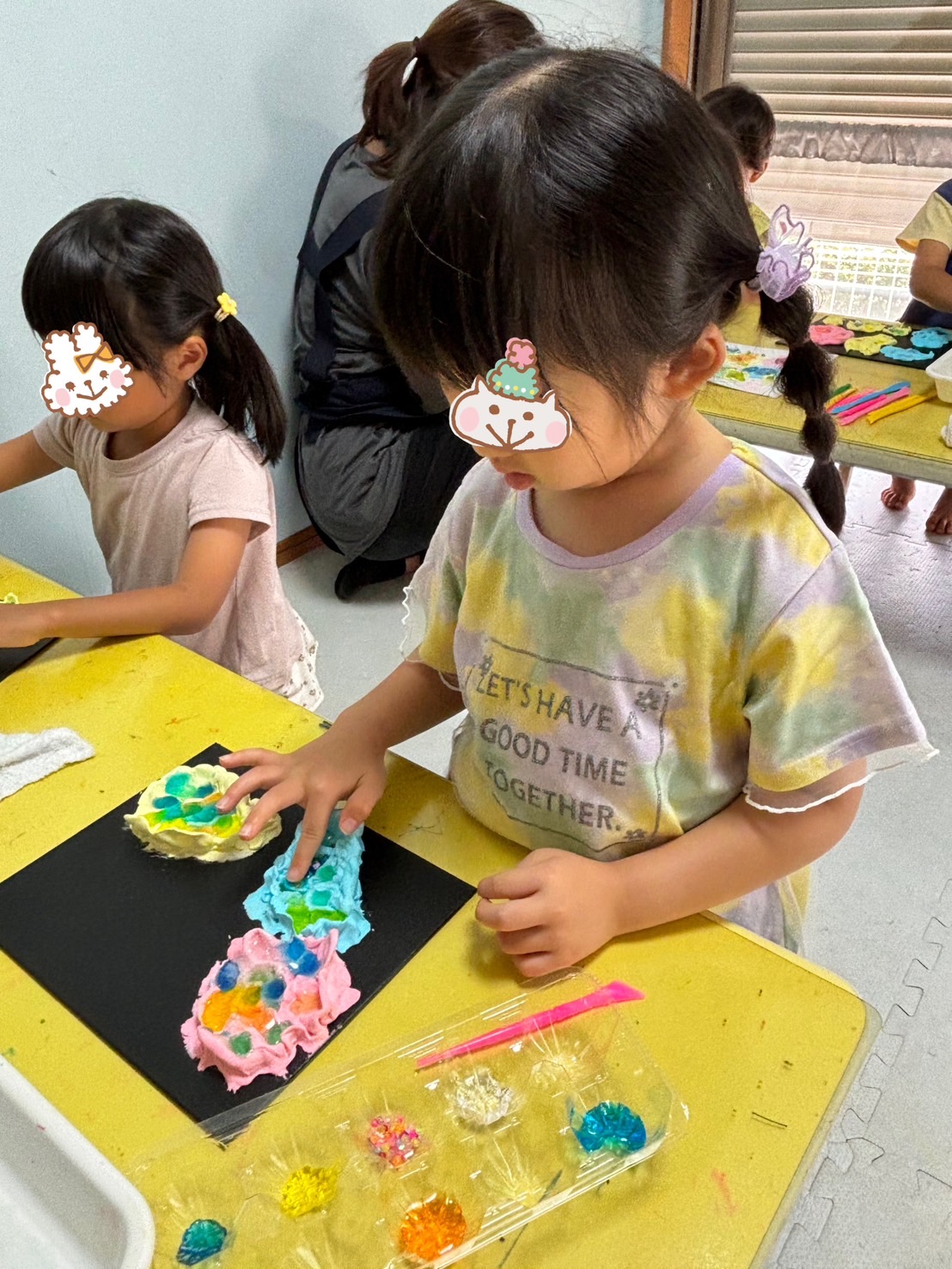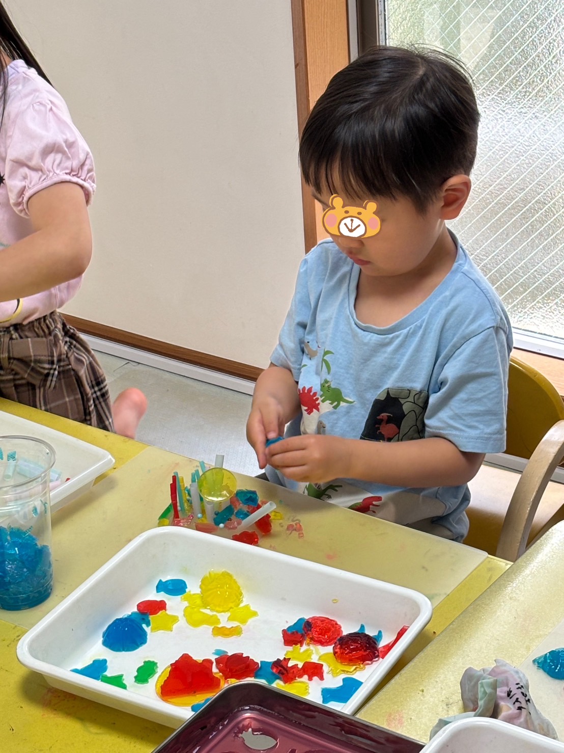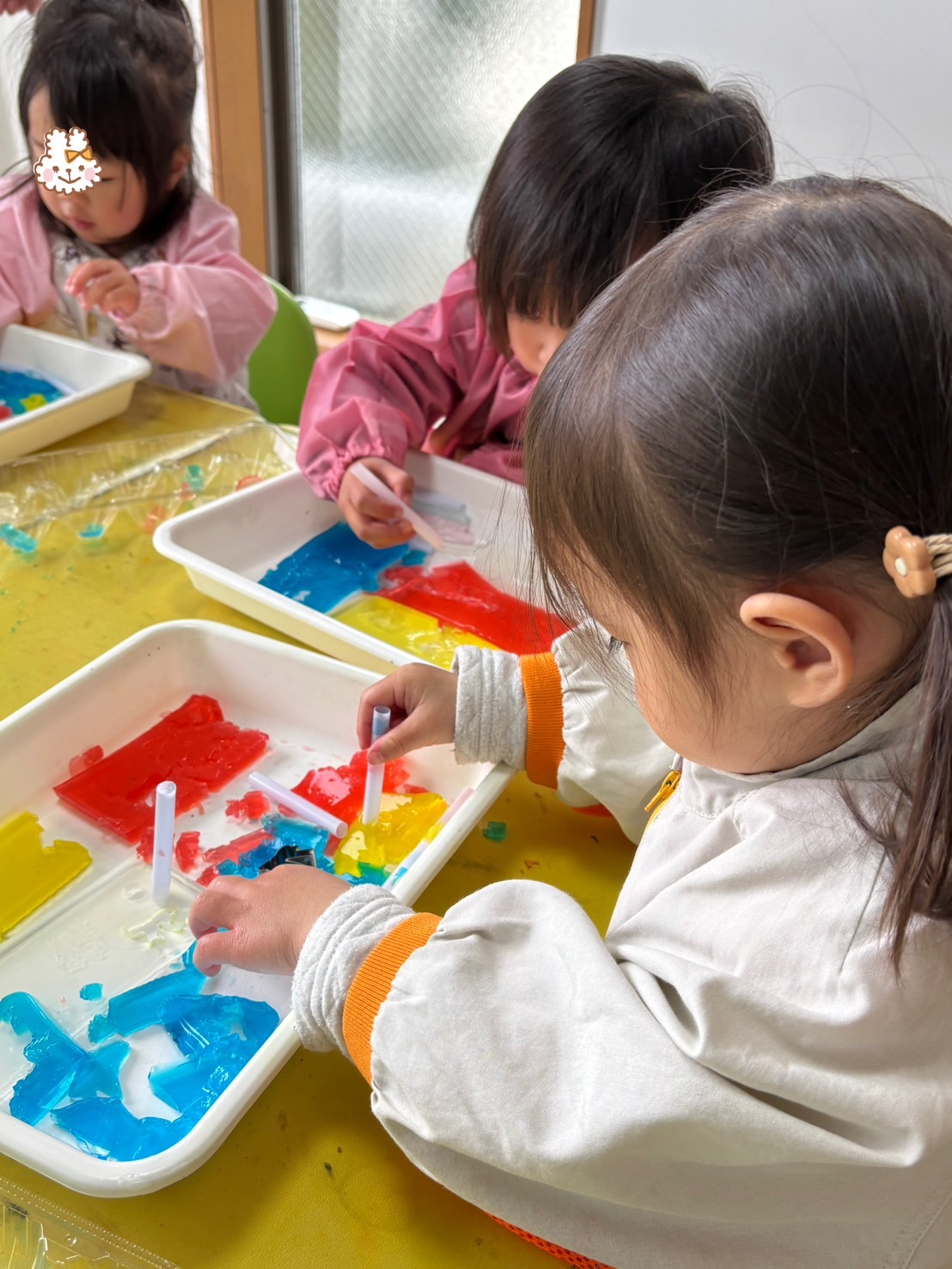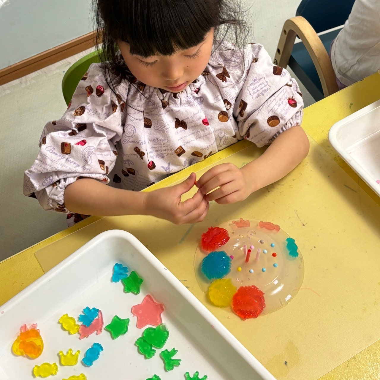 寒天の冷たい感触や、きれいな色に触れ、型抜きしてそーっと壊れないように剥がしたり、細かく切り刻んだり。。それを材料にして、四角いシートの中で飾り付けしながら一枚のアート作品を作りました✨