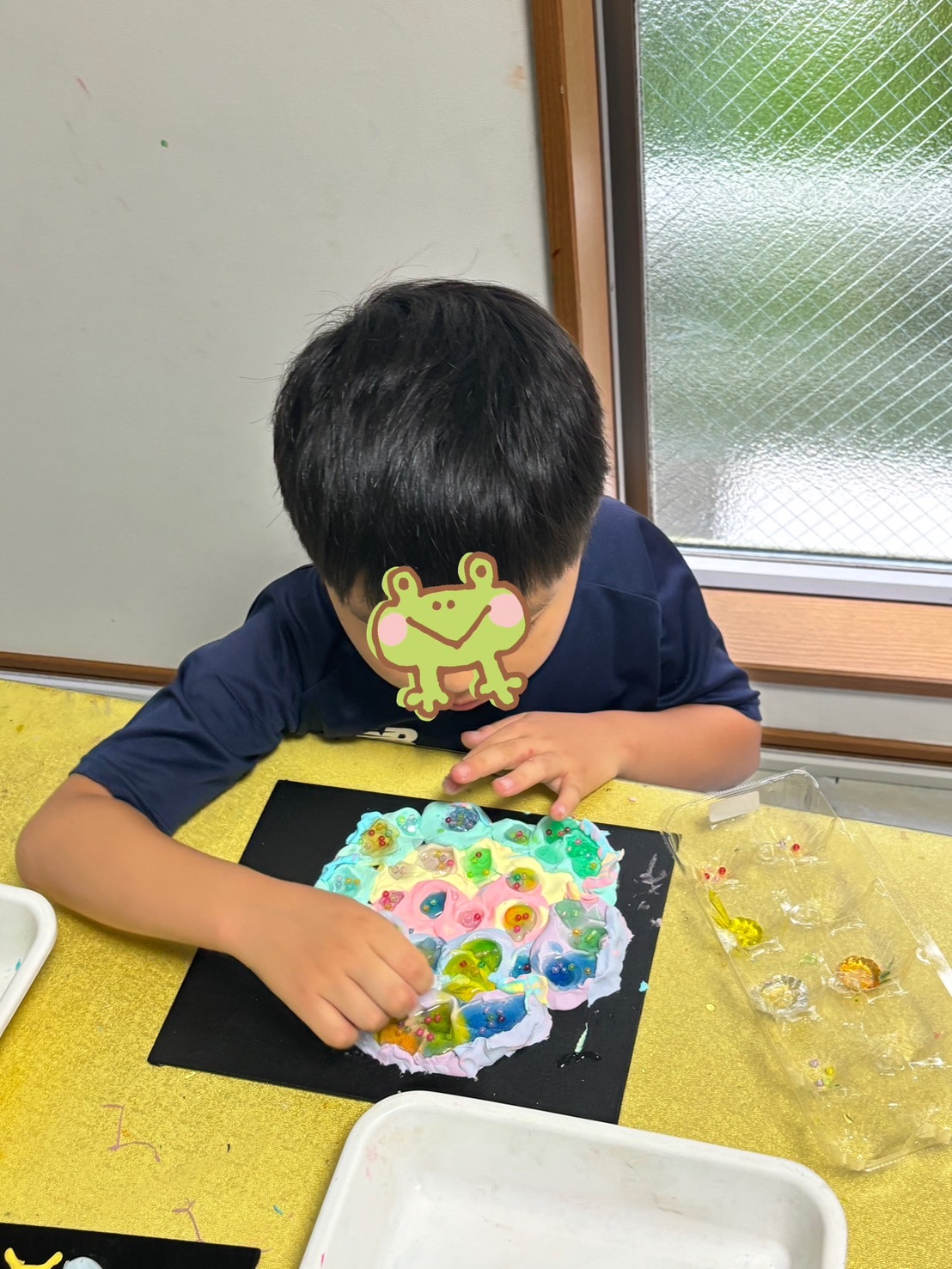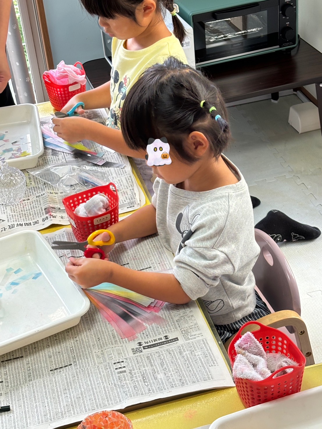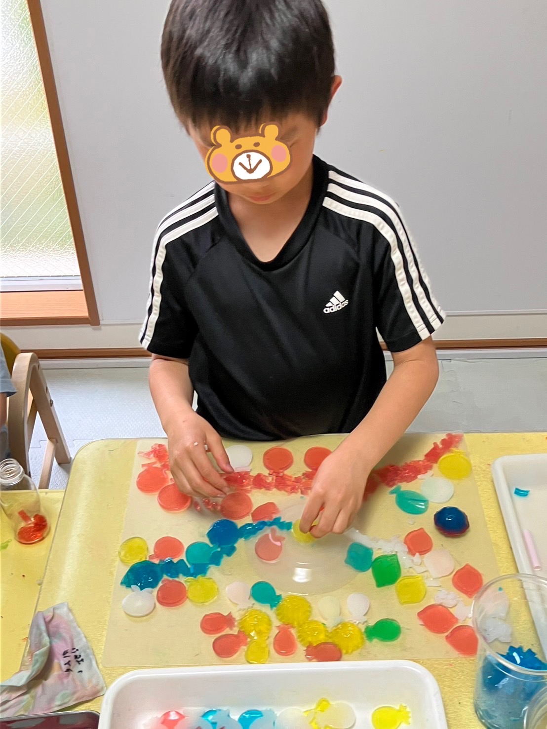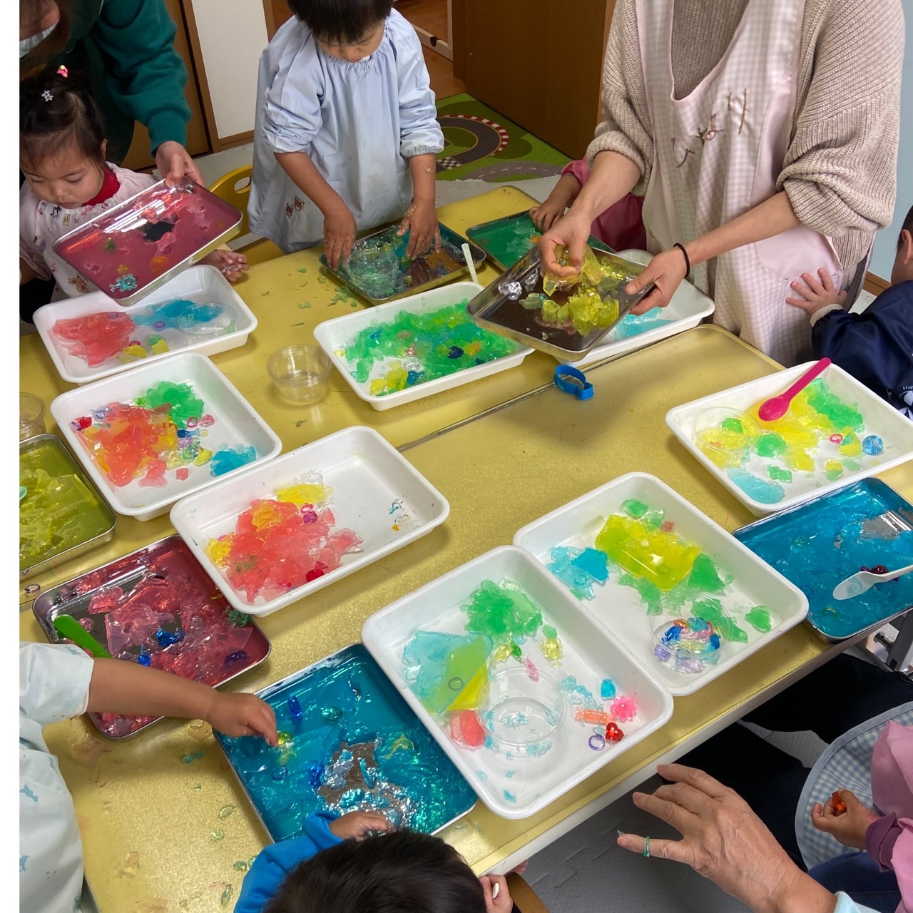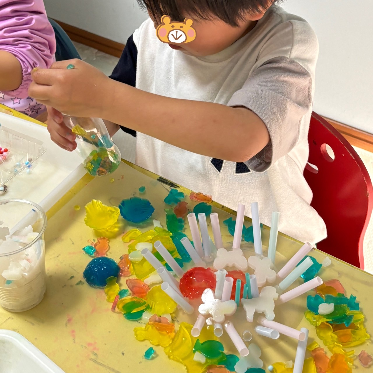 寒天の冷たい感触や、きれいな色に触れ、型抜きしてそーっと壊れないように剥がしたり、細かく切り刻んだり。。それを材料にして、四角いシートの中で飾り付けしながら一枚のアート作品を作りました✨