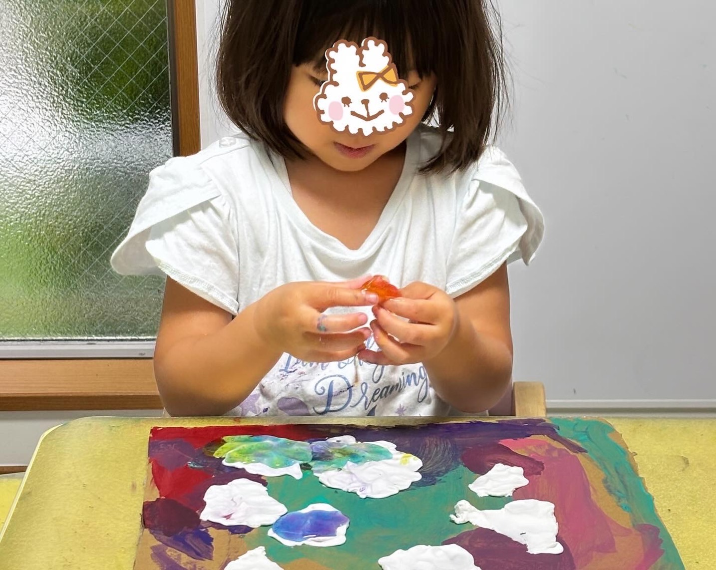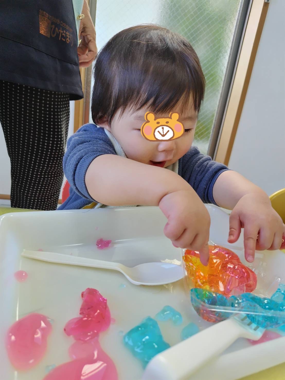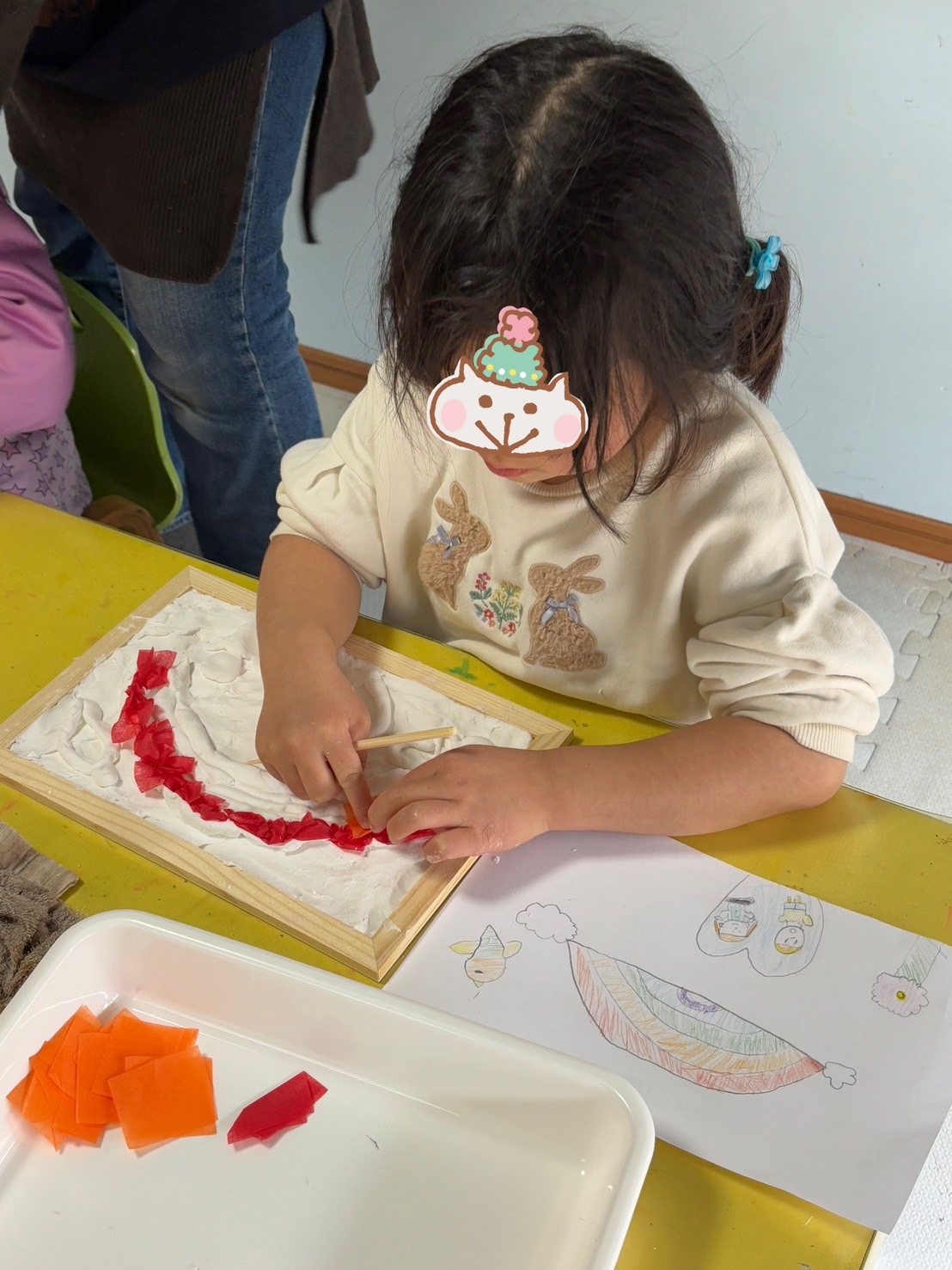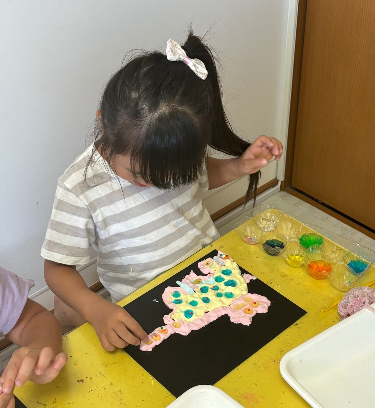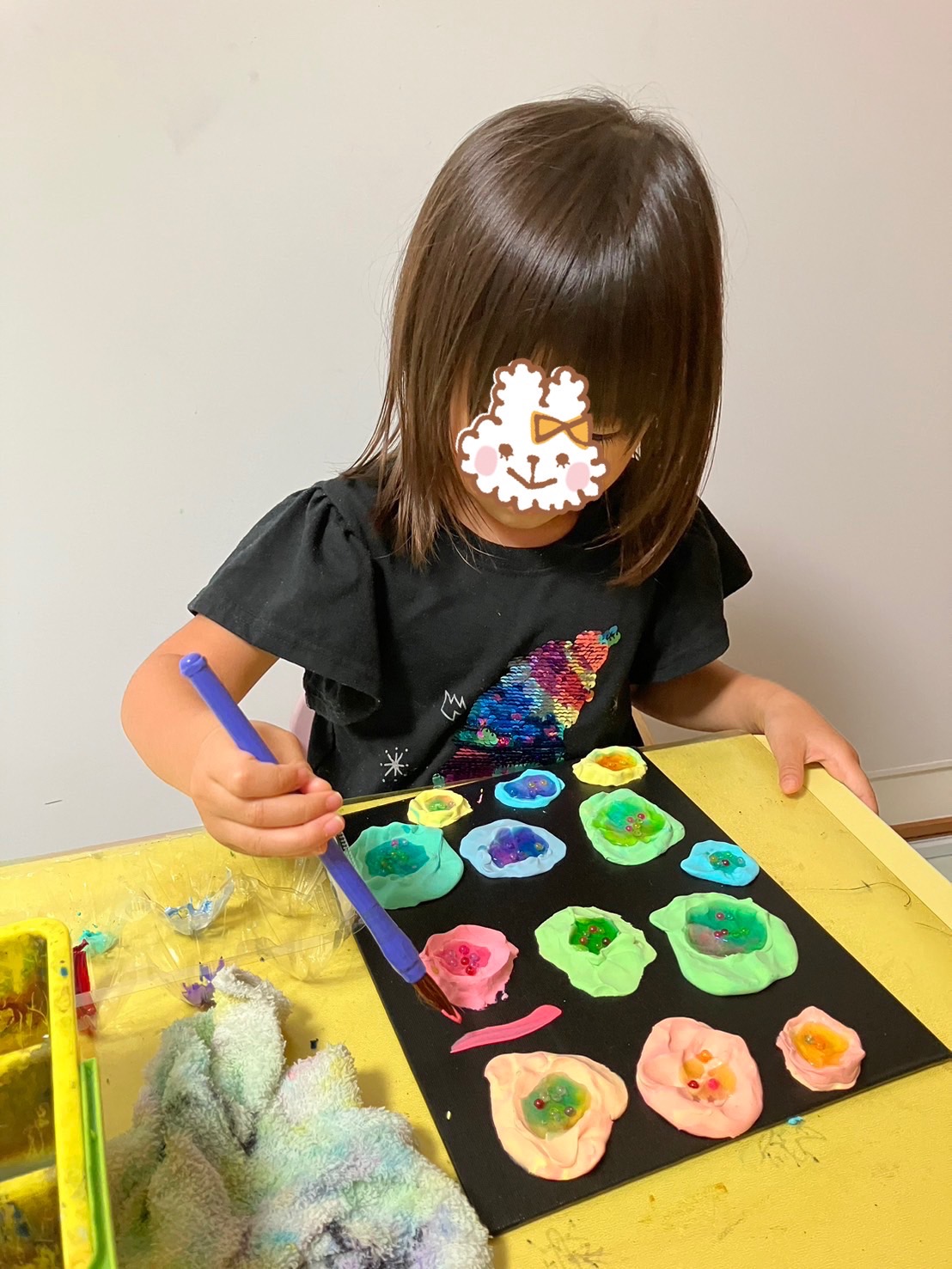 寒天の冷たい感触や、きれいな色に触れ、型抜きしてそーっと壊れないように剥がしたり、細かく切り刻んだり。。それを材料にして、四角いシートの中で飾り付けしながら一枚のアート作品を作りました✨