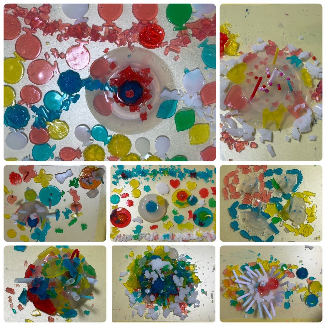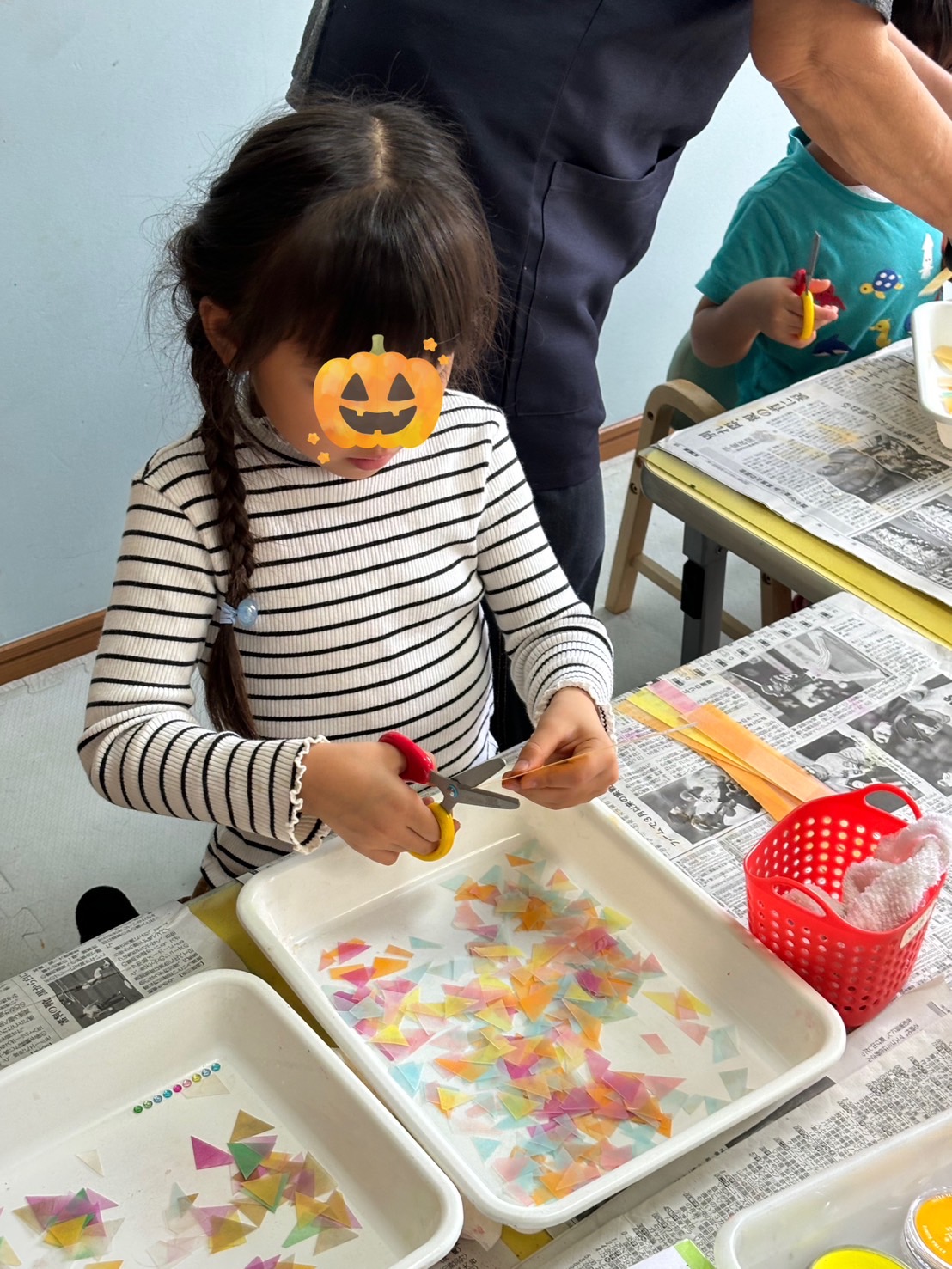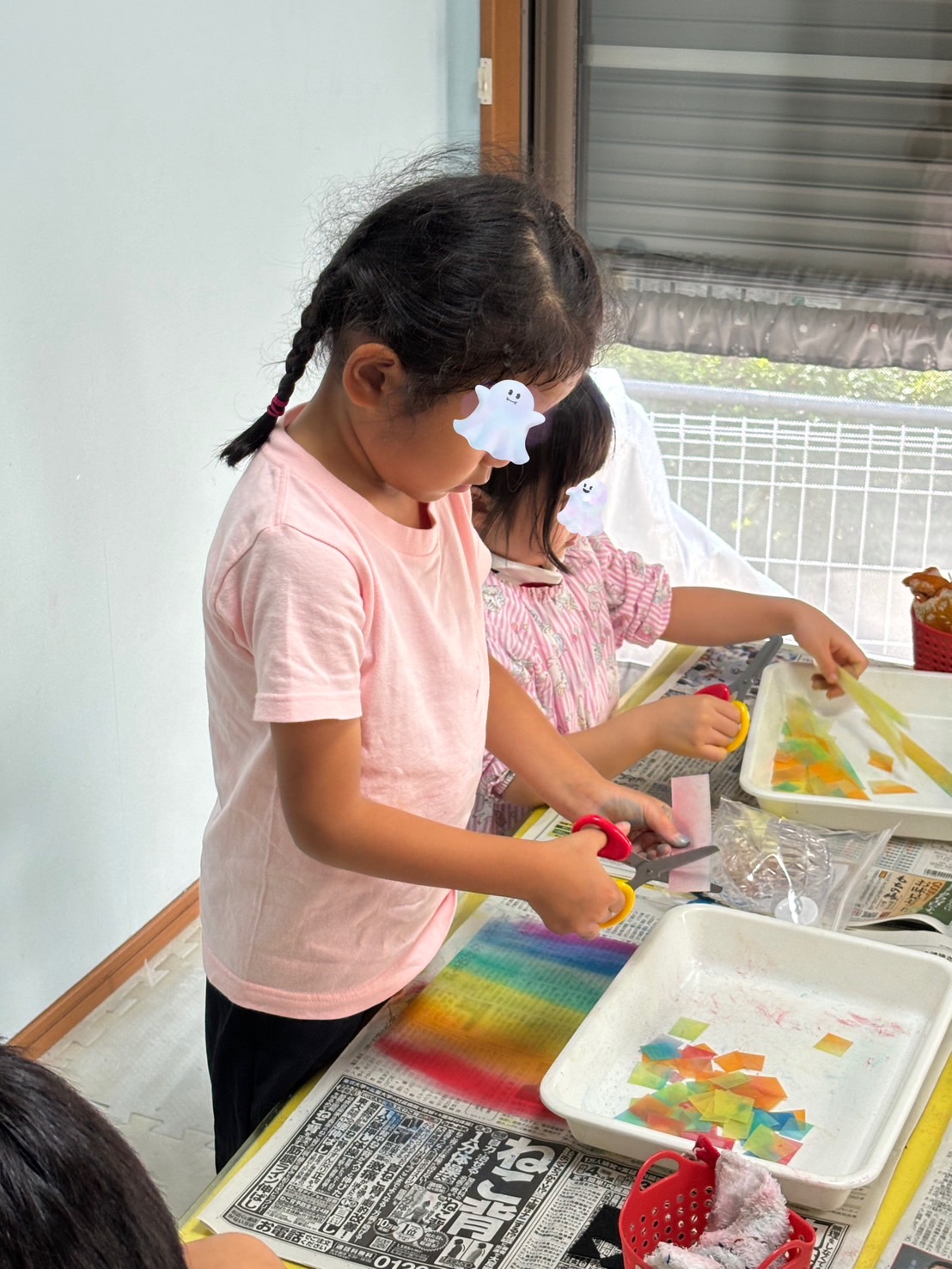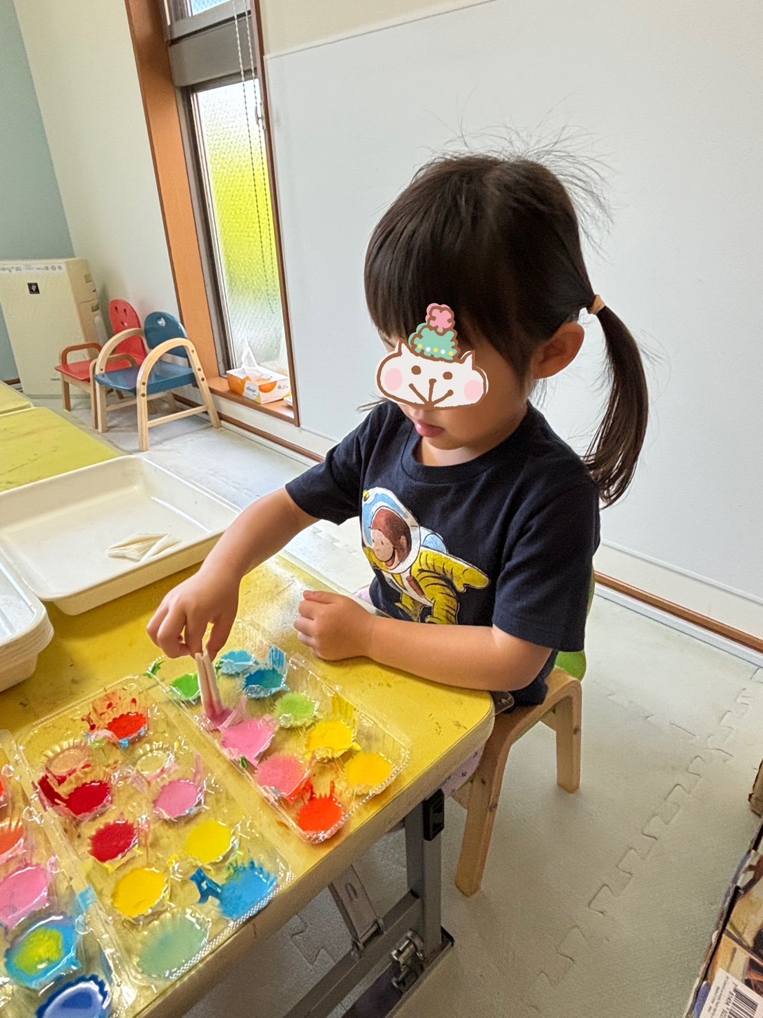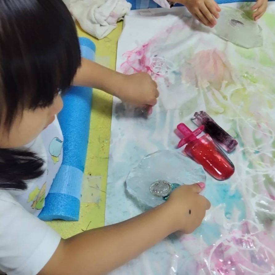 寒天の冷たい感触や、きれいな色に触れ、型抜きしてそーっと壊れないように剥がしたり、細かく切り刻んだり。。それを材料にして、四角いシートの中で飾り付けしながら一枚のアート作品を作りました✨