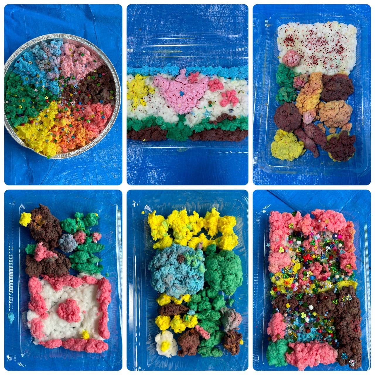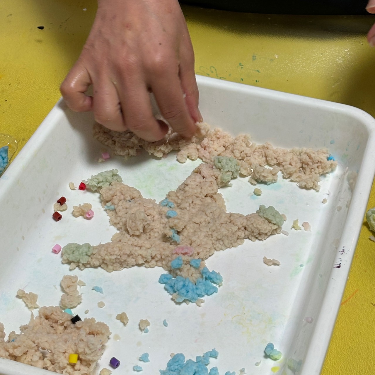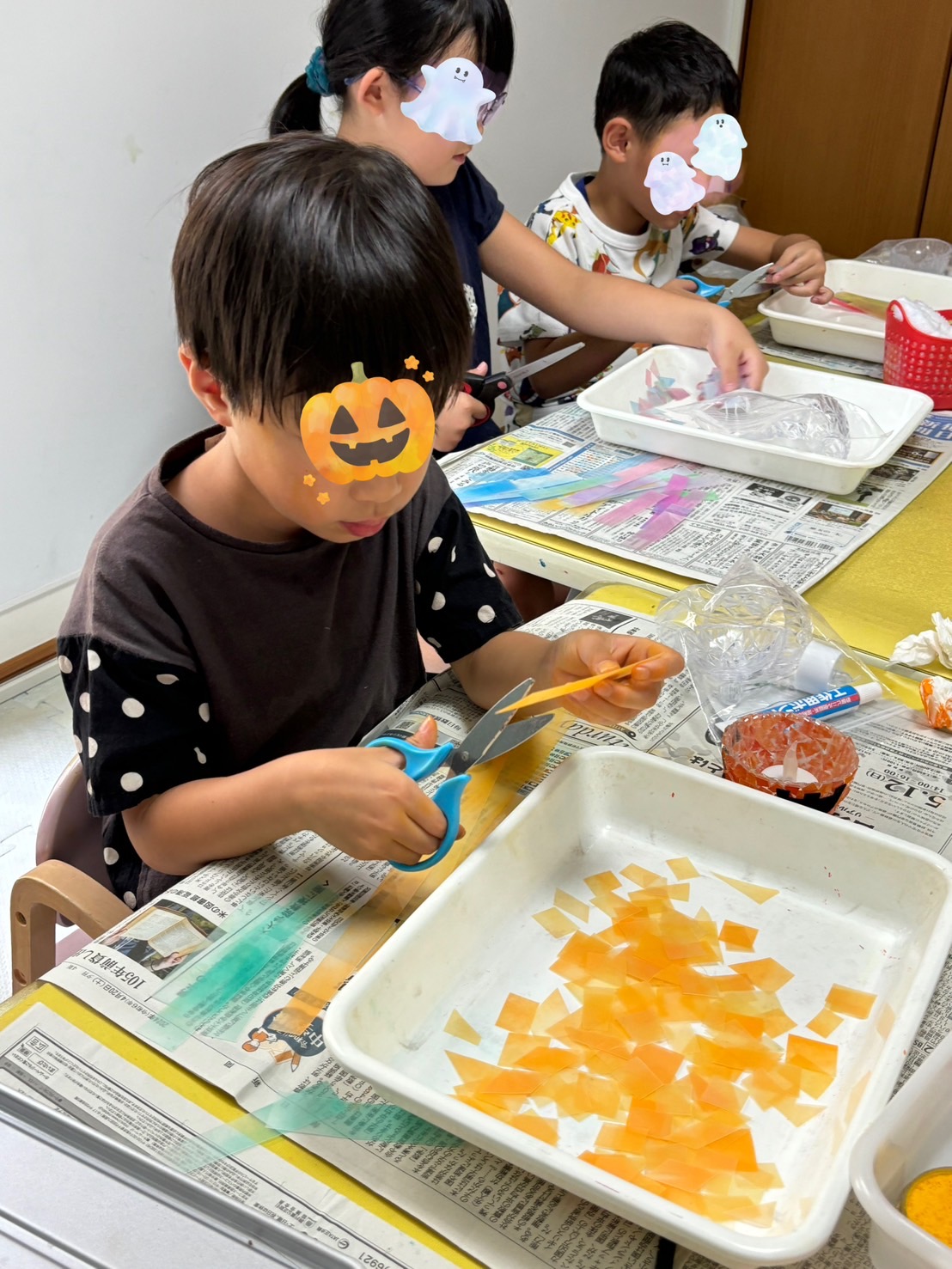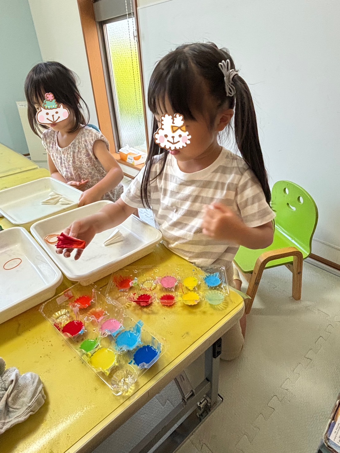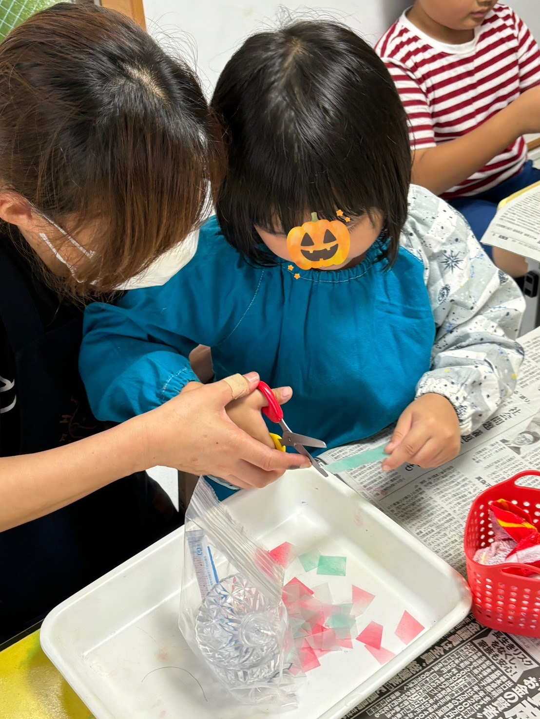 寒天の冷たい感触や、きれいな色に触れ、型抜きしてそーっと壊れないように剥がしたり、細かく切り刻んだり。。それを材料にして、四角いシートの中で飾り付けしながら一枚のアート作品を作りました✨