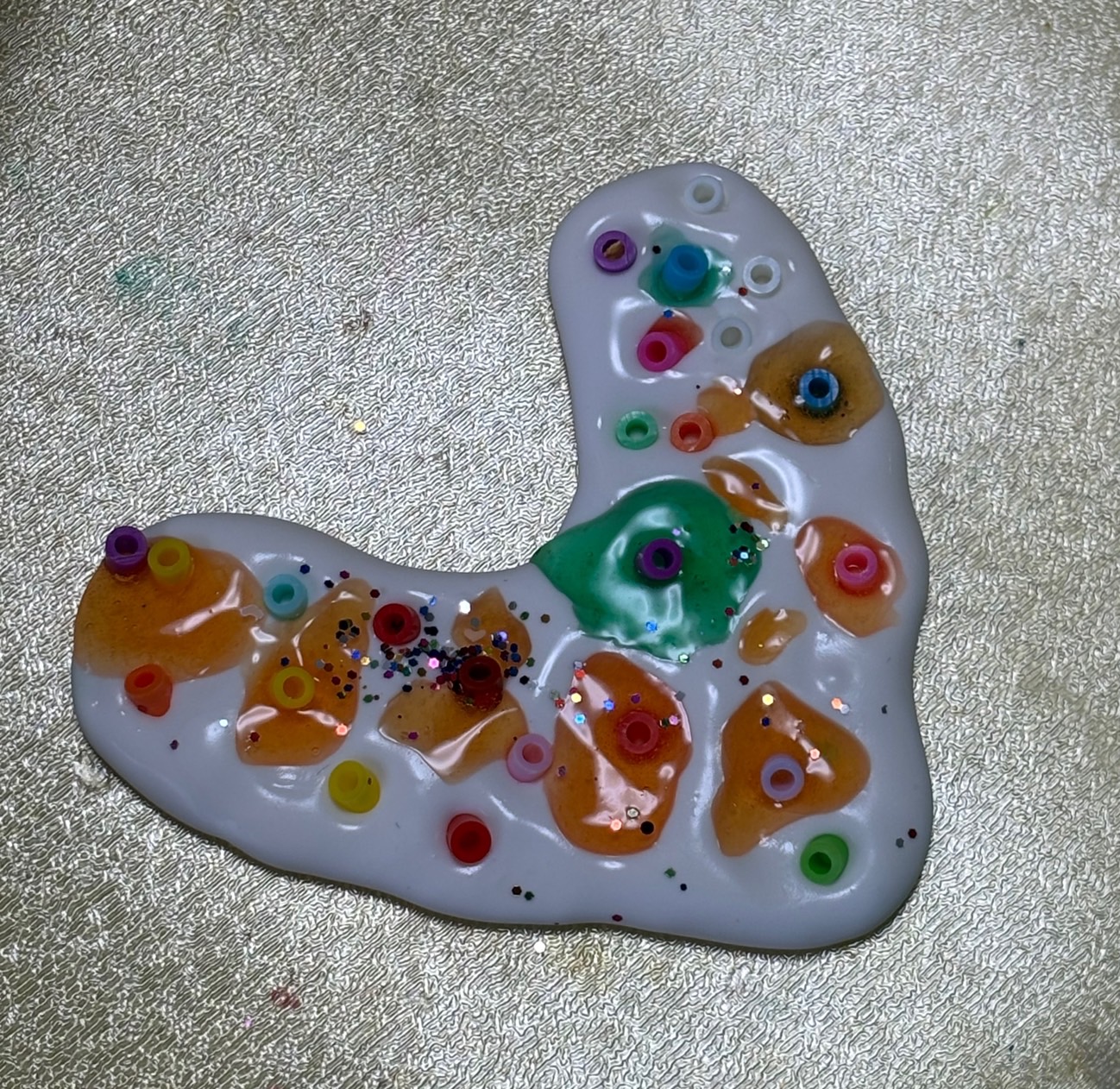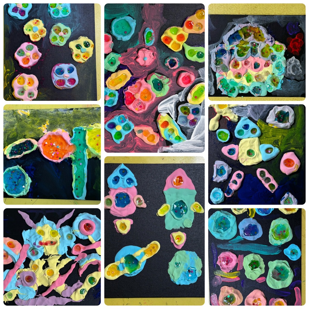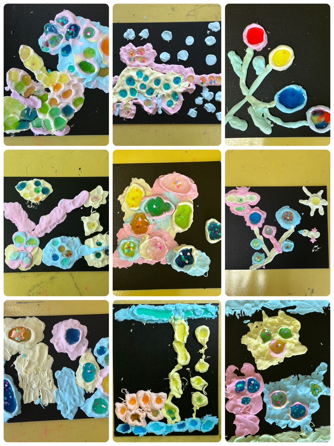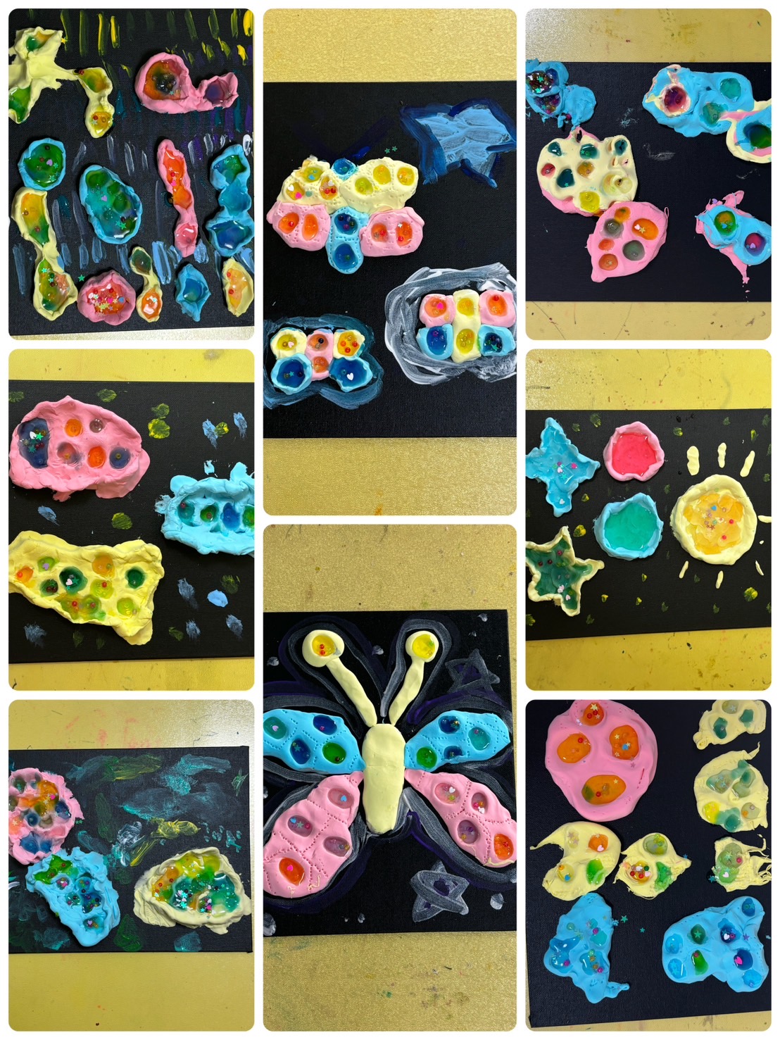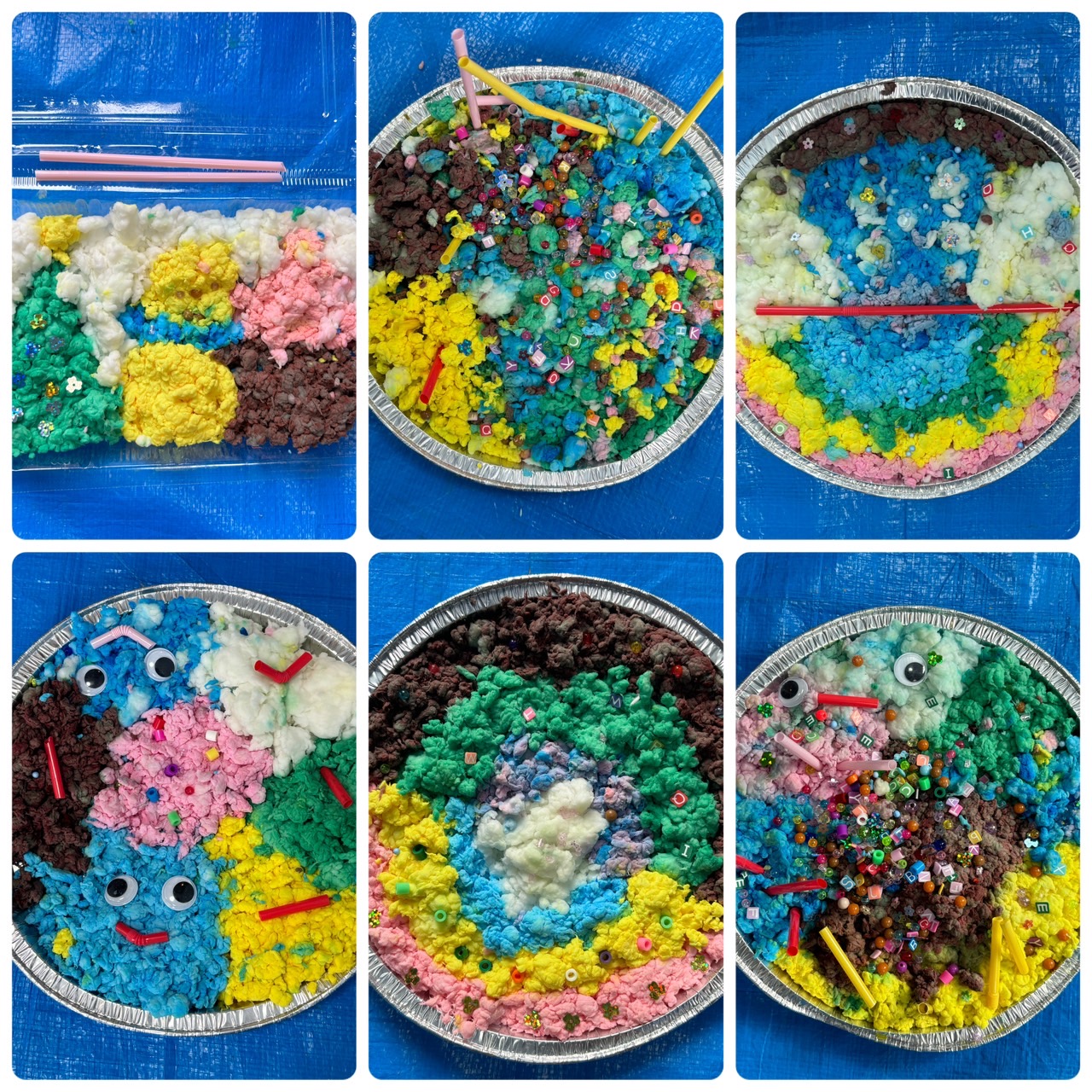 寒天の冷たい感触や、きれいな色に触れ、型抜きしてそーっと壊れないように剥がしたり、細かく切り刻んだり。。それを材料にして、四角いシートの中で飾り付けしながら一枚のアート作品を作りました✨