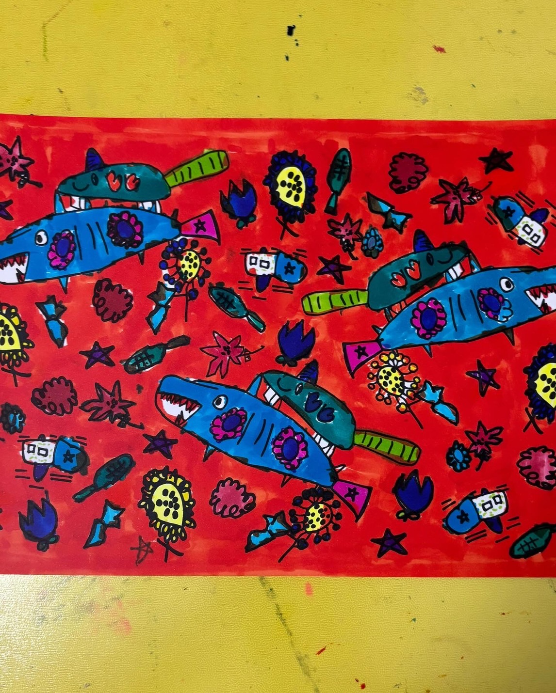 形を描いて、その中に模様を細かく描いて、さらに今回は好きに色を塗るのではなく、決まった数本の色で塗るというデザイン活動を☺️