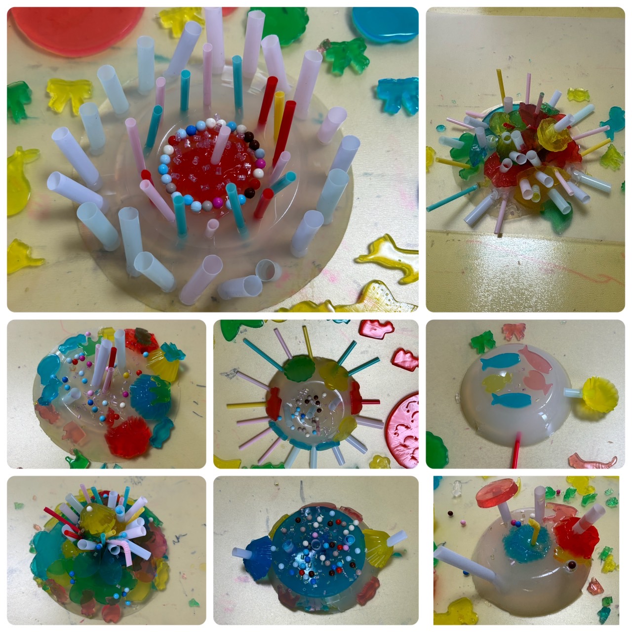 丸いお山のような寒天は、何も言わずにシートに乗せておいてみたのですが、ケーキに見立てたり、海に浮かぶ岩に見立てたりと、みんな好きなようにイメージを膨らませて飾り付けしていました✨
