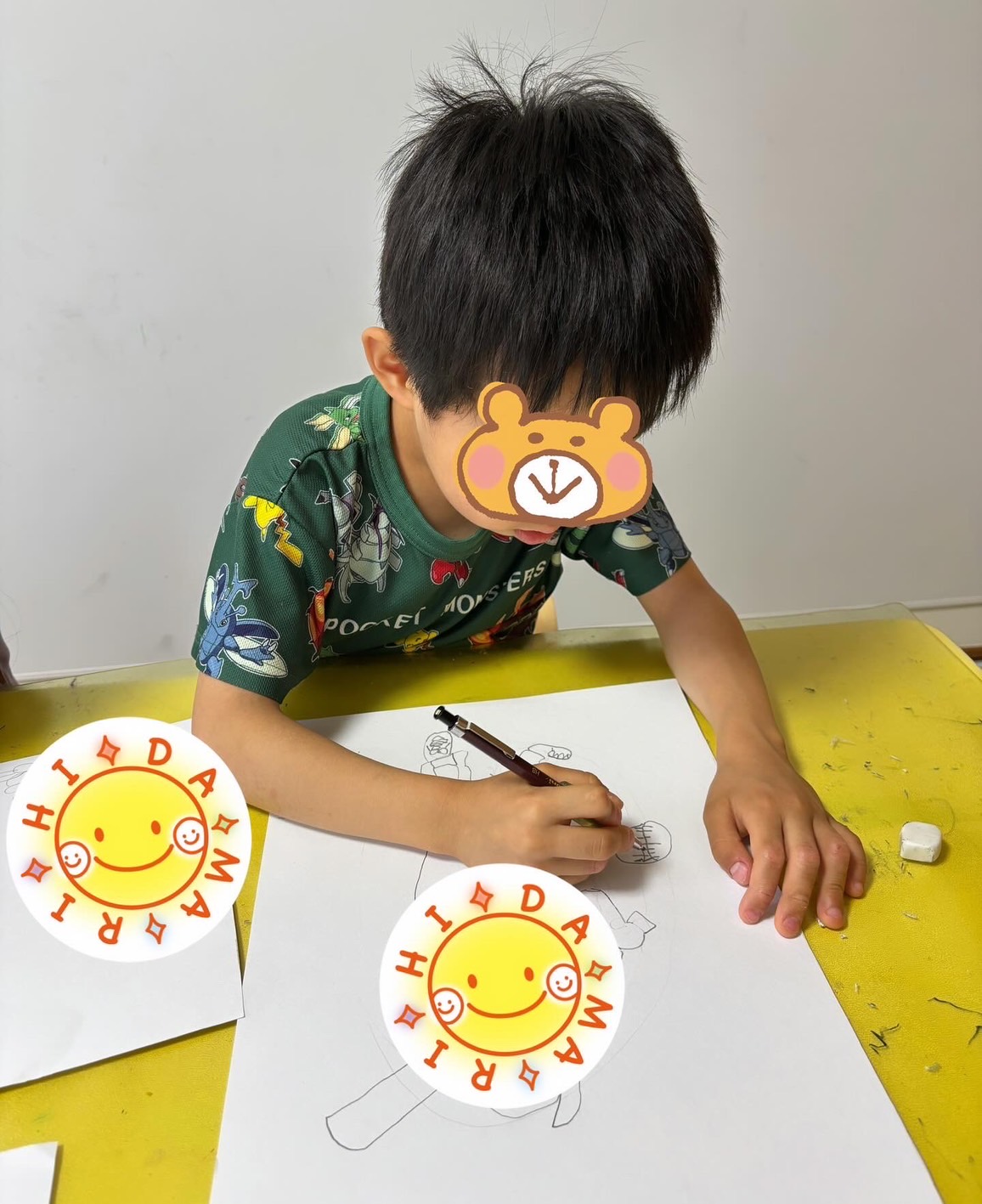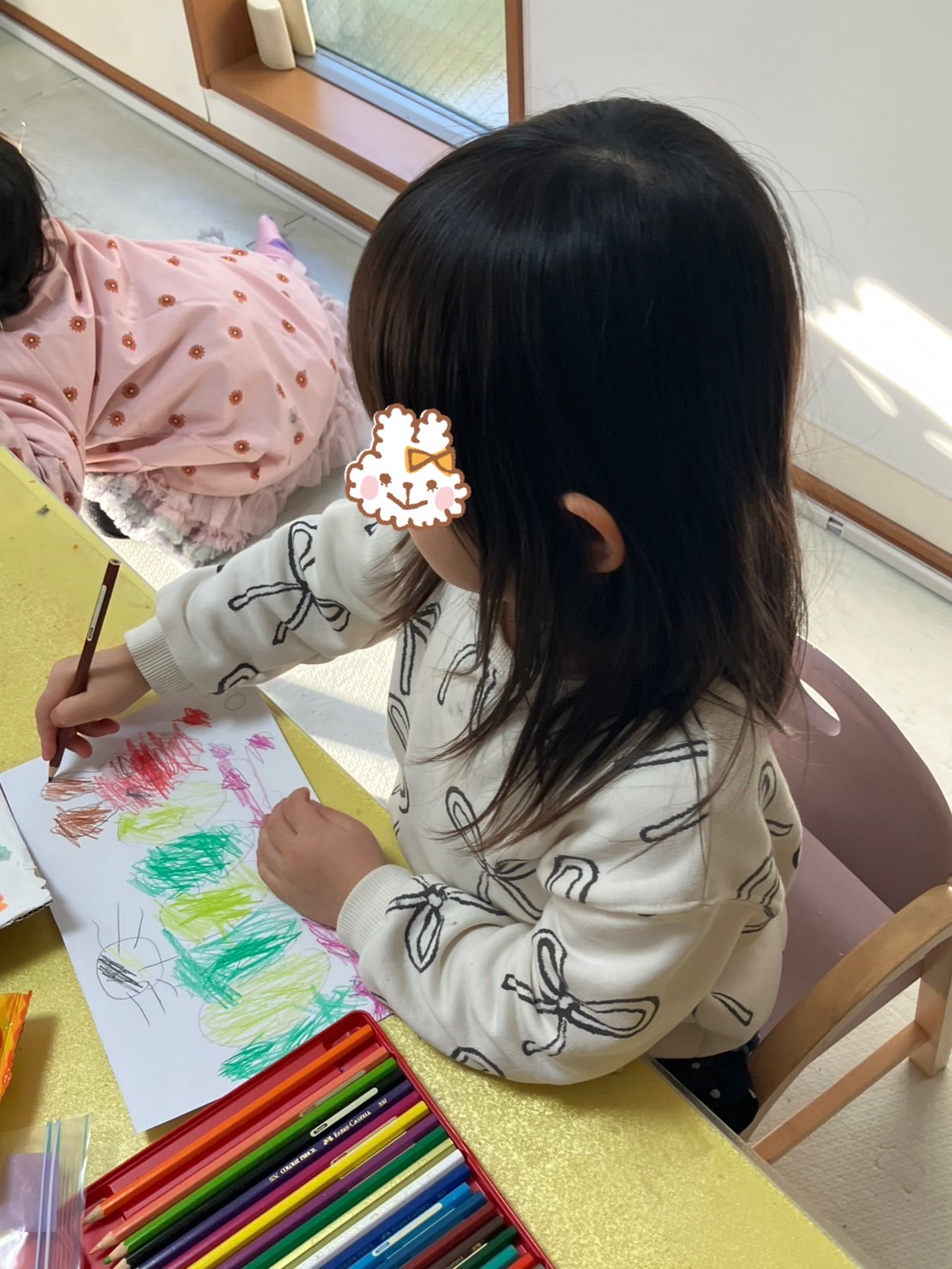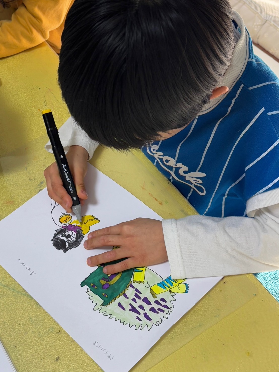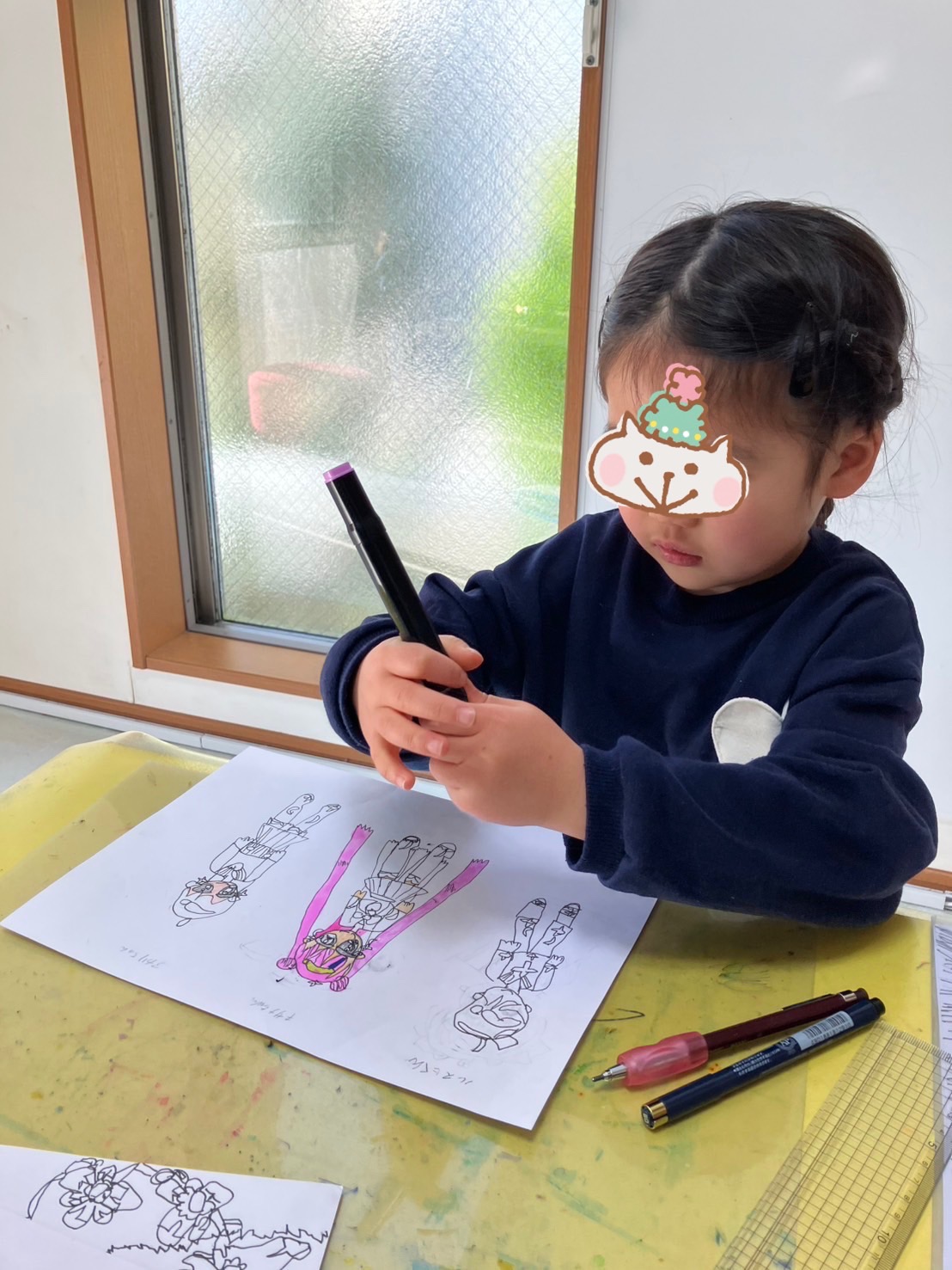 ゴールデンウィーク後に、もう一案テーマを考えてきました!もう一度書き直したい!と言う子もいたり、人の体の部分の絵を何度も何度も書き直して、どんどん形がうまくとれるようになる子もいたり、お友達の絵が気になって、こっそり観察する子もいたり、みんな良い刺激を与えながら成長している姿が、とても素敵でした✨