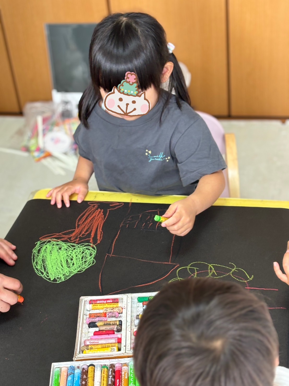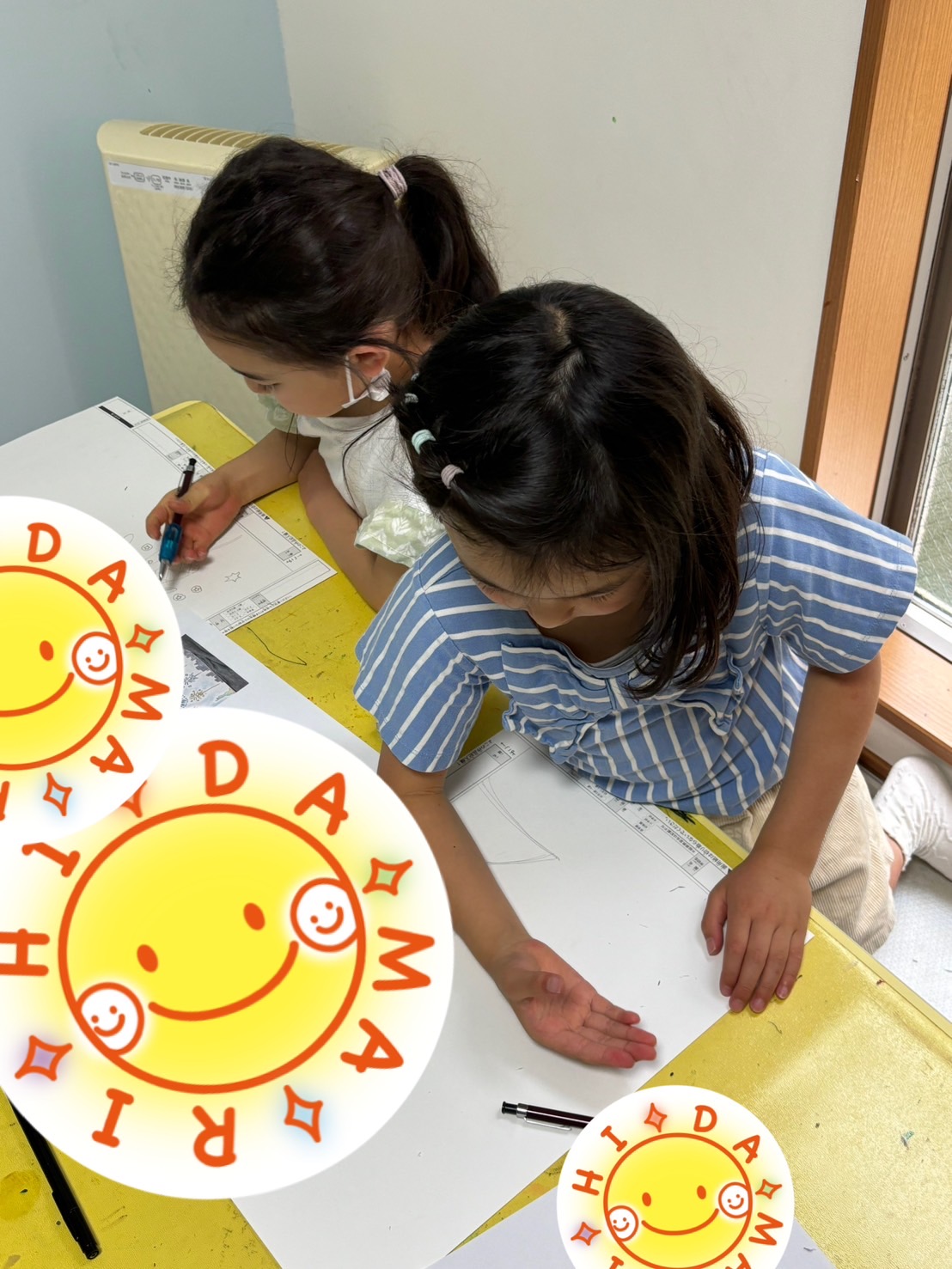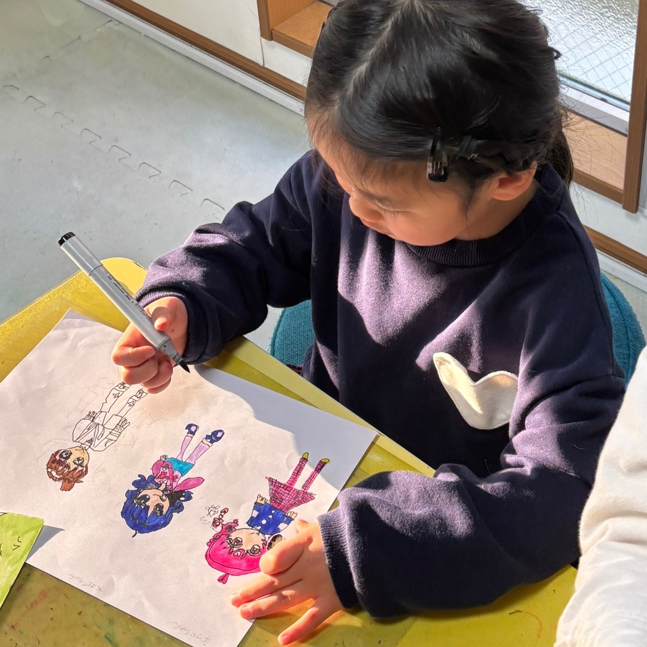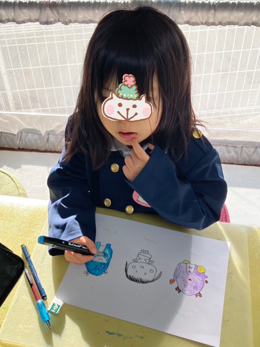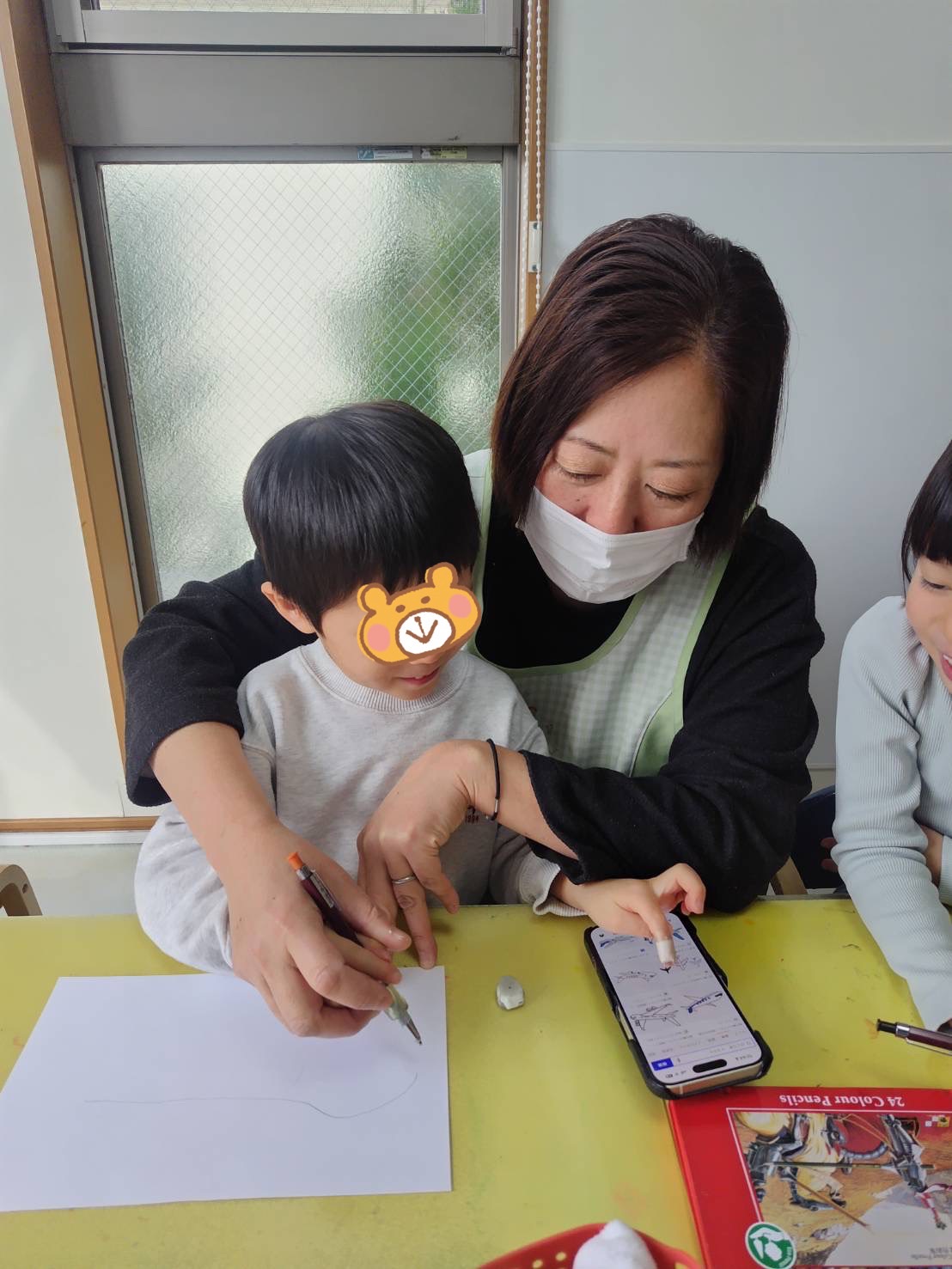ゴールデンウィーク後に、もう一案テーマを考えてきました!もう一度書き直したい!と言う子もいたり、人の体の部分の絵を何度も何度も書き直して、どんどん形がうまくとれるようになる子もいたり、お友達の絵が気になって、こっそり観察する子もいたり、みんな良い刺激を与えながら成長している姿が、とても素敵でした✨