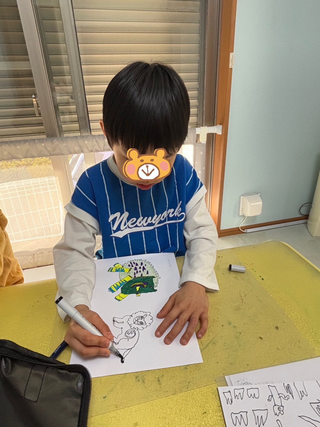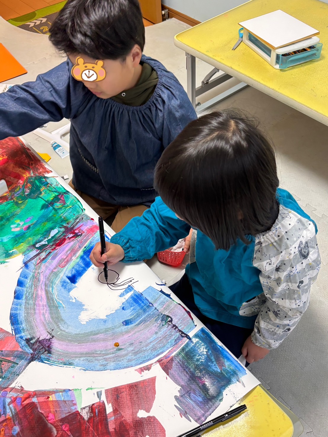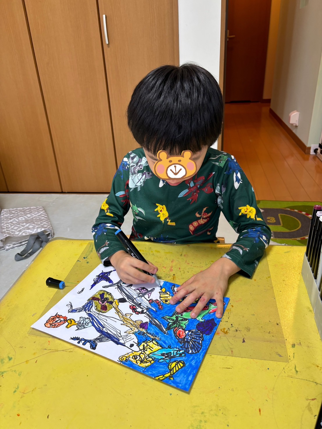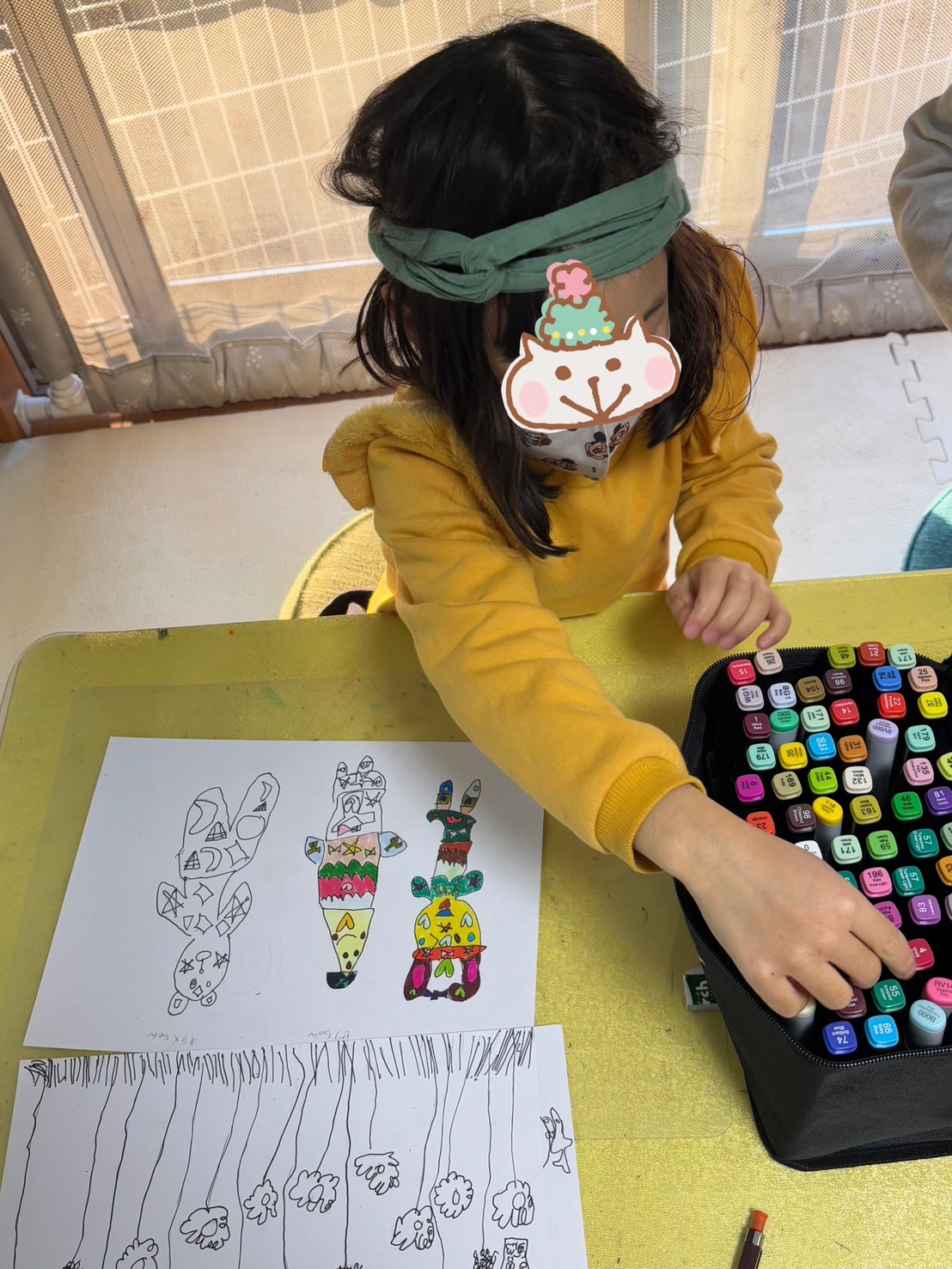 ゴールデンウィーク後に、もう一案テーマを考えてきました!もう一度書き直したい!と言う子もいたり、人の体の部分の絵を何度も何度も書き直して、どんどん形がうまくとれるようになる子もいたり、お友達の絵が気になって、こっそり観察する子もいたり、みんな良い刺激を与えながら成長している姿が、とても素敵でした✨