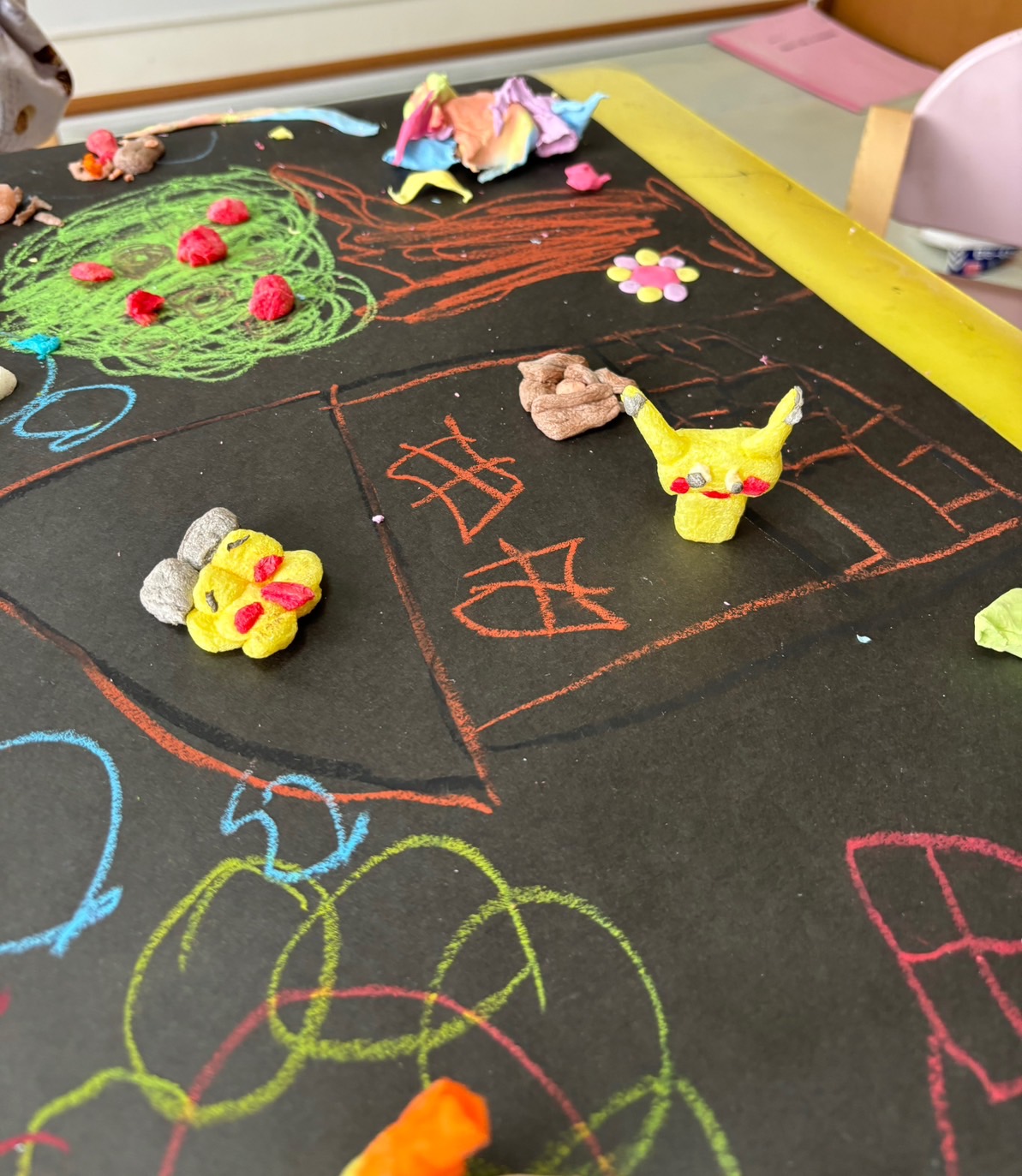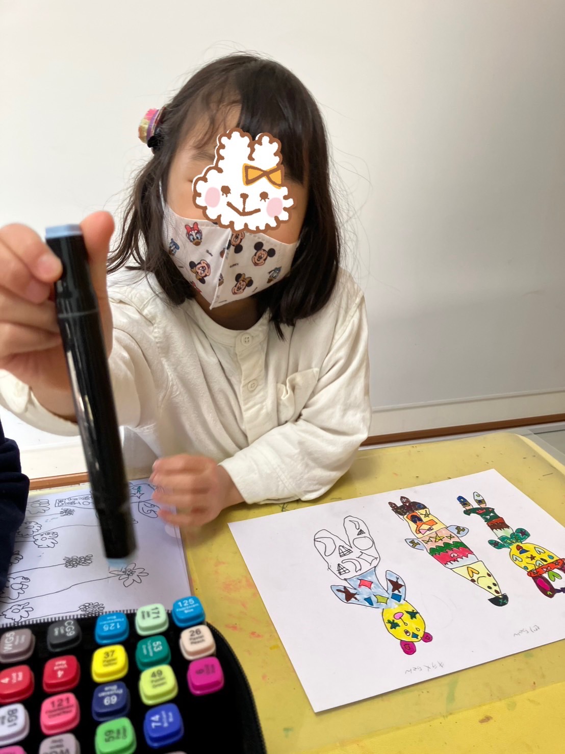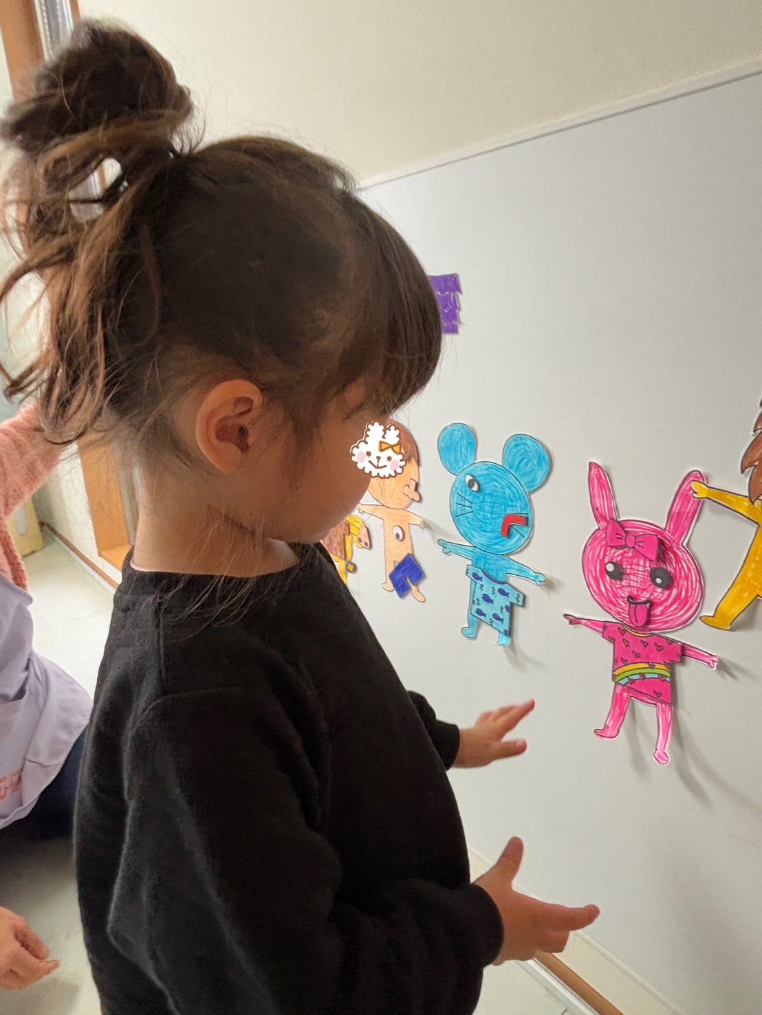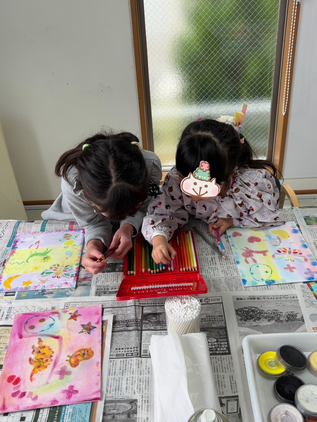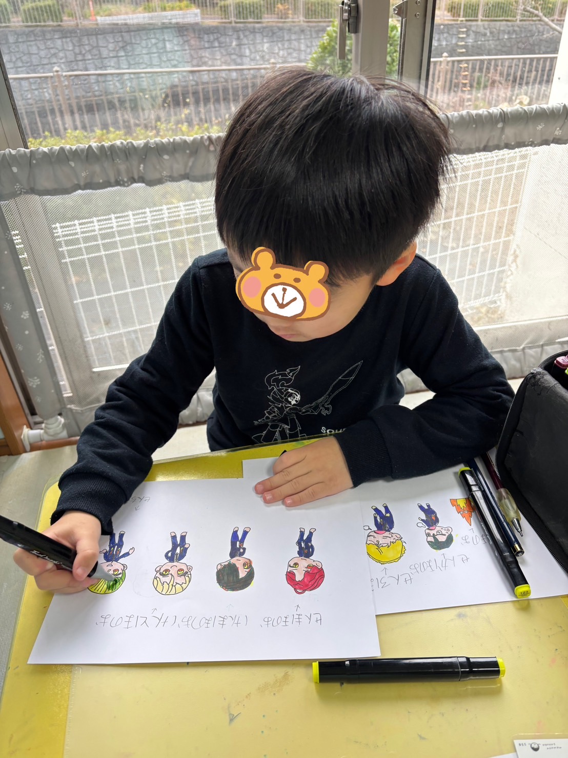 ゴールデンウィーク後に、もう一案テーマを考えてきました!もう一度書き直したい!と言う子もいたり、人の体の部分の絵を何度も何度も書き直して、どんどん形がうまくとれるようになる子もいたり、お友達の絵が気になって、こっそり観察する子もいたり、みんな良い刺激を与えながら成長している姿が、とても素敵でした✨