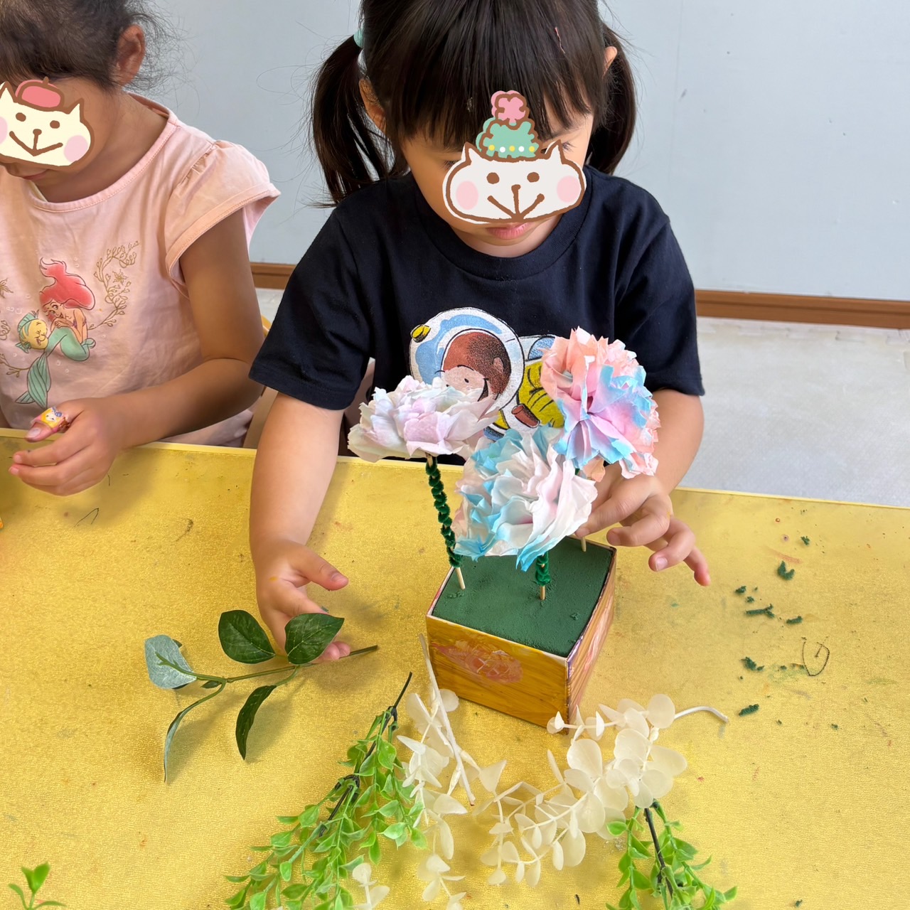 お花をつくるだけではなく、鉢植えに色を塗ったり、いろいろな葉っぱをお花に合わせていけてみたり。。