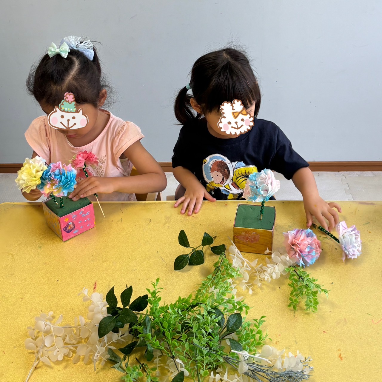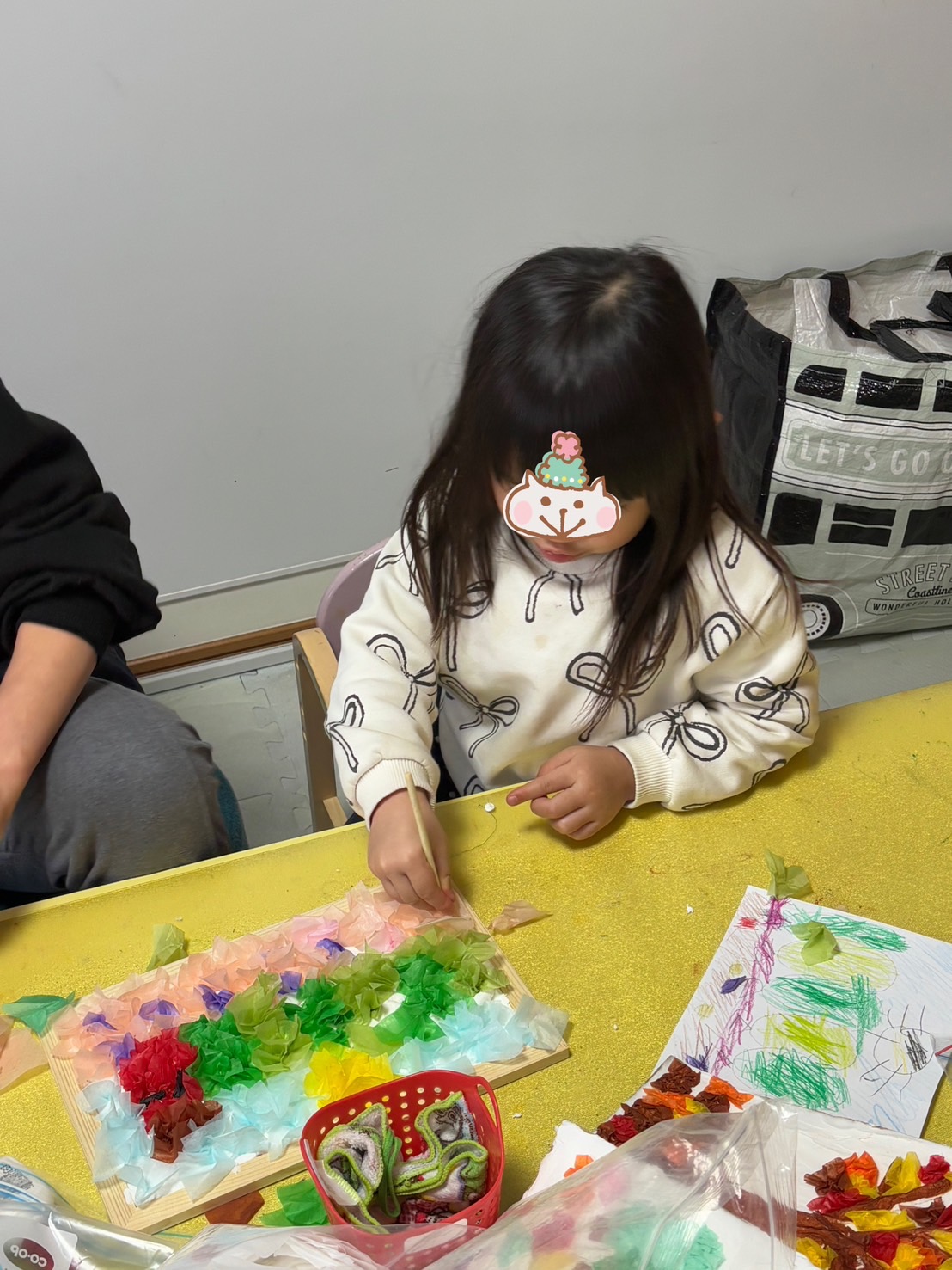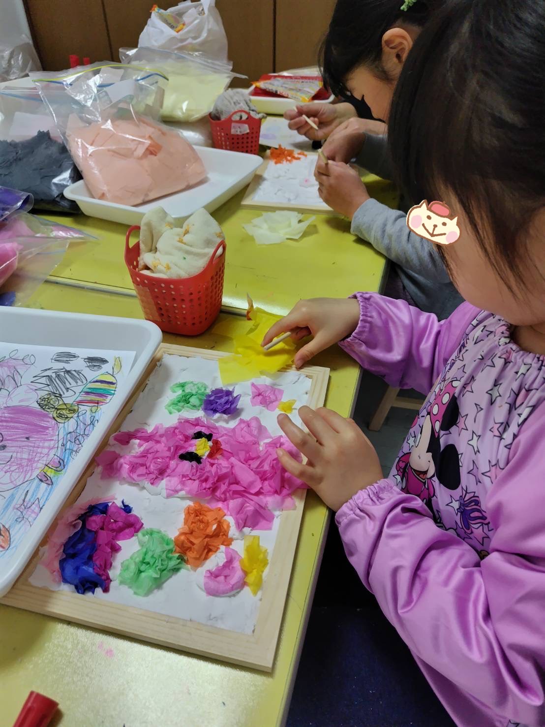今月のキッズアートワークショップでは、花紙差し込みアートを✨
