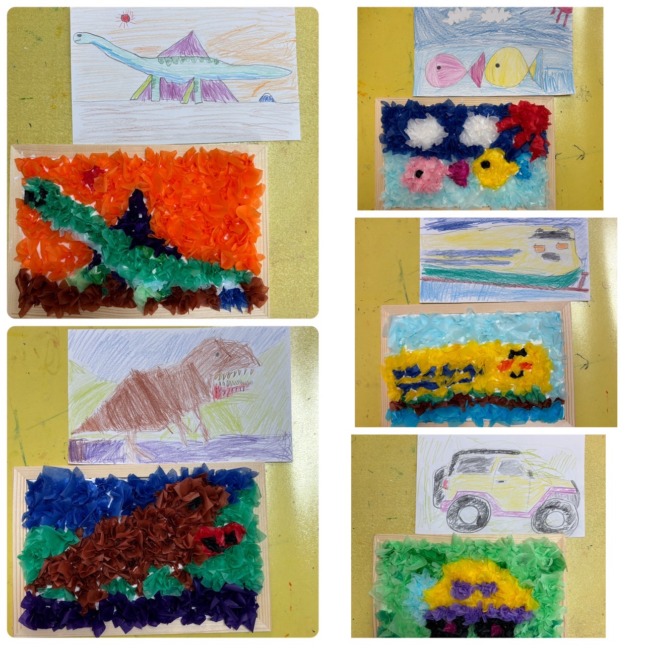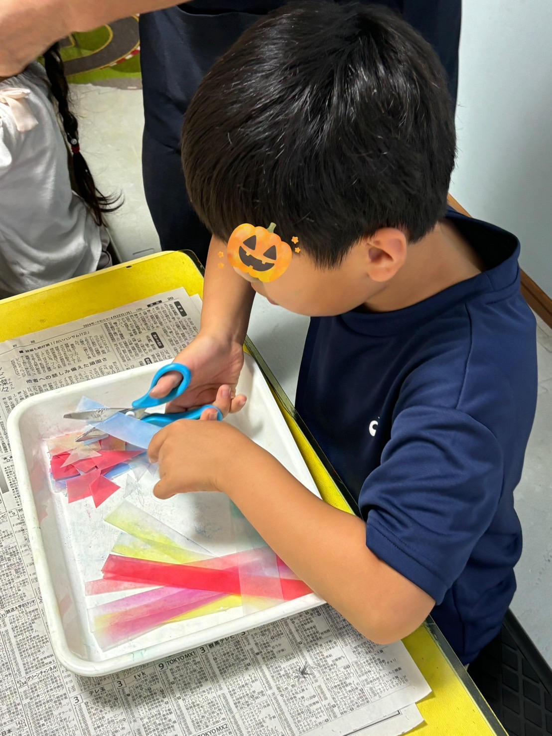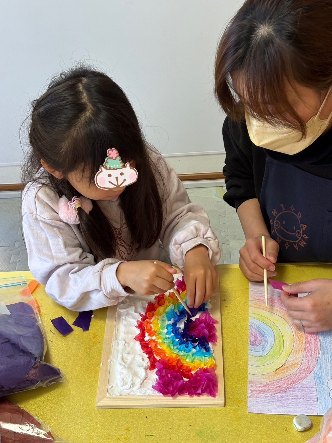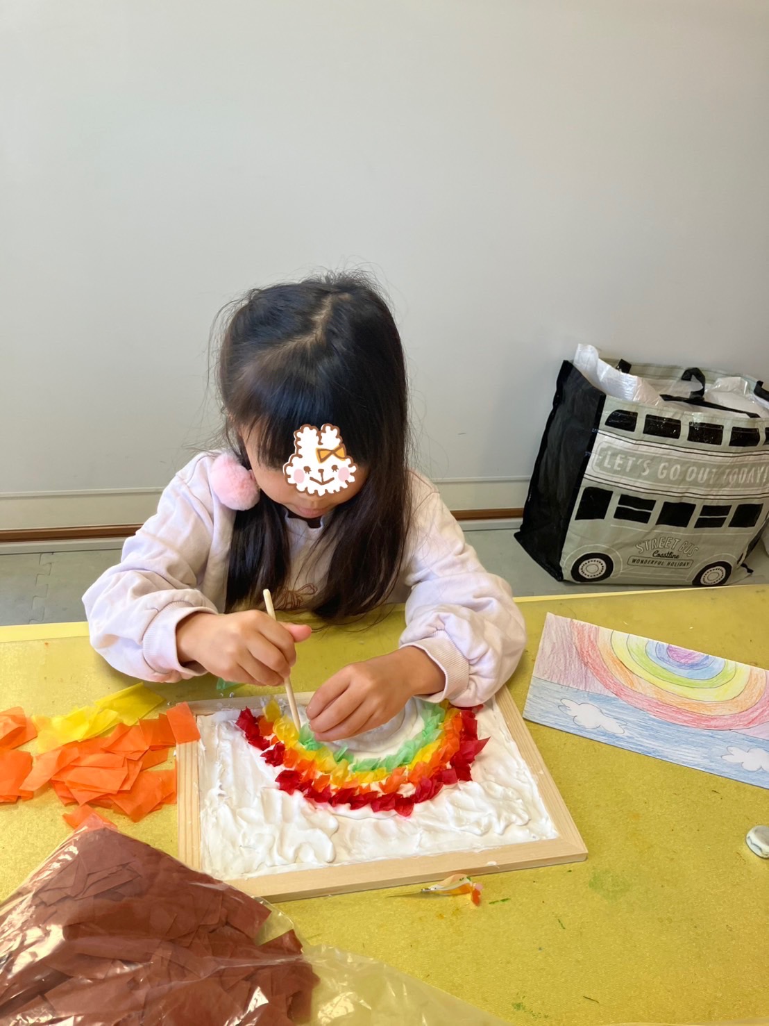 今月のキッズアートワークショップでは、花紙差し込みアートを✨