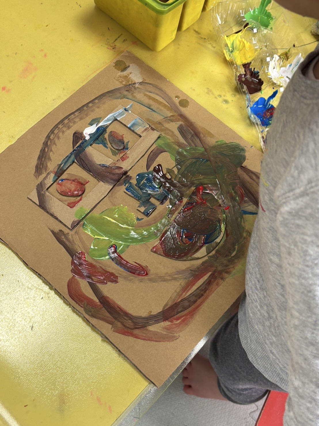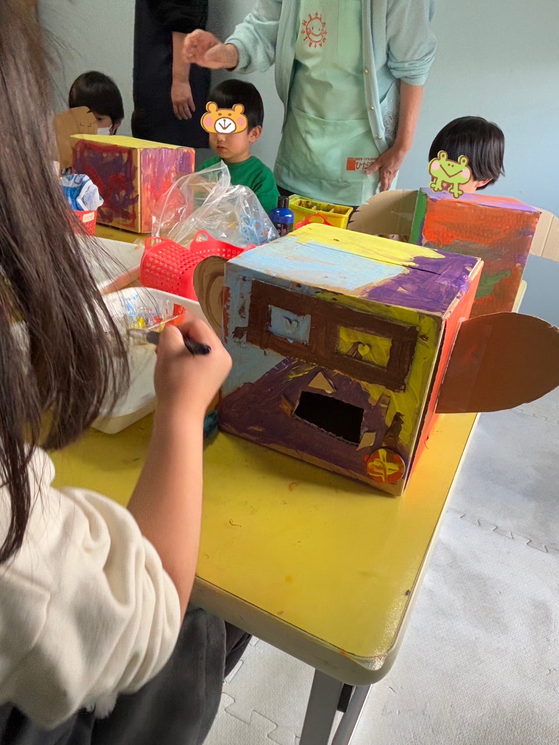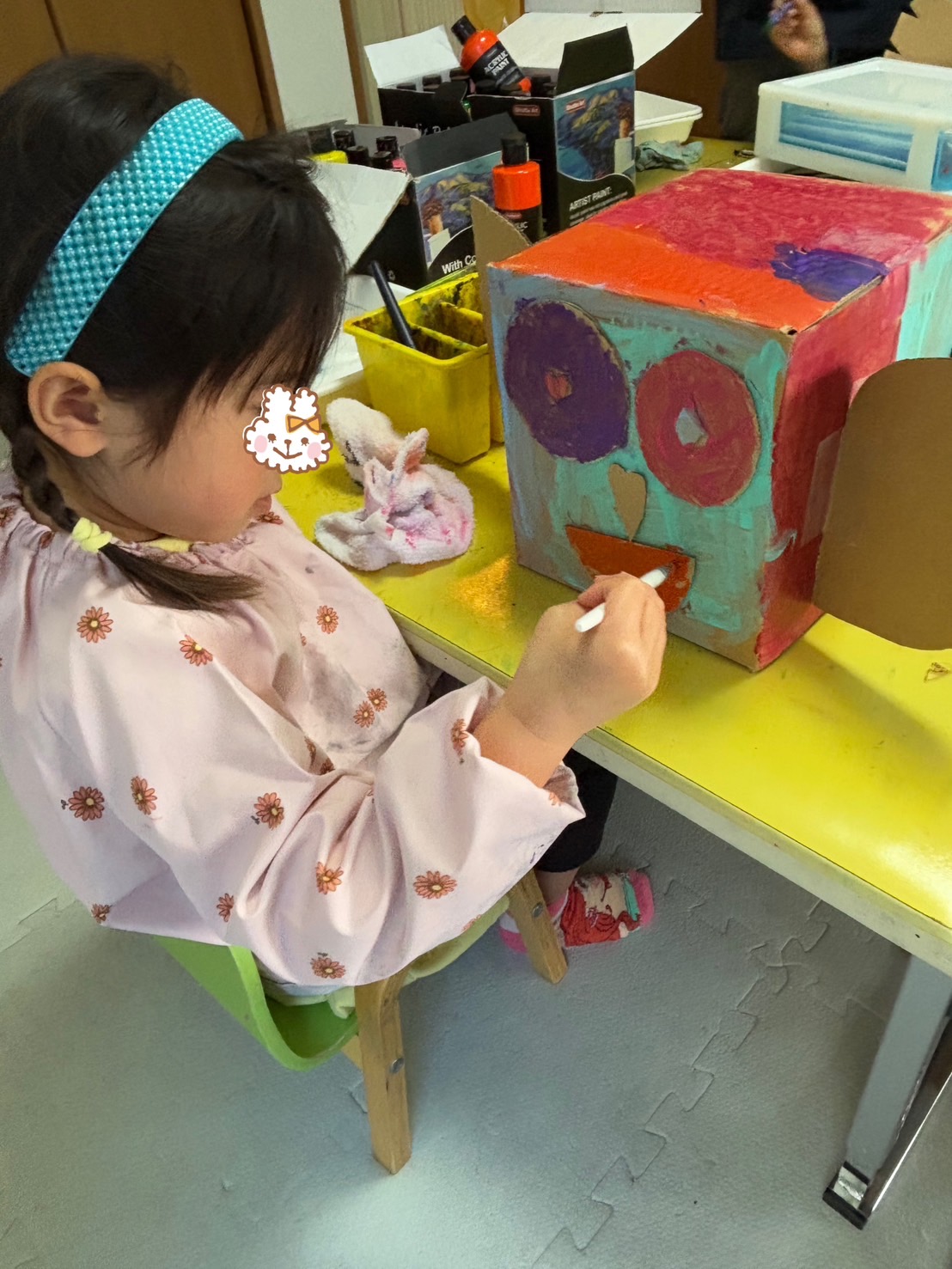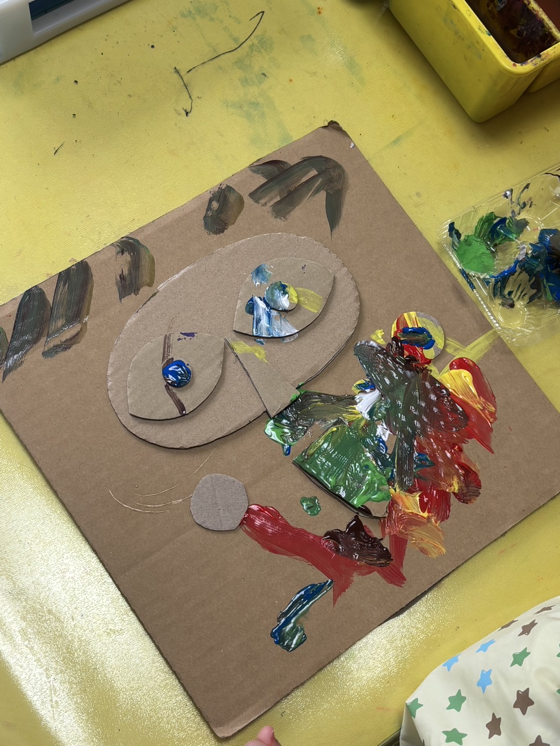 ダンボールで作ったお顔に絵の具で色を塗りました✨